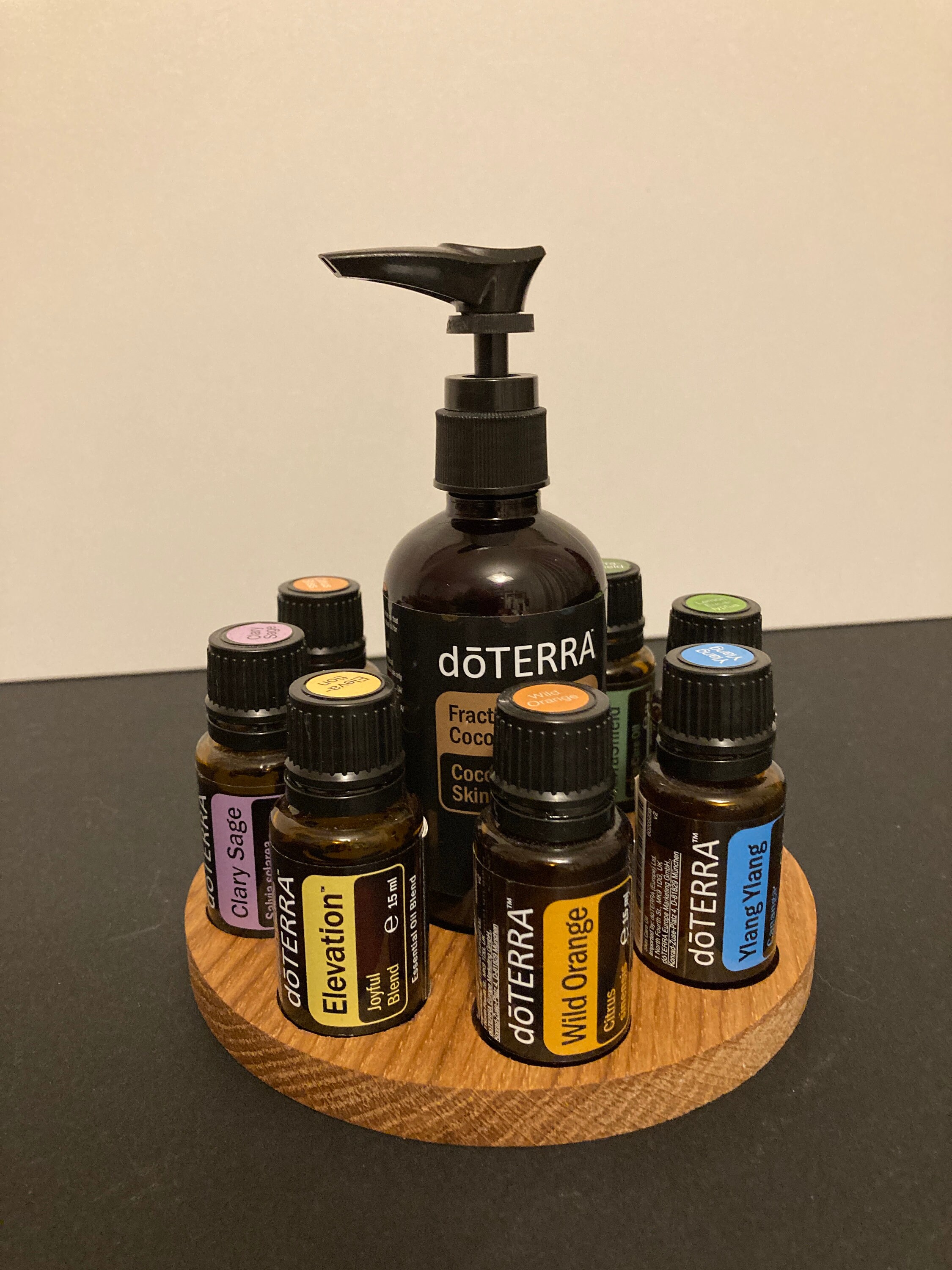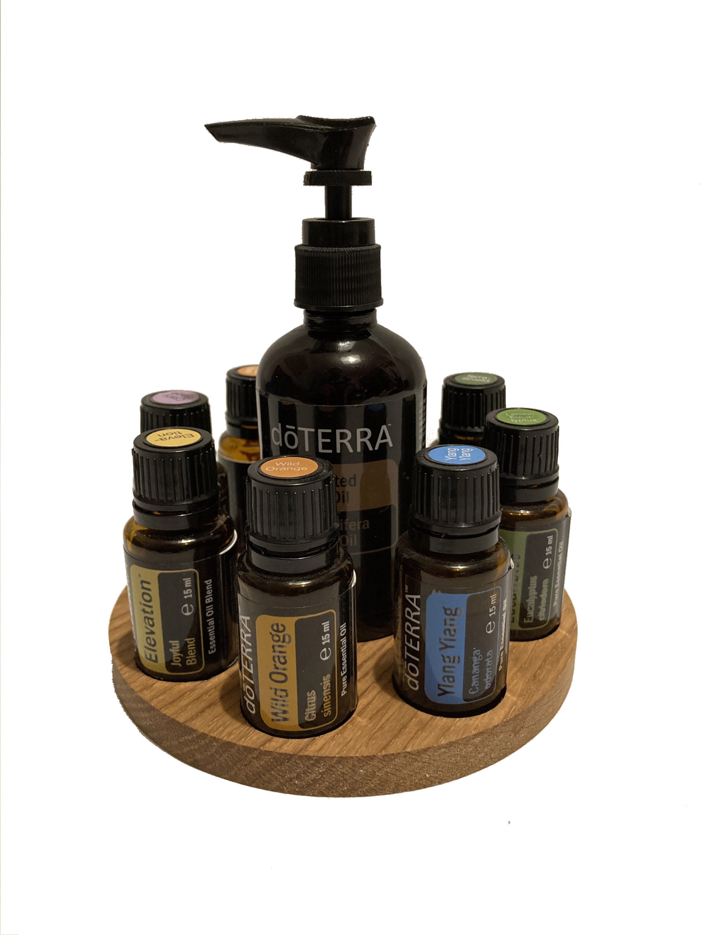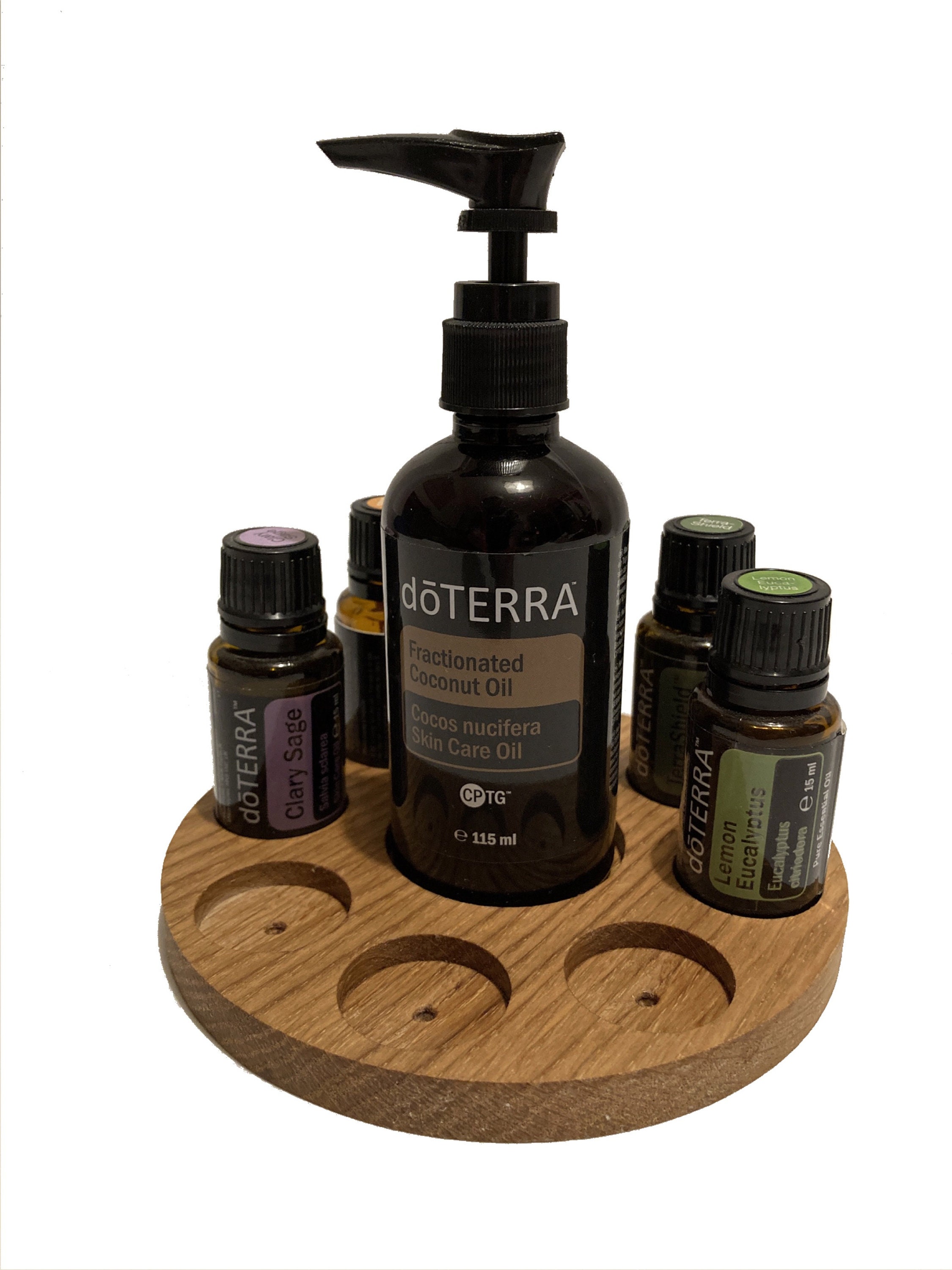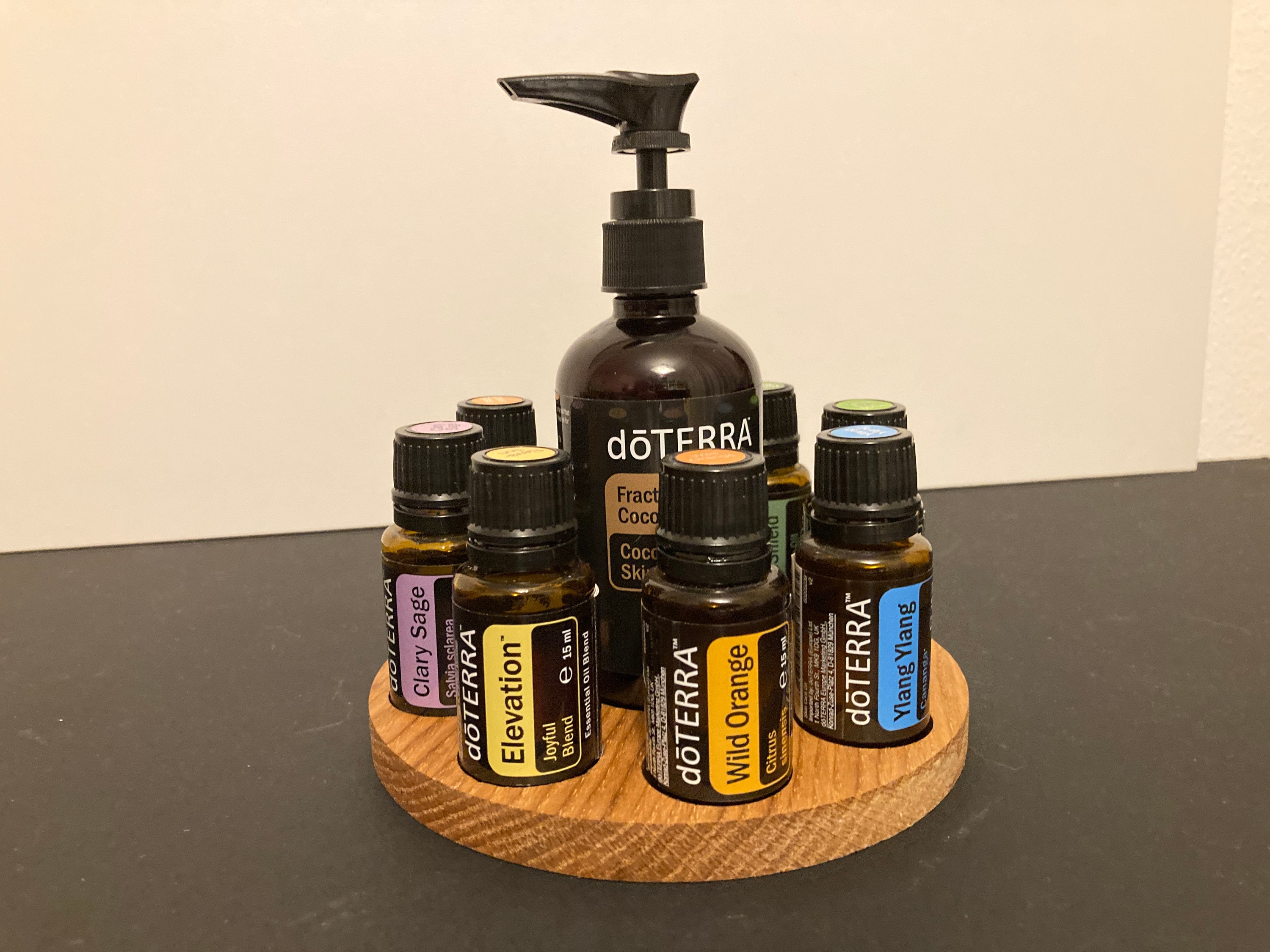 This display is ideal for anyone who uses oils with a 15ml bottle content and a fractionated coconut oil for the production of the AromaTouch® technique. It has space for the 8 oil bottles (diameter 28 mm) and the fractionated coconut oil (diameter 50 mm). The round arrangement means you can easily read each label. The holes for the 8 bottles are evenly distributed across the entire diameter. This improves handling and overview, and also looks incredibly chic and elegant.