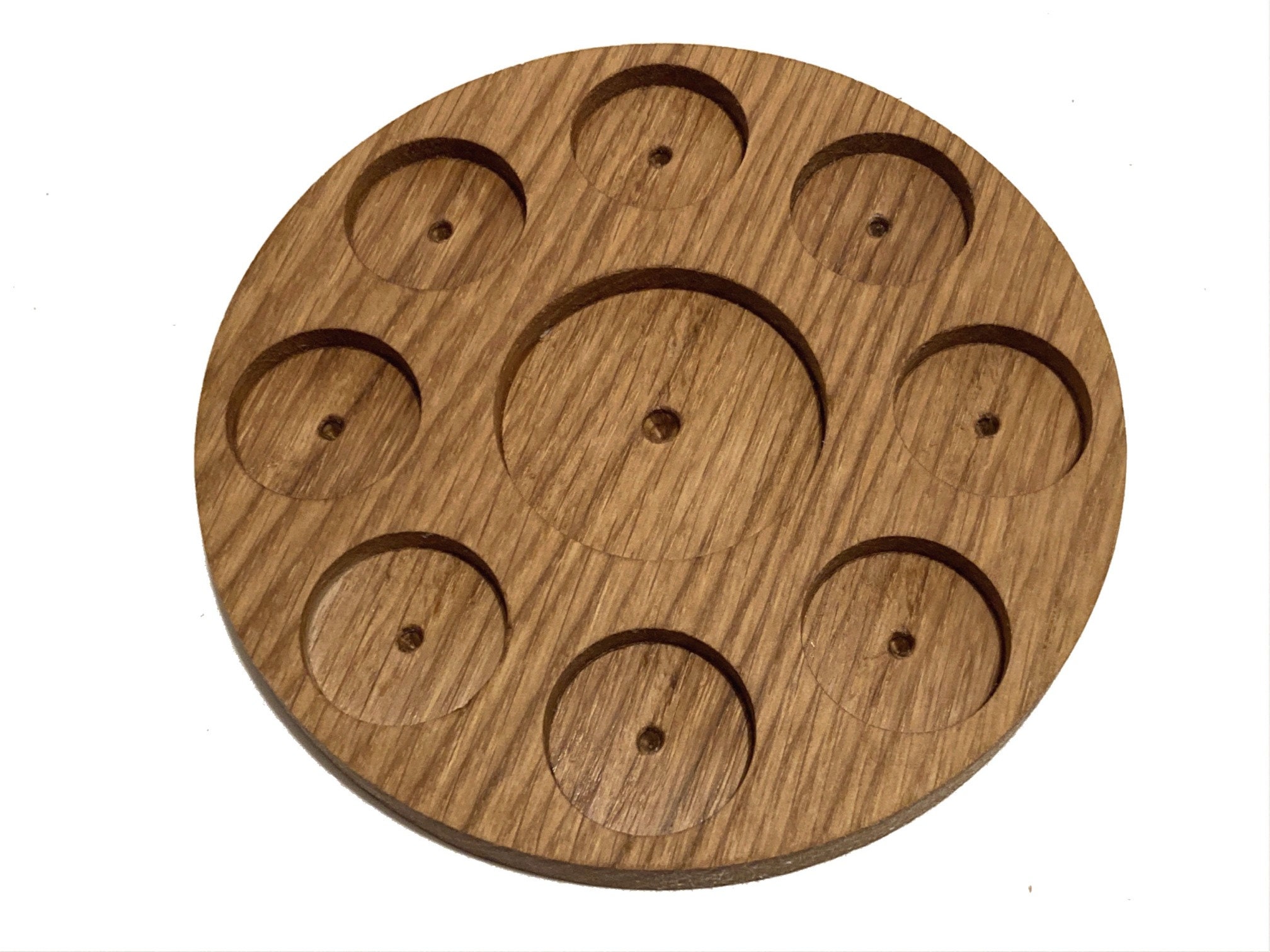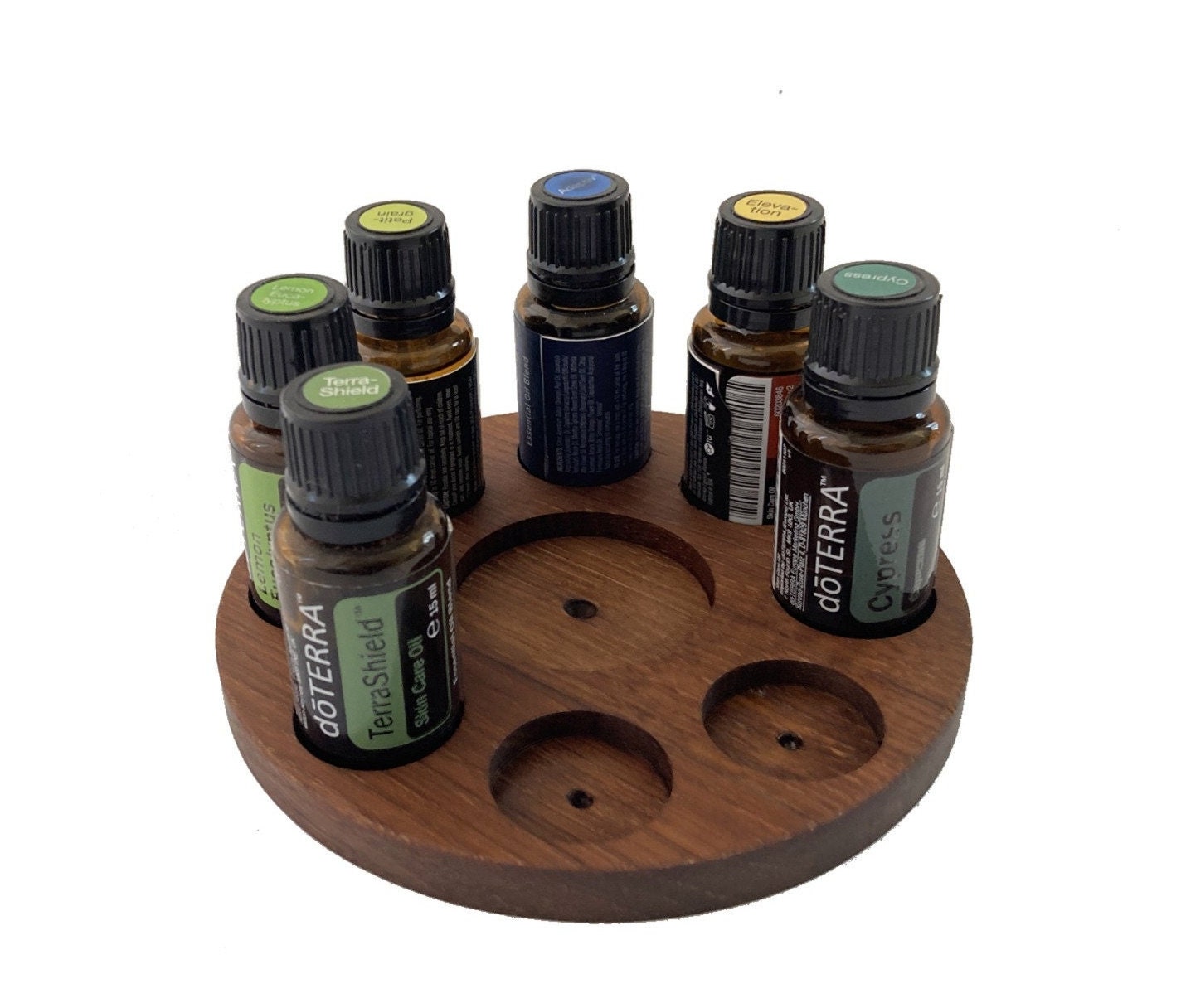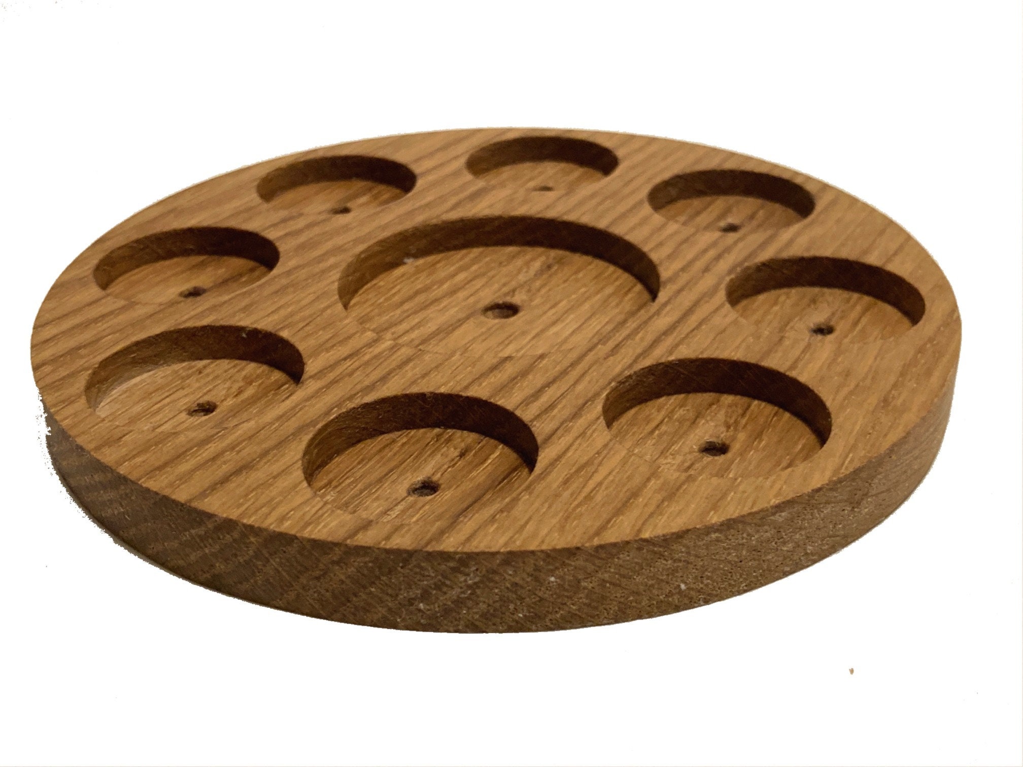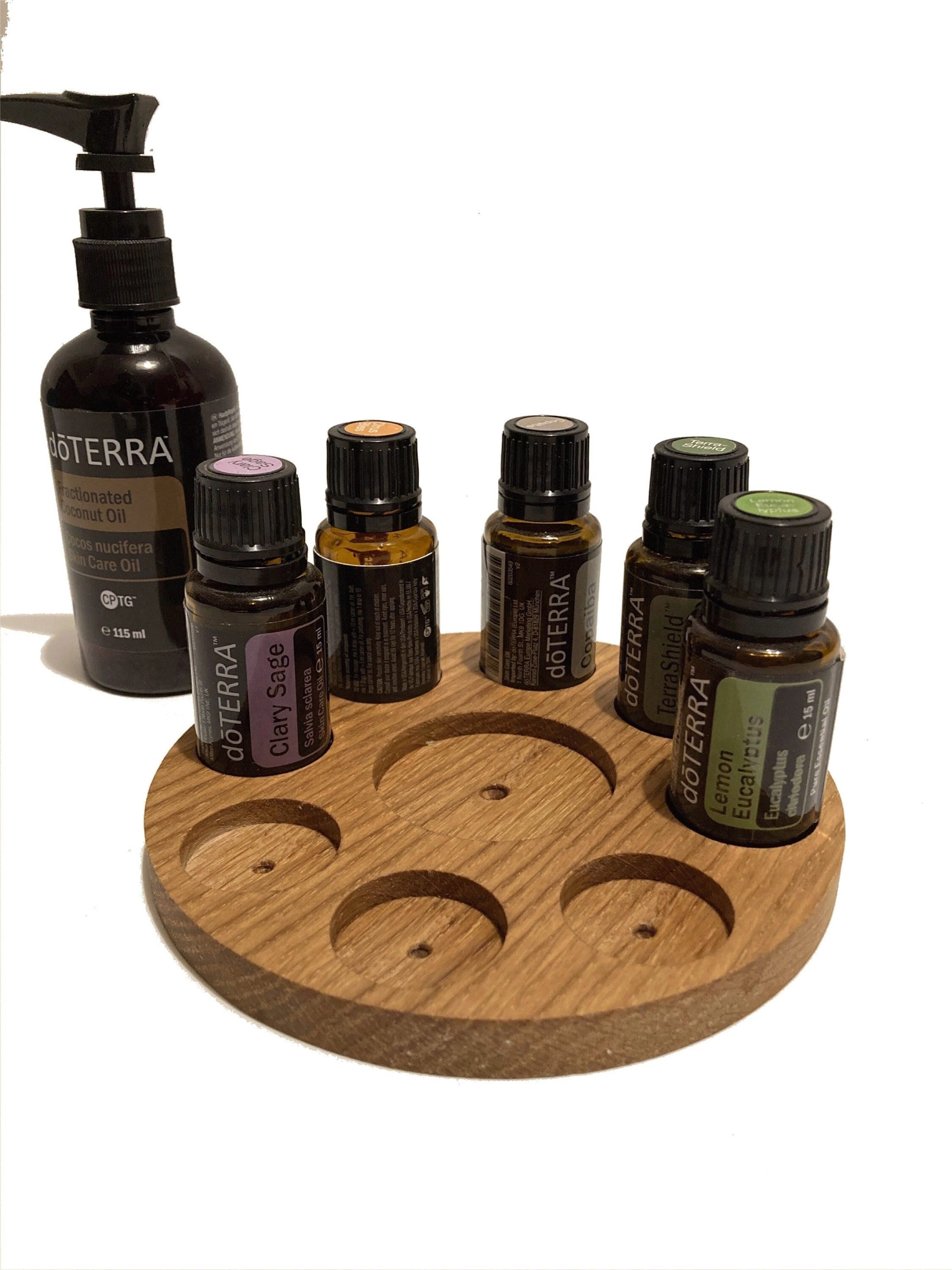 This display is ideal for anyone who uses oils with a 15ml bottle content and a fractionated coconut oil for the production of the AromaTouch® technique. It has space for the 8 oil bottles (diameter 28 mm) and the fractionated coconut oil (diameter 50 mm). The round arrangement means you can easily read each label. The holes for the 8 bottles are evenly distributed across the entire diameter. This improves handling and overview, and also looks incredibly chic and elegant.