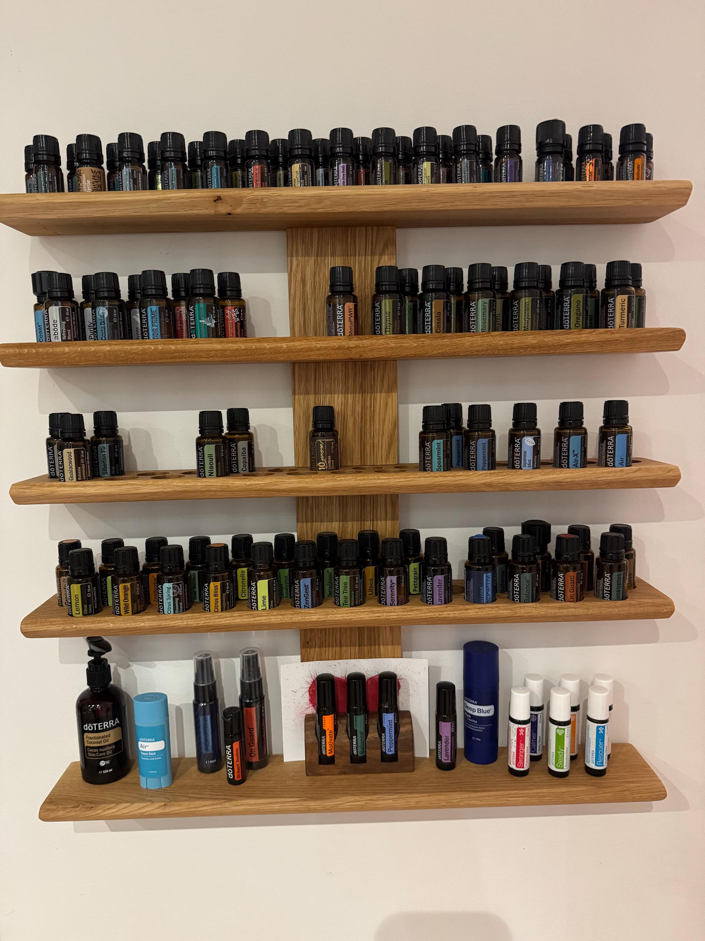 This display is ideal for anyone who uses 10ml oils and roll-on bottles. It accommodates 20 oil bottles (18 mm in diameter), with a 22 mm hole. The hole depth is designed to prevent the bottles from falling out. This allows you to confidently carry the display around your home or hold it in your hand for demonstrations, providing a perfect presentation of the oils. This all improves handling and clarity, and also looks incredibly chic and elegant.