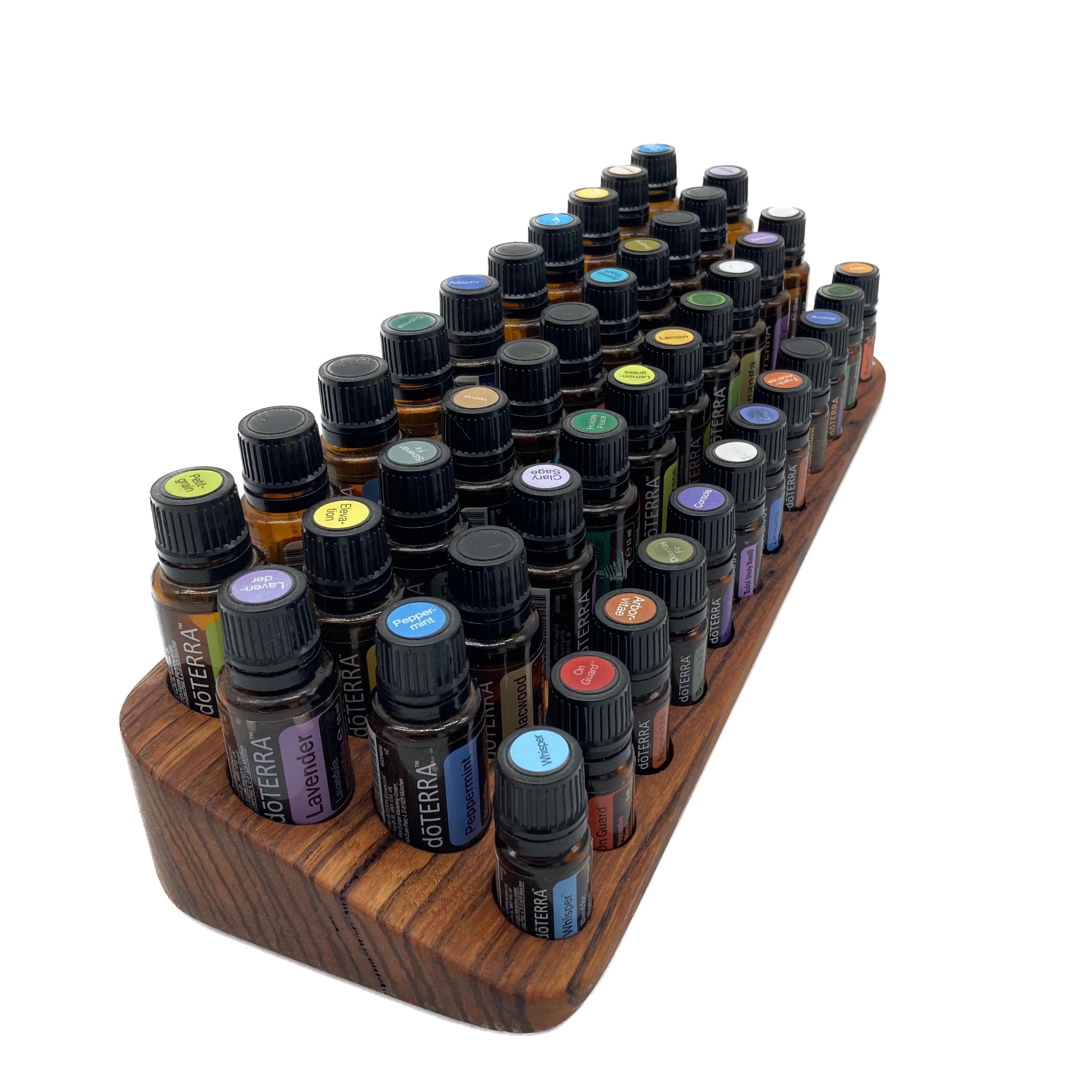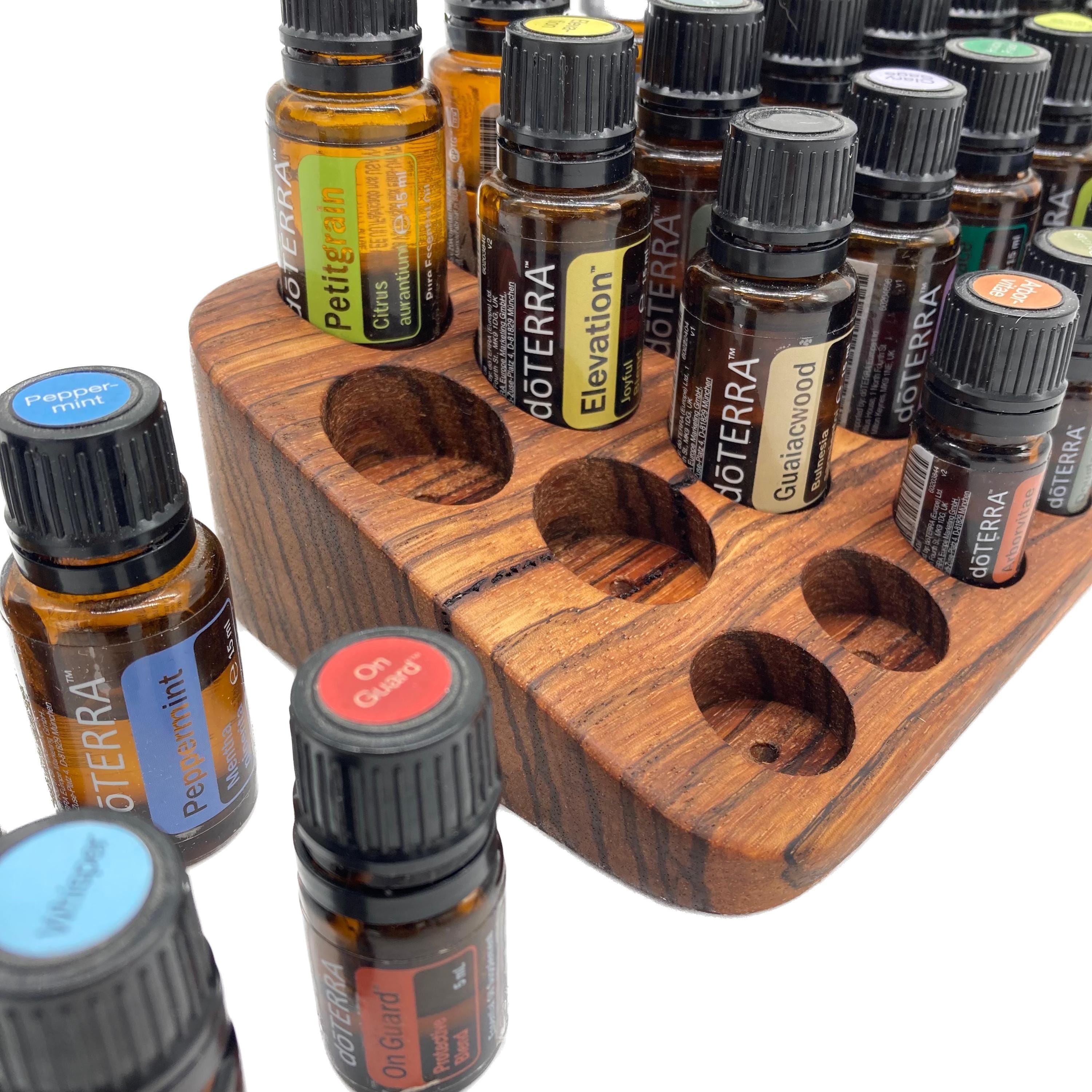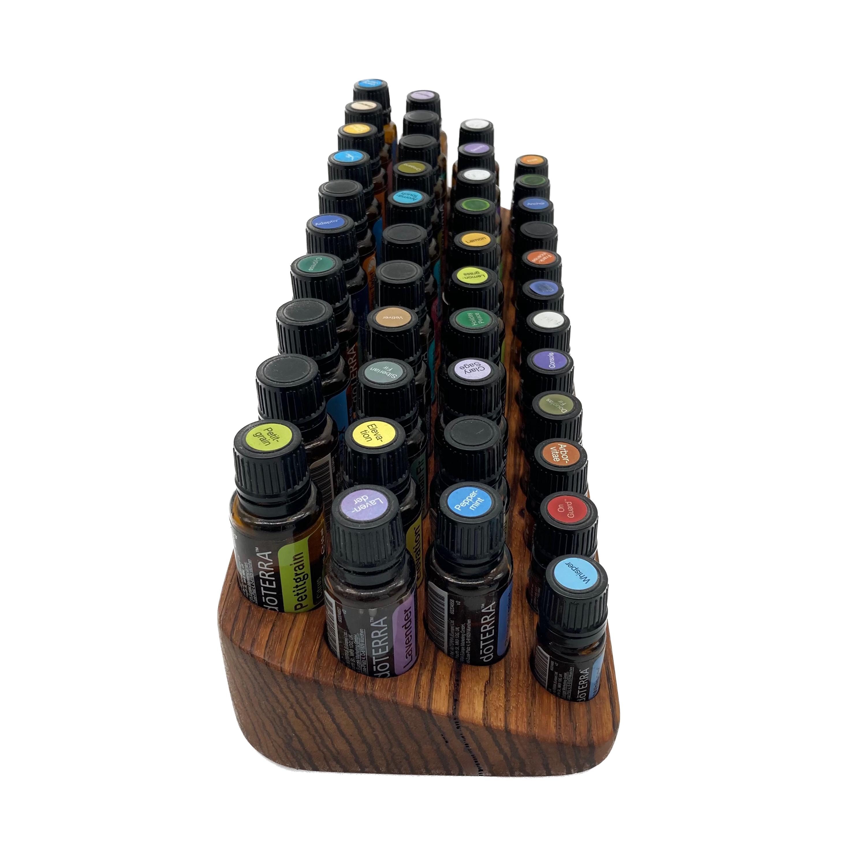 This display is ideal for anyone who uses oils with a 15ml bottle content (diameter 29 mm) and also bottles with a 5ml content (diameter 24 mm). It has space for 31 oil bottles (diameter 28 mm) and 12 spaces for 5ml bottles (24 mm). The staggered arrangement means you can read each label easily. The front of the oil stand is slightly slanted. This improves handling and overview, and also looks incredibly chic and elegant.