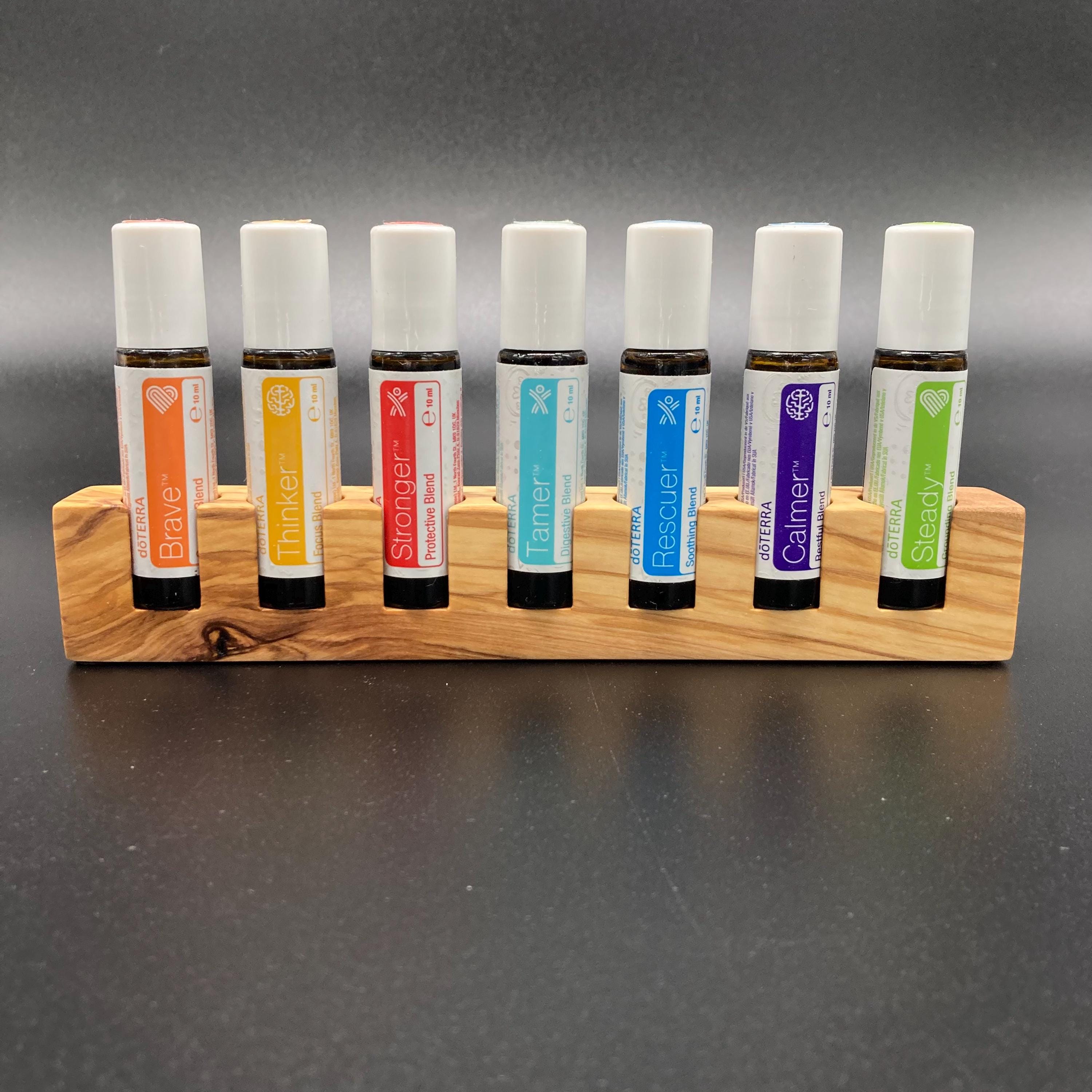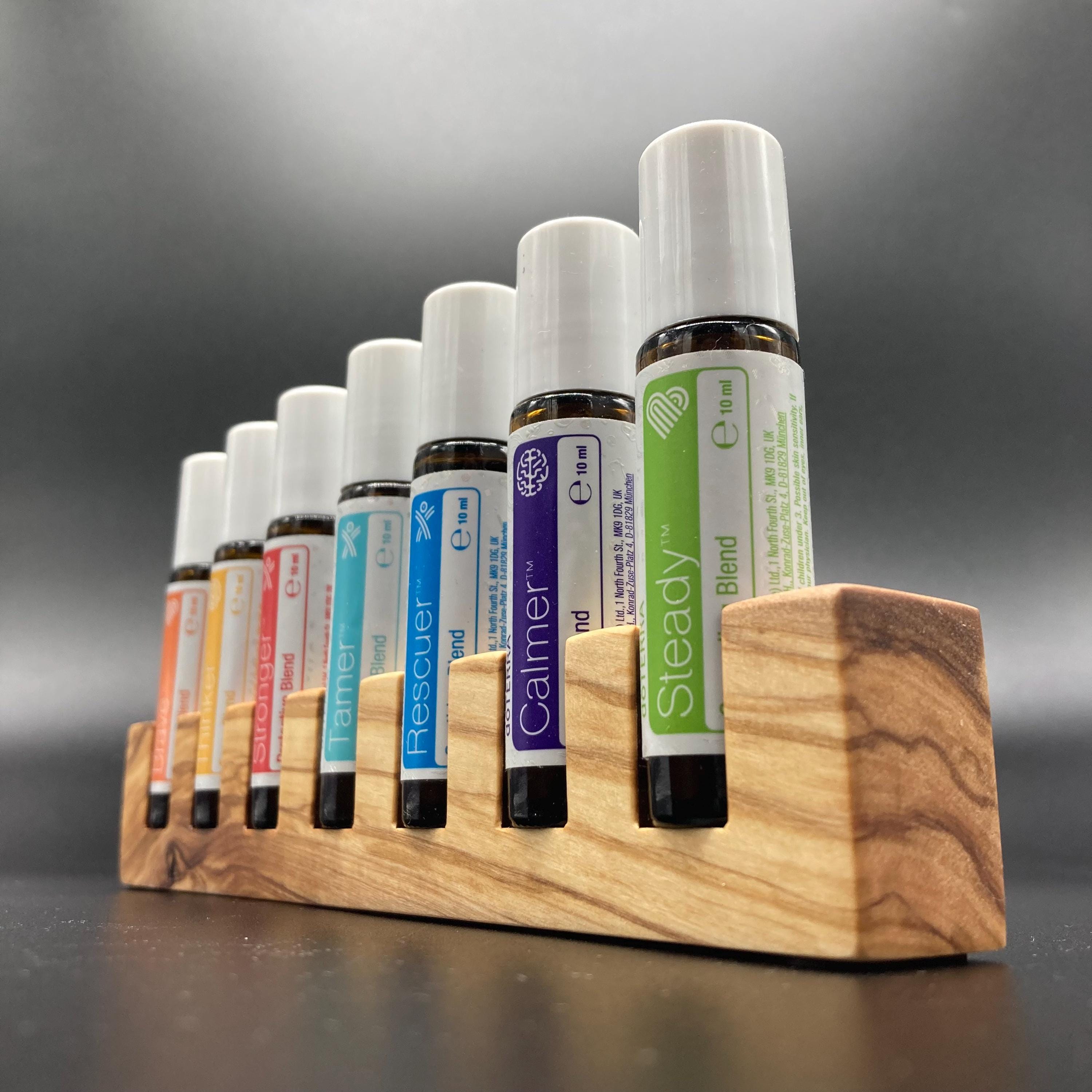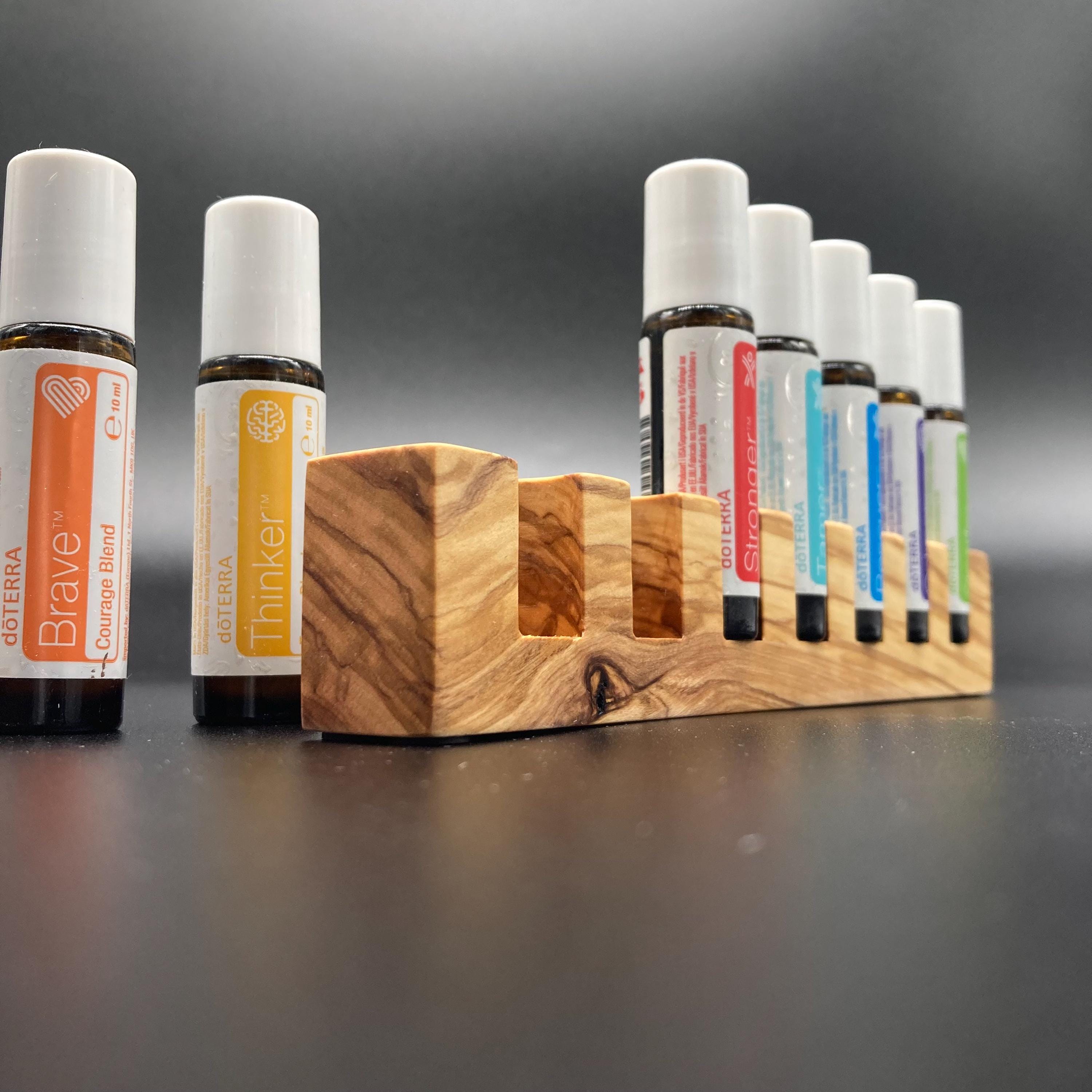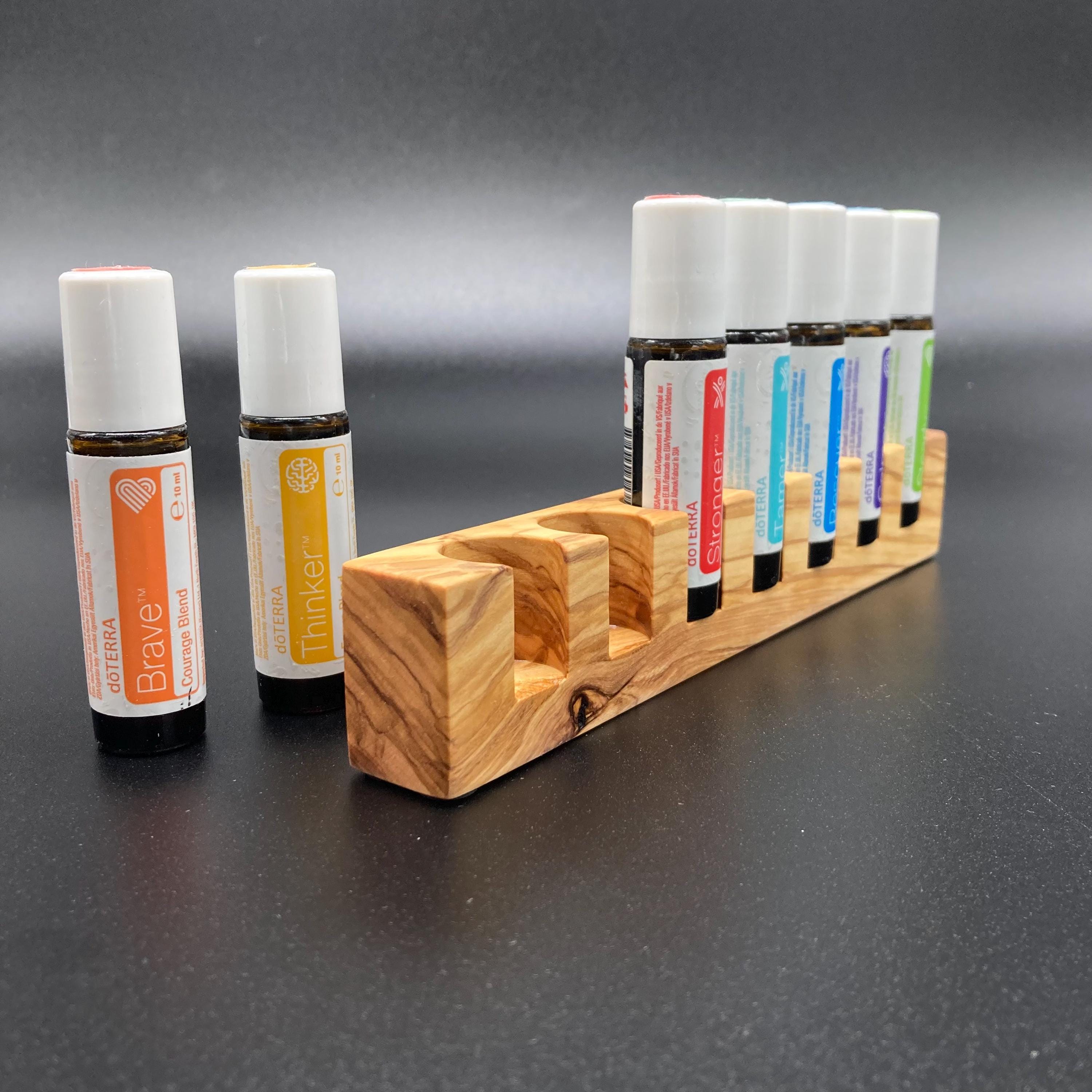 This display is ideal for anyone who uses 10ml oils and roll-on bottles. It has space for 7 oil bottles (18mm diameter), and the hole is 22mm deep. The position of the hole and the cut at the front make it much easier to read the labels without having to lift the bottles. The depth of the hole is selected to prevent the bottles from falling out. This means you can confidently carry the display around the house or pick it up to demonstrate and present the oils perfectly. All of this improves handling and clarity, and also looks incredibly chic and elegant. Kids in particular will find it easy to transport their entire collection safely from A to B without everything rolling around.