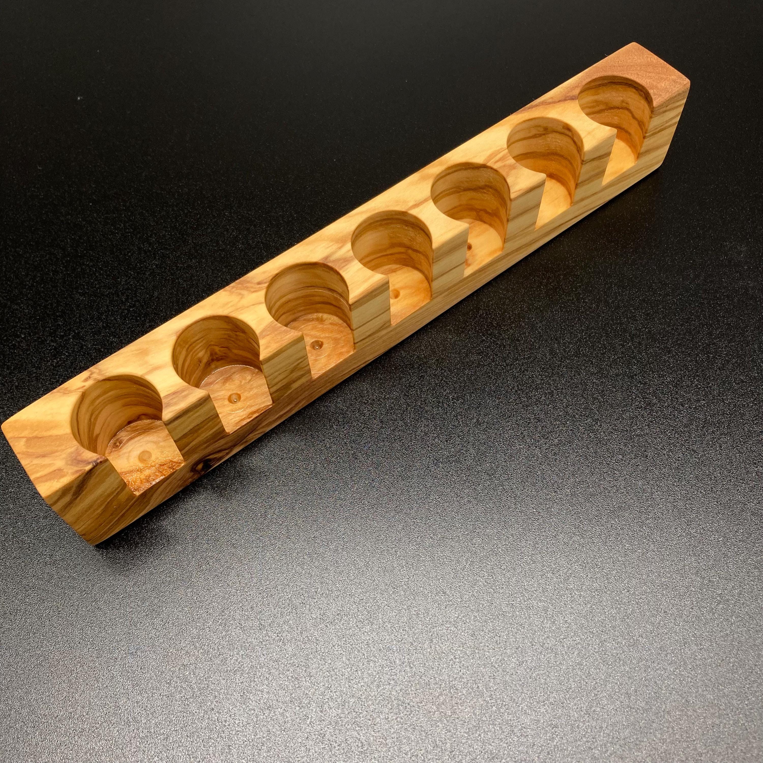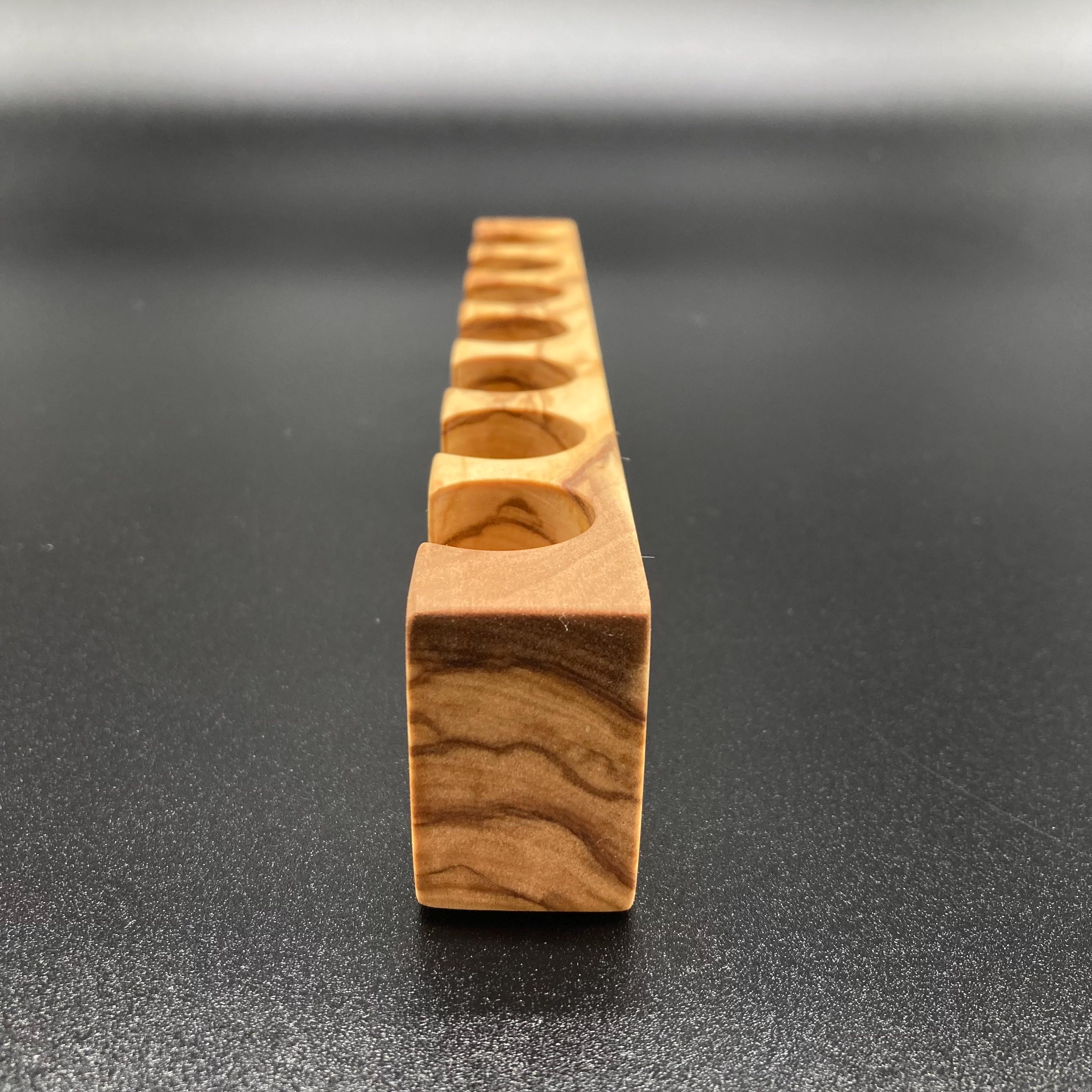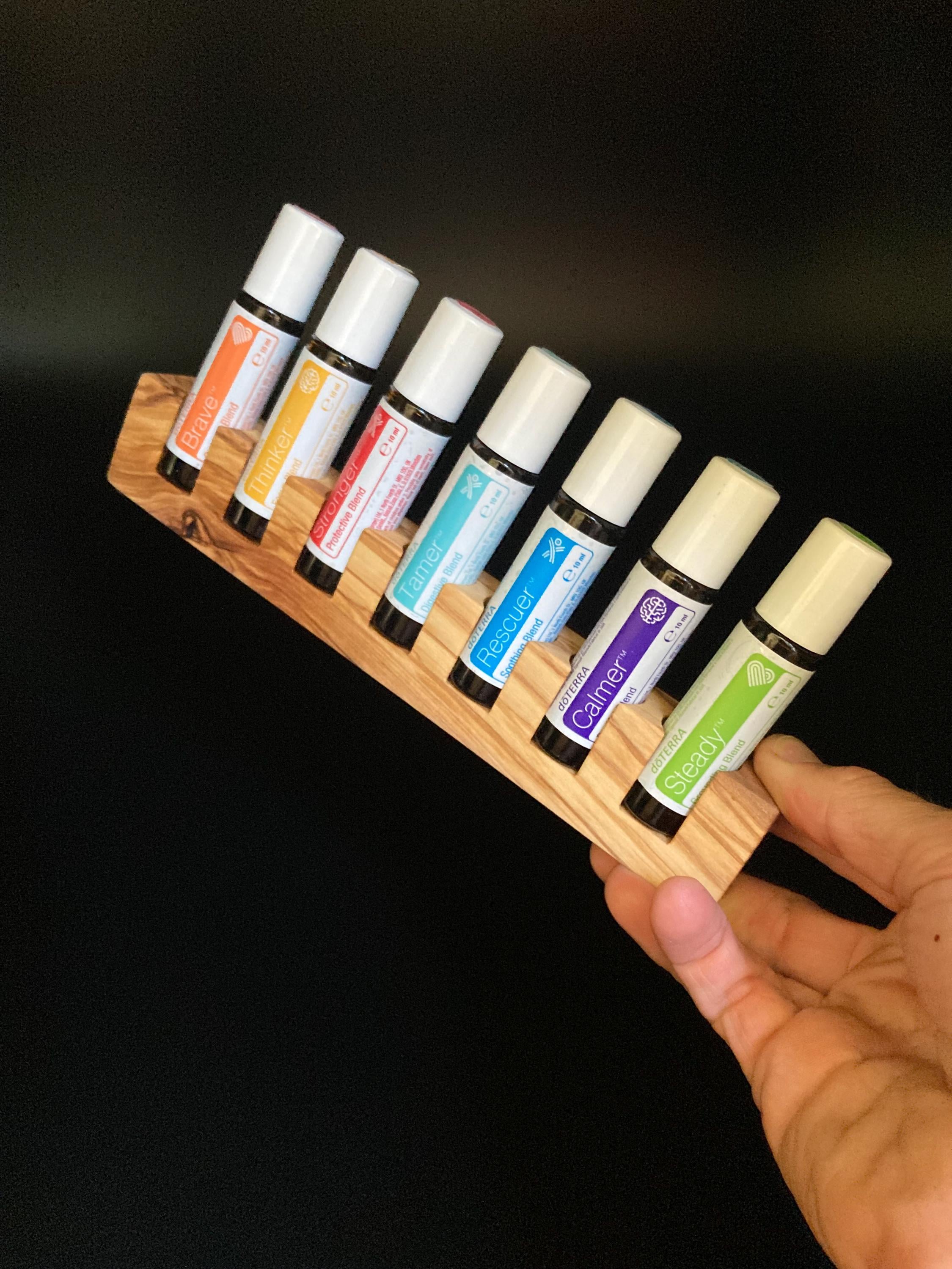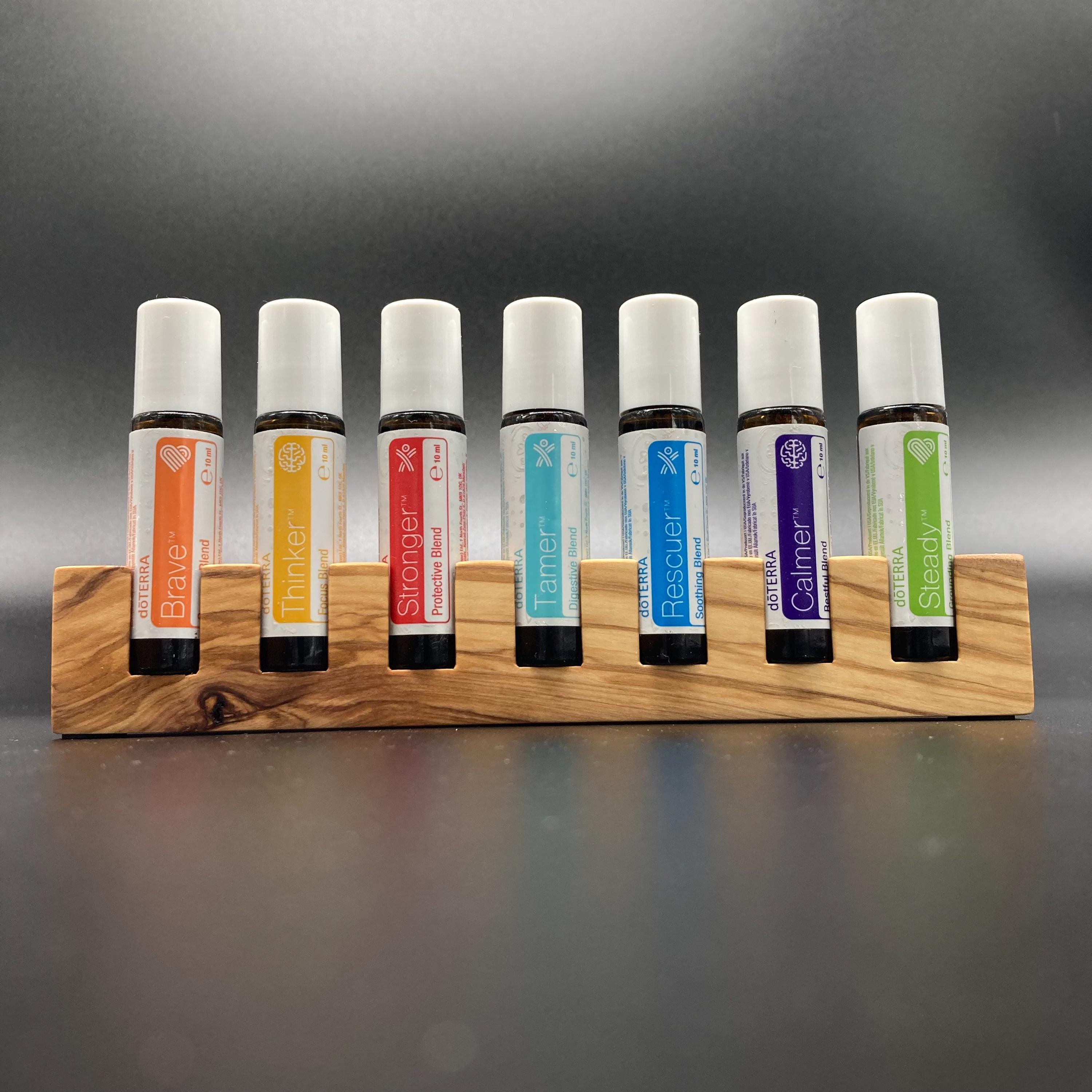 This display is ideal for anyone who uses 10ml oils and roll-on bottles. It has space for 7 oil bottles (18mm diameter), and the hole is 22mm deep. The position of the hole and the cut at the front make it much easier to read the labels without having to lift the bottles. The depth of the hole is selected to prevent the bottles from falling out. This means you can confidently carry the display around the house or pick it up to demonstrate and present the oils perfectly. All of this improves handling and clarity, and also looks incredibly chic and elegant. Kids in particular will find it easy to transport their entire collection safely from A to B without everything rolling around.