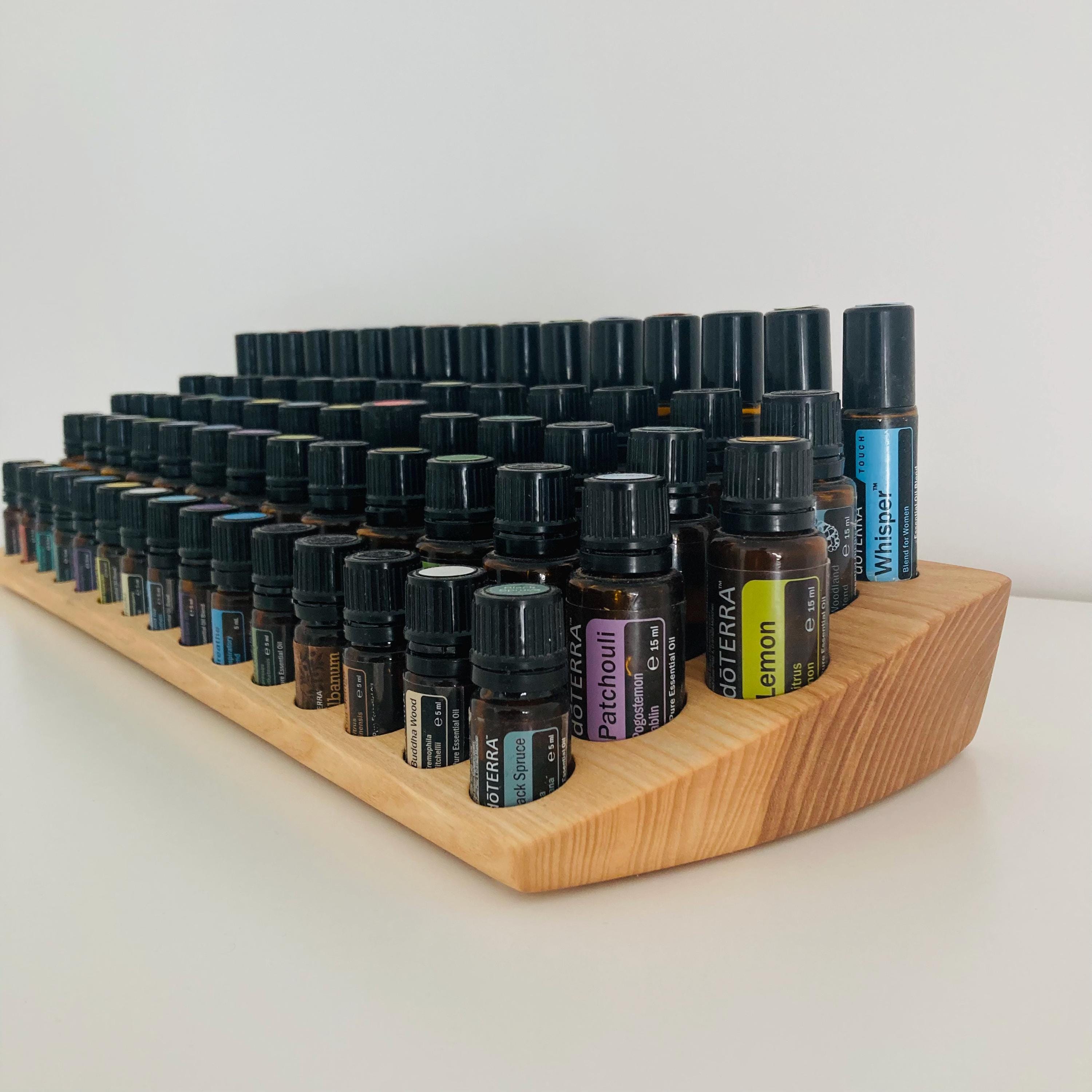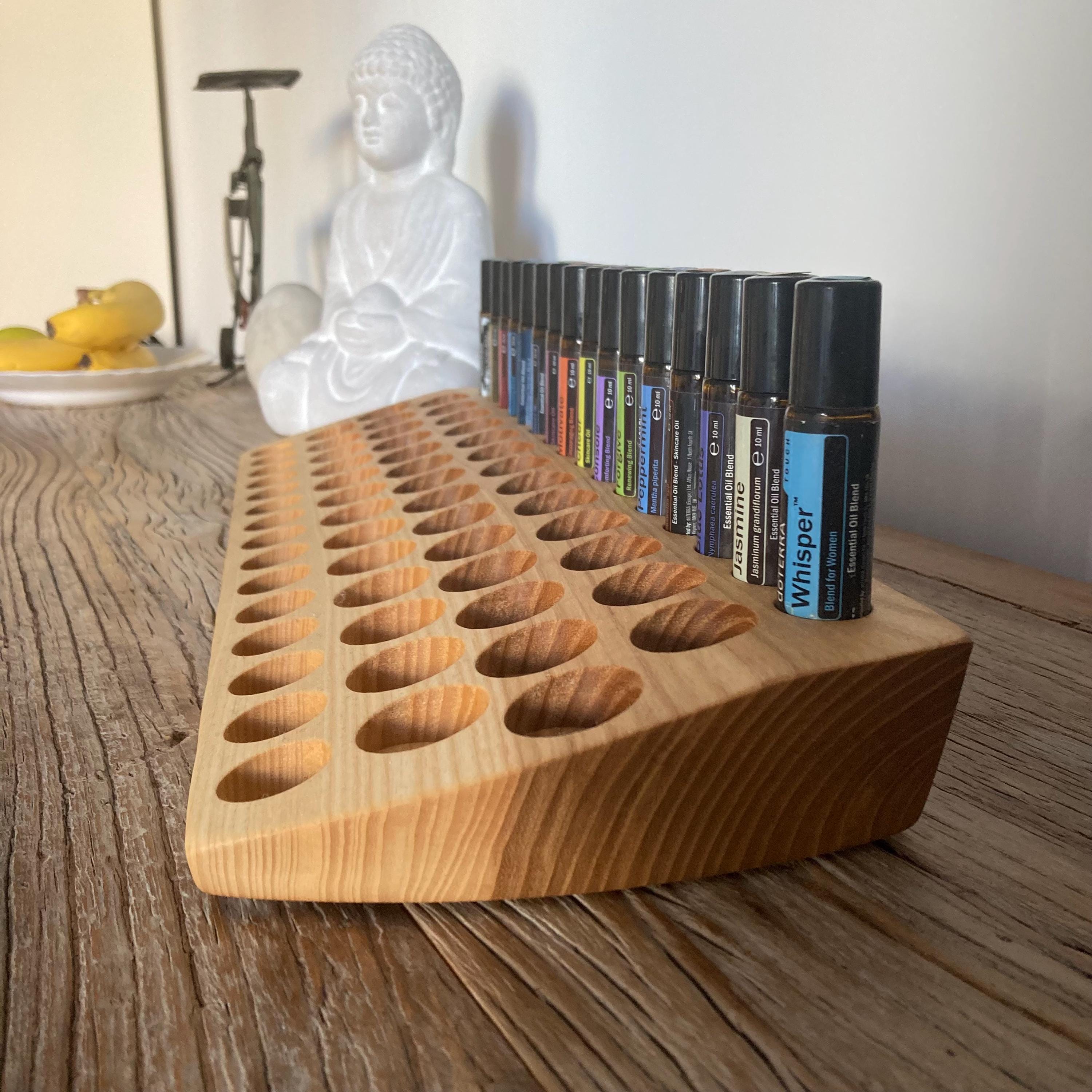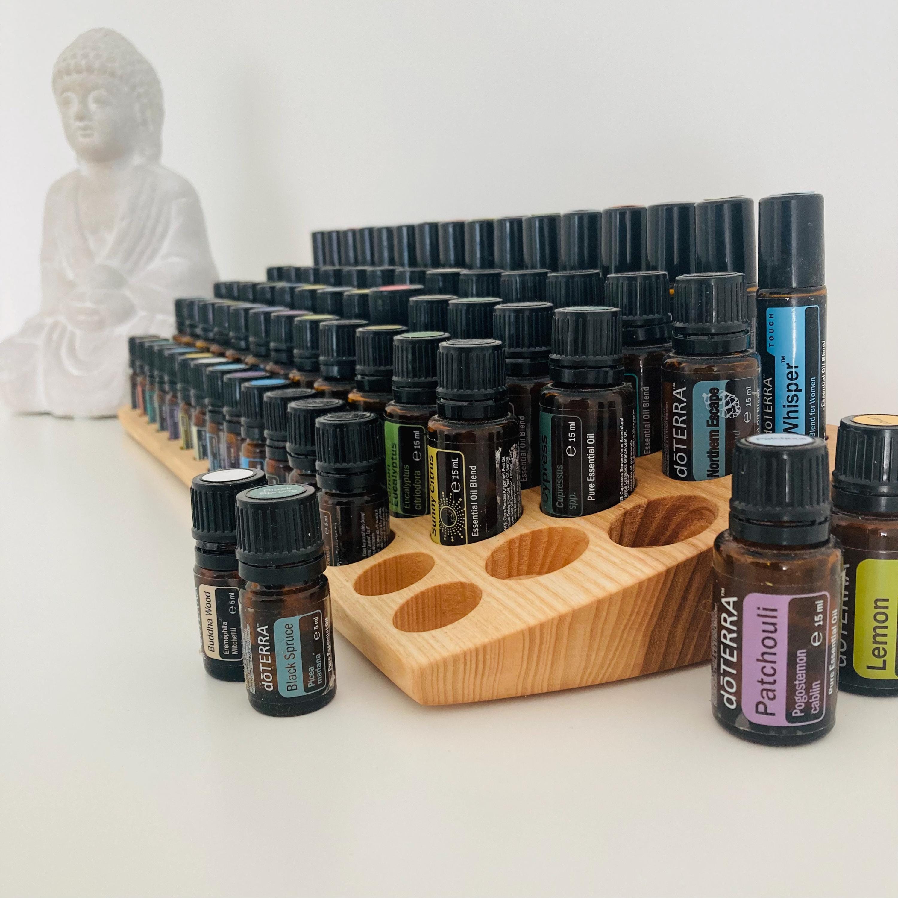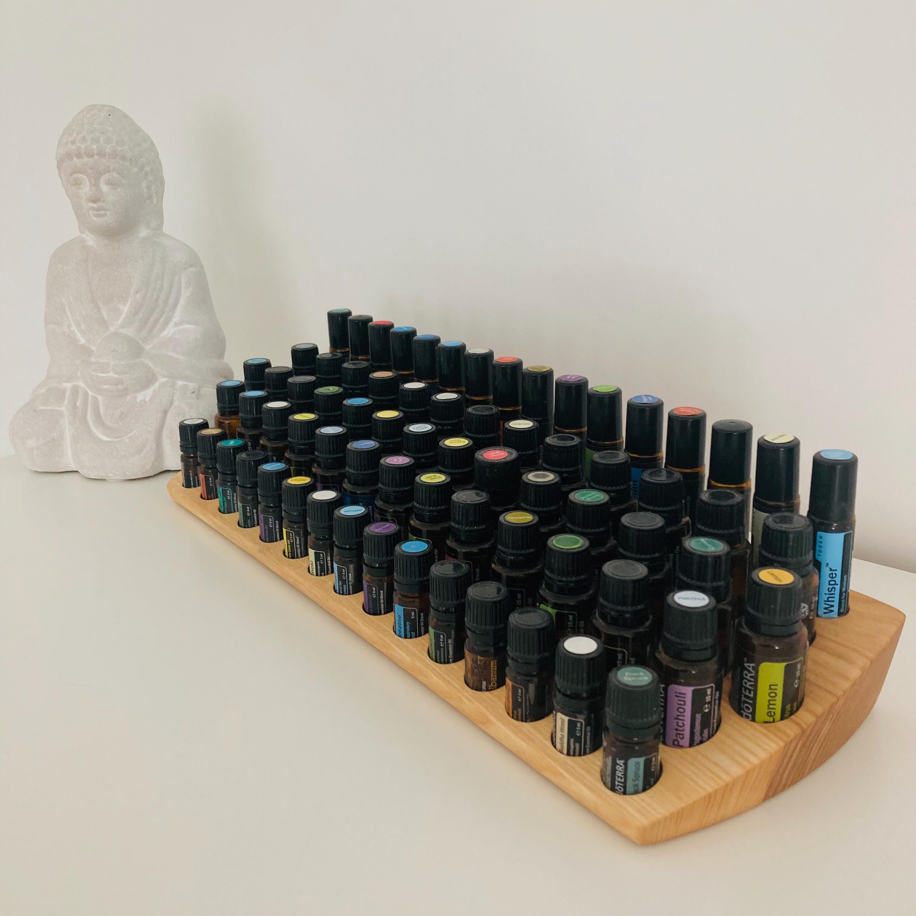 This display is ideal for anyone using 15ml (29mm diameter) oils, 10ml (21mm diameter) roll-ons, and 5ml (24mm diameter) bottles. It holds 40 oil bottles (28mm diameter), 16 roll-ons (21mm diameter), and 15 5ml bottles (24mm diameter). The staggered arrangement ensures easy label reading. The front of the oil display is slightly angled, improving handling and visibility, and also giving it a stylish and elegant look.