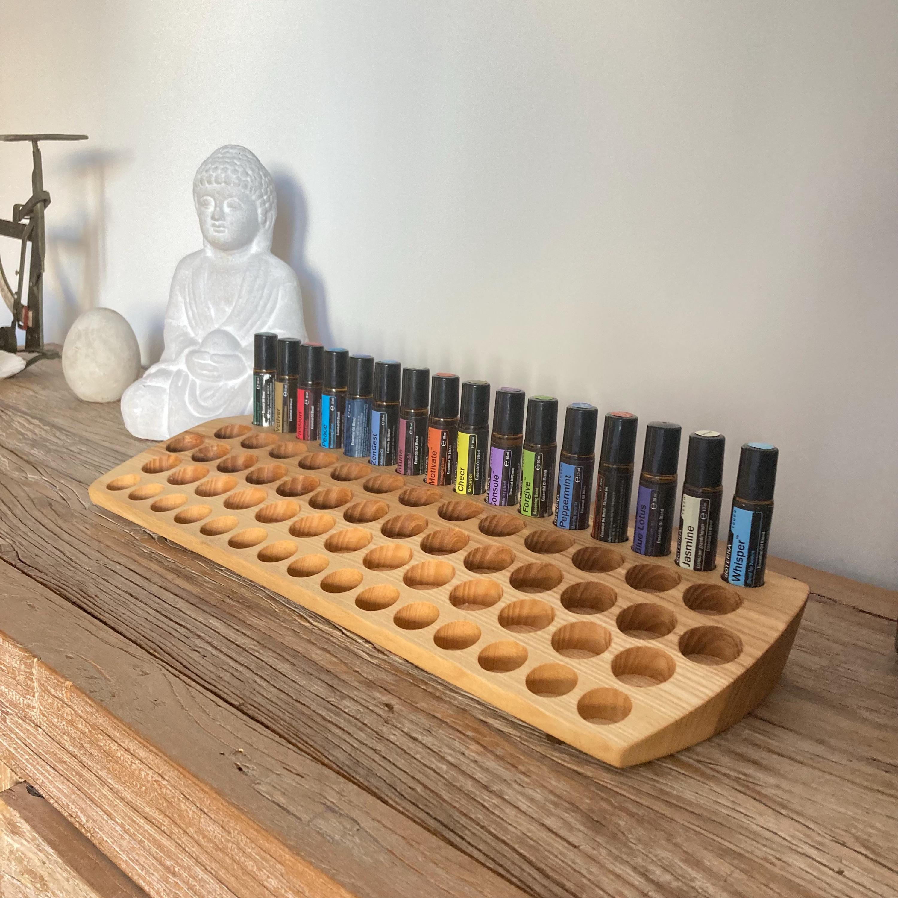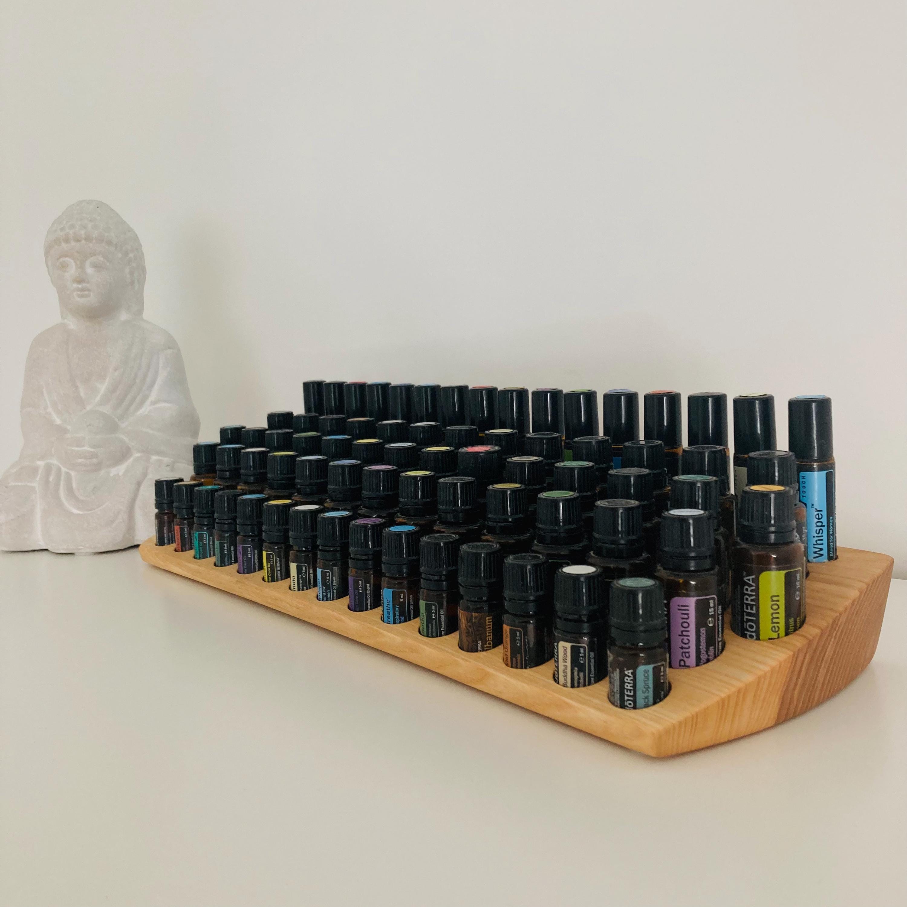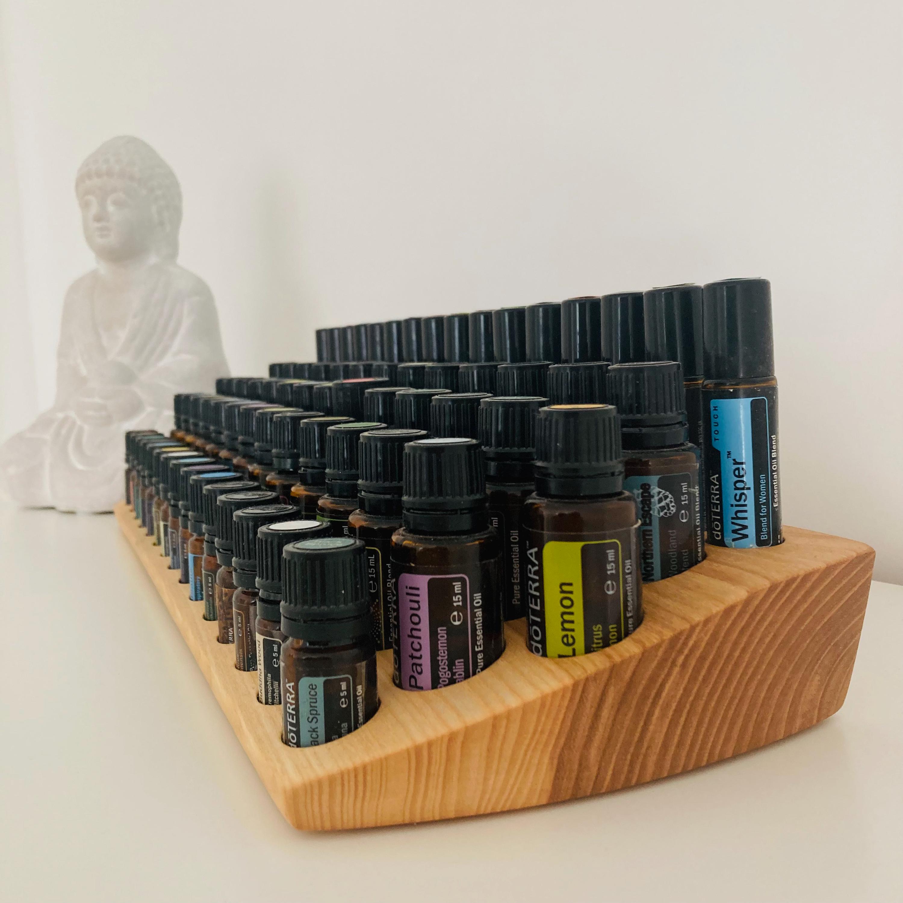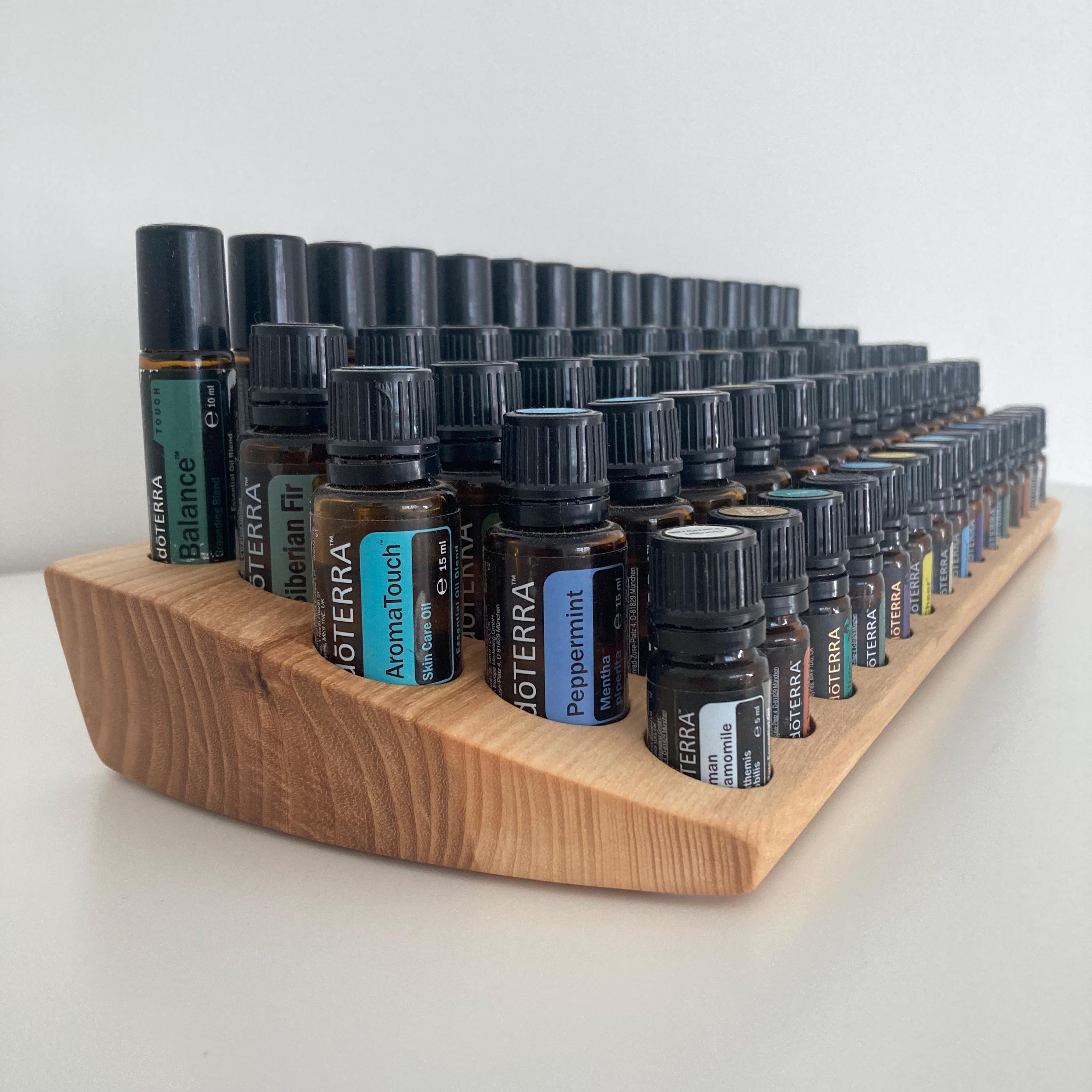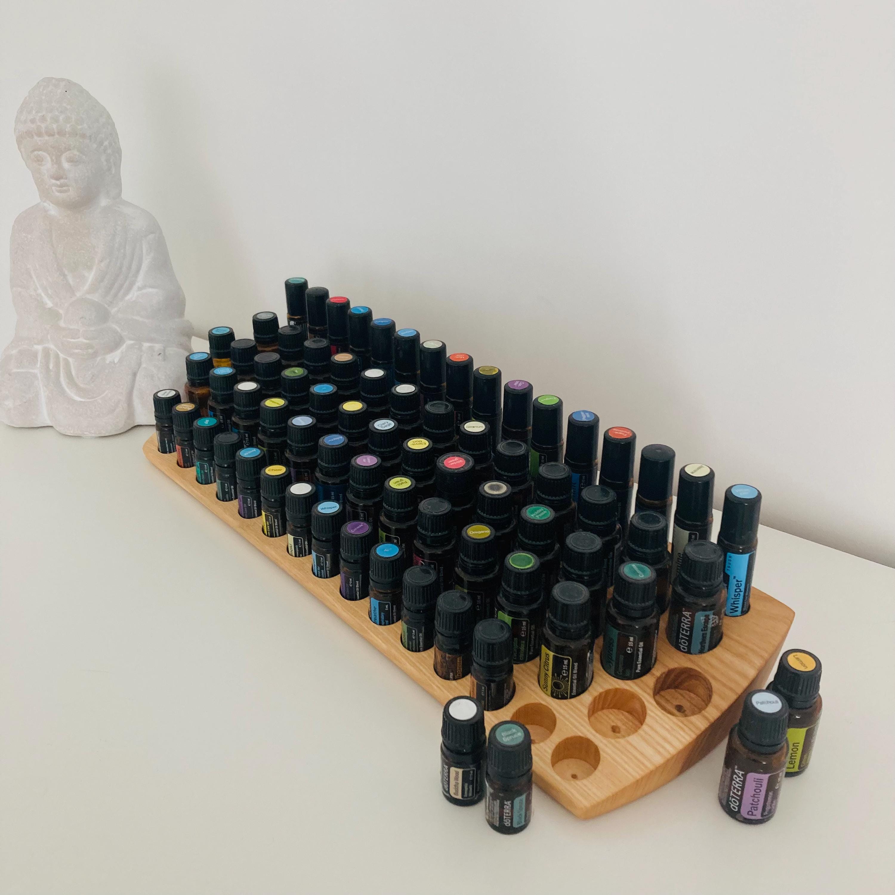 This display is ideal for anyone using 15ml (29mm diameter) oils, 10ml (21mm diameter) roll-ons, and 5ml (24mm diameter) bottles. It holds 40 oil bottles (28mm diameter), 16 roll-ons (21mm diameter), and 15 5ml bottles (24mm diameter). The staggered arrangement ensures easy label reading. The front of the oil display is slightly angled, improving handling and visibility, and also giving it a stylish and elegant look.