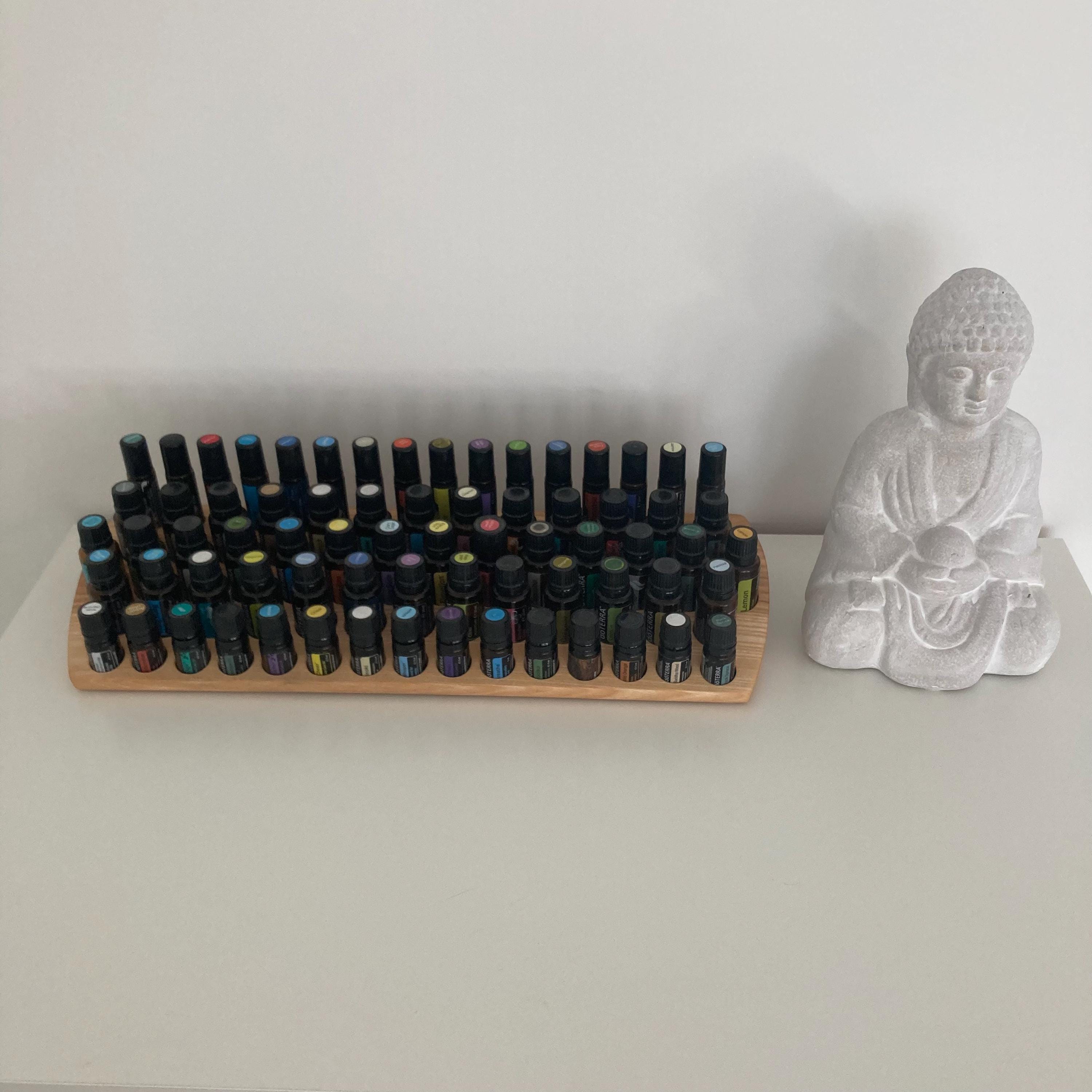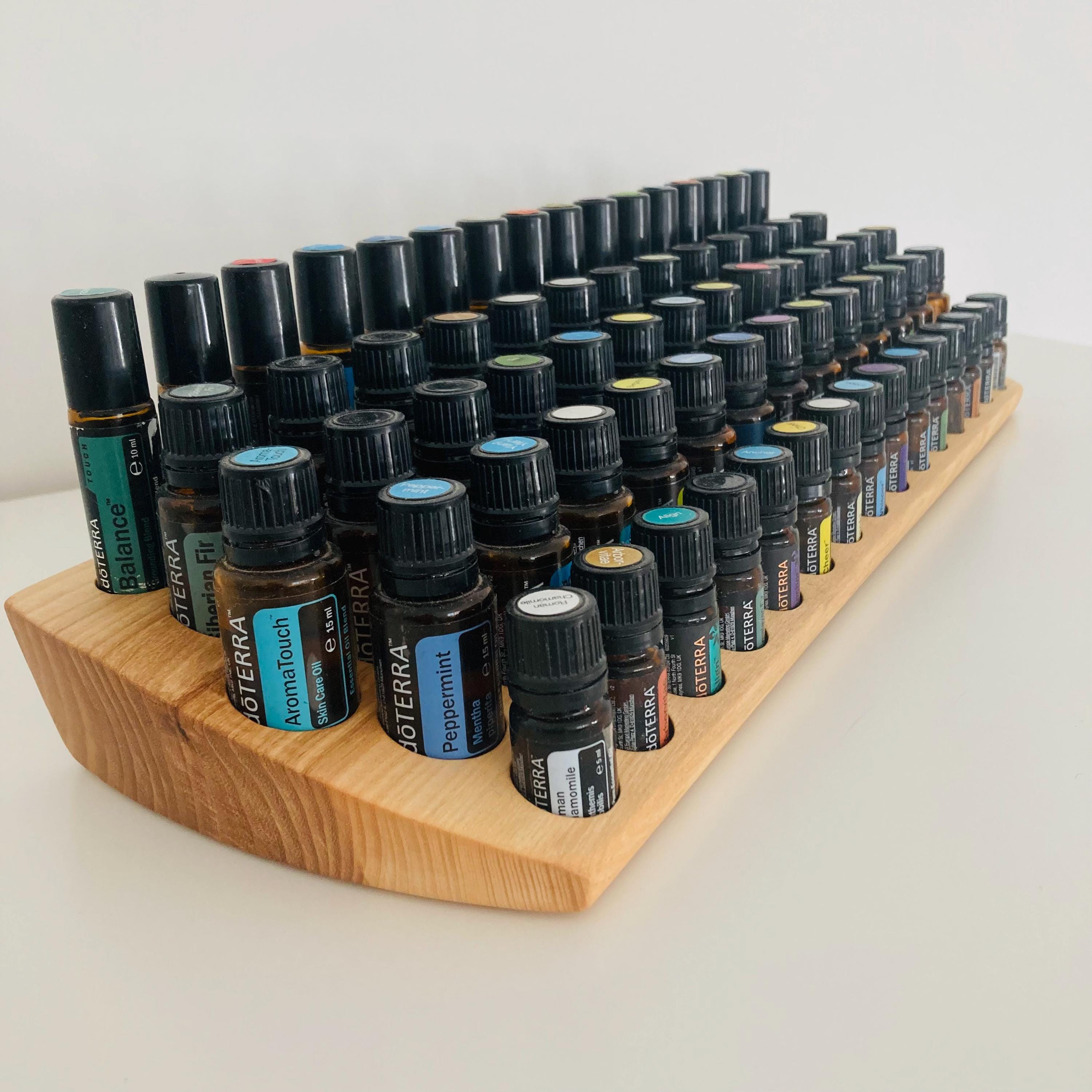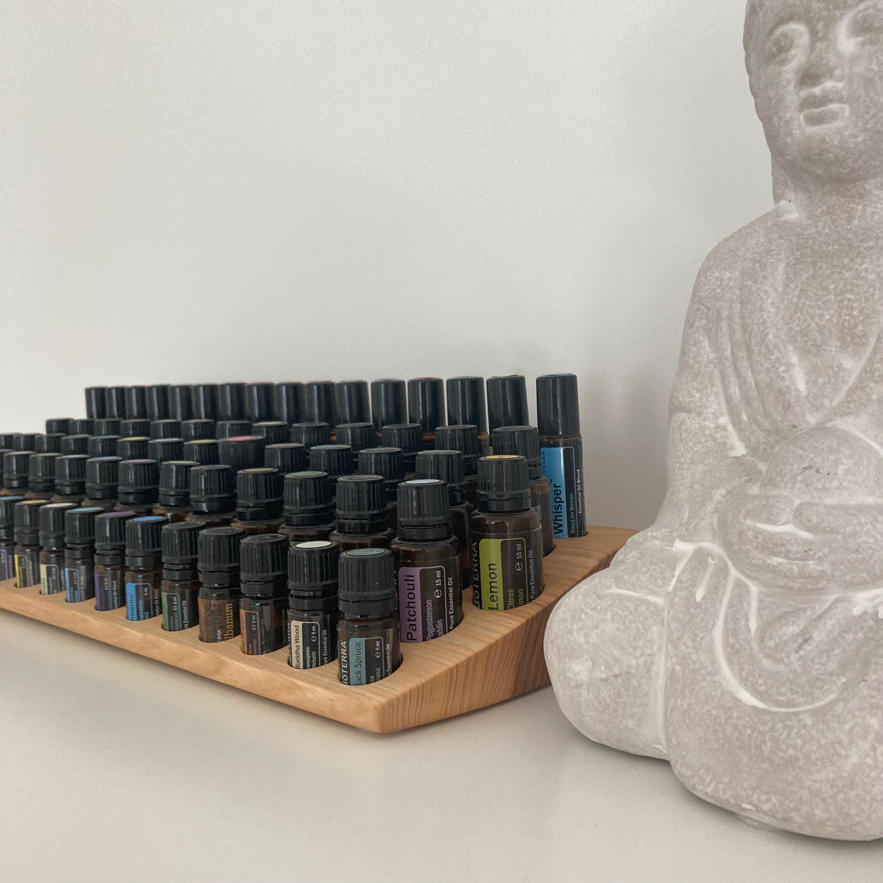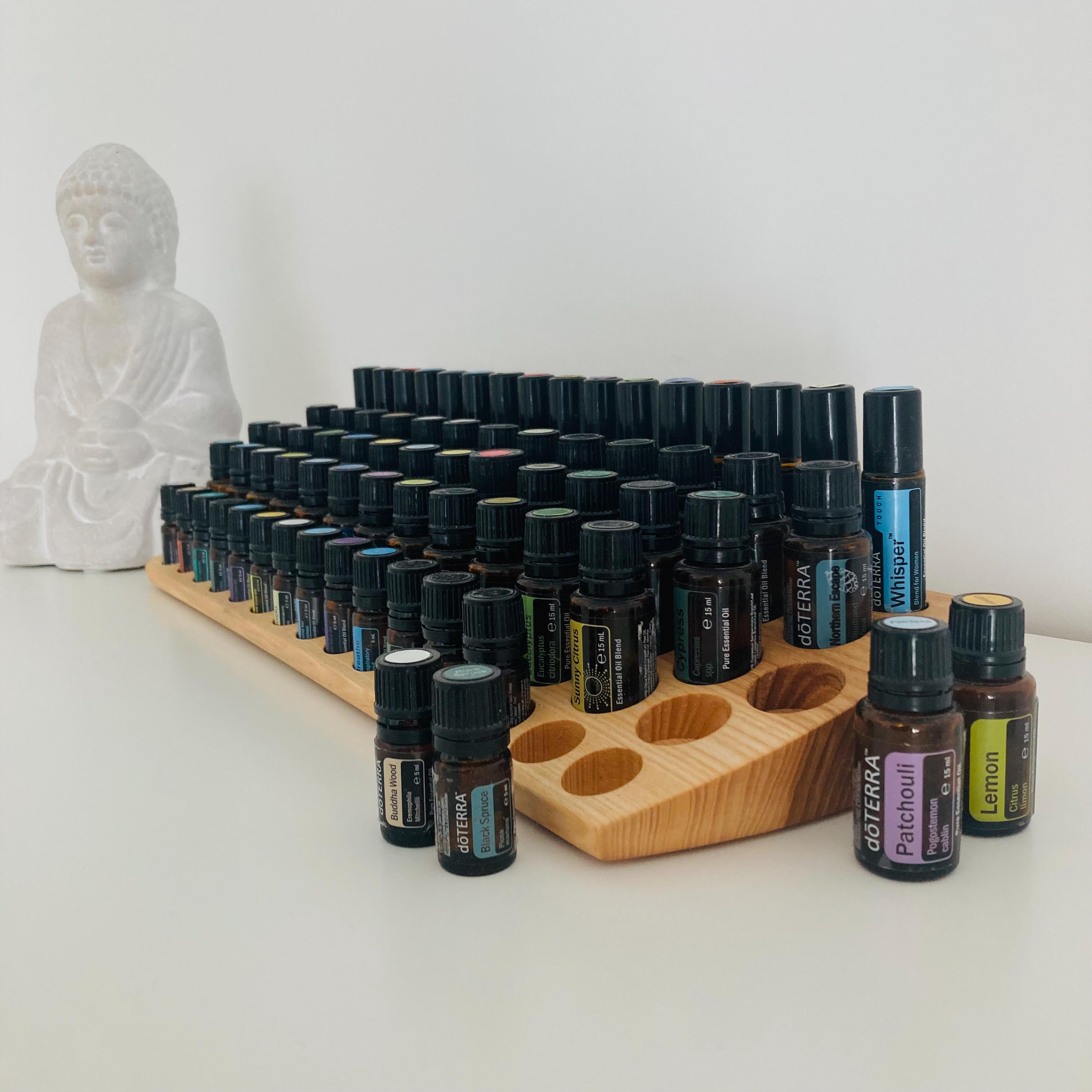 This display is ideal for anyone using 15ml (29mm diameter) oils, 10ml (21mm diameter) roll-ons, and 5ml (24mm diameter) bottles. It holds 40 oil bottles (28mm diameter), 16 roll-ons (21mm diameter), and 15 5ml bottles (24mm diameter). The staggered arrangement ensures easy label reading. The front of the oil display is slightly angled, improving handling and visibility, and also giving it a stylish and elegant look.