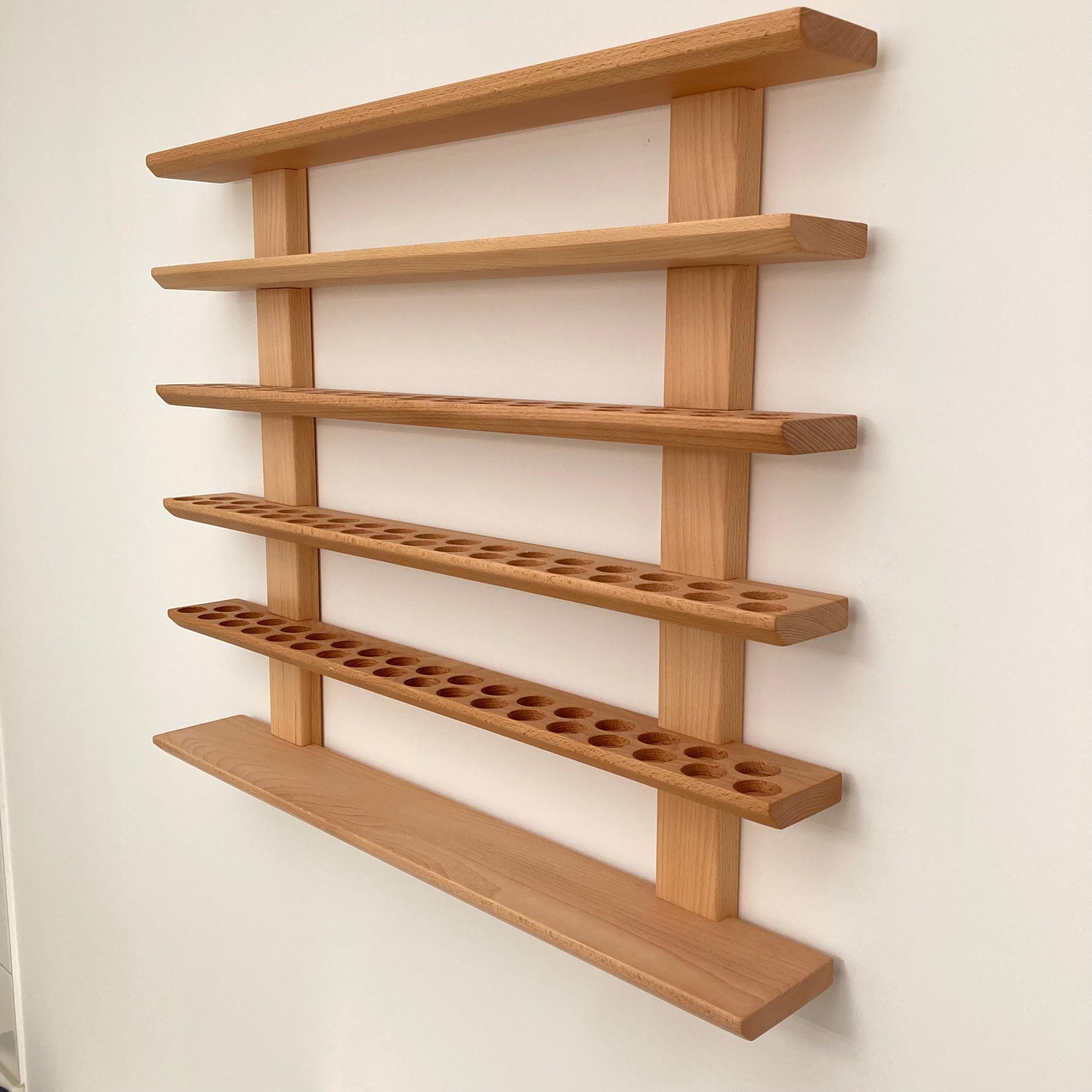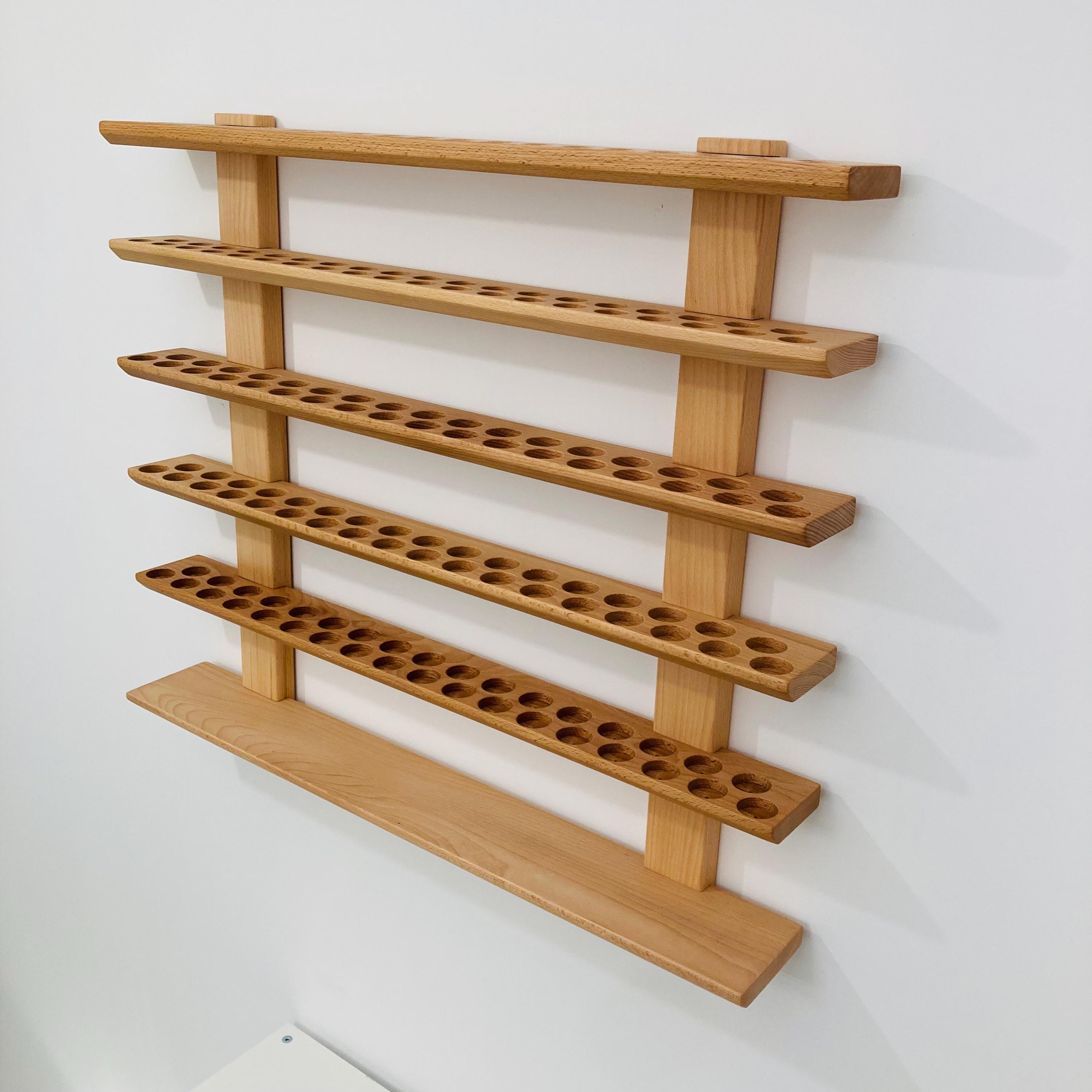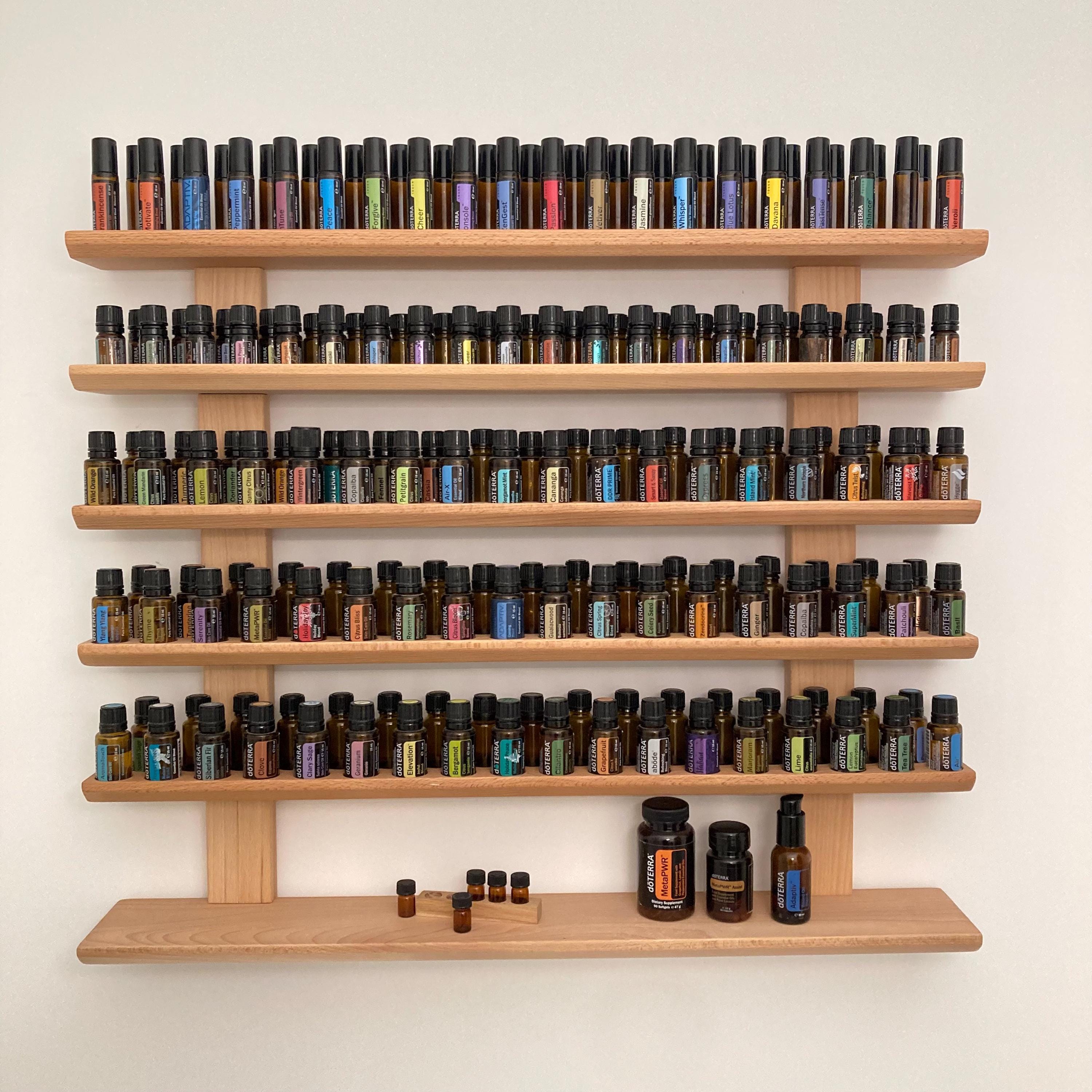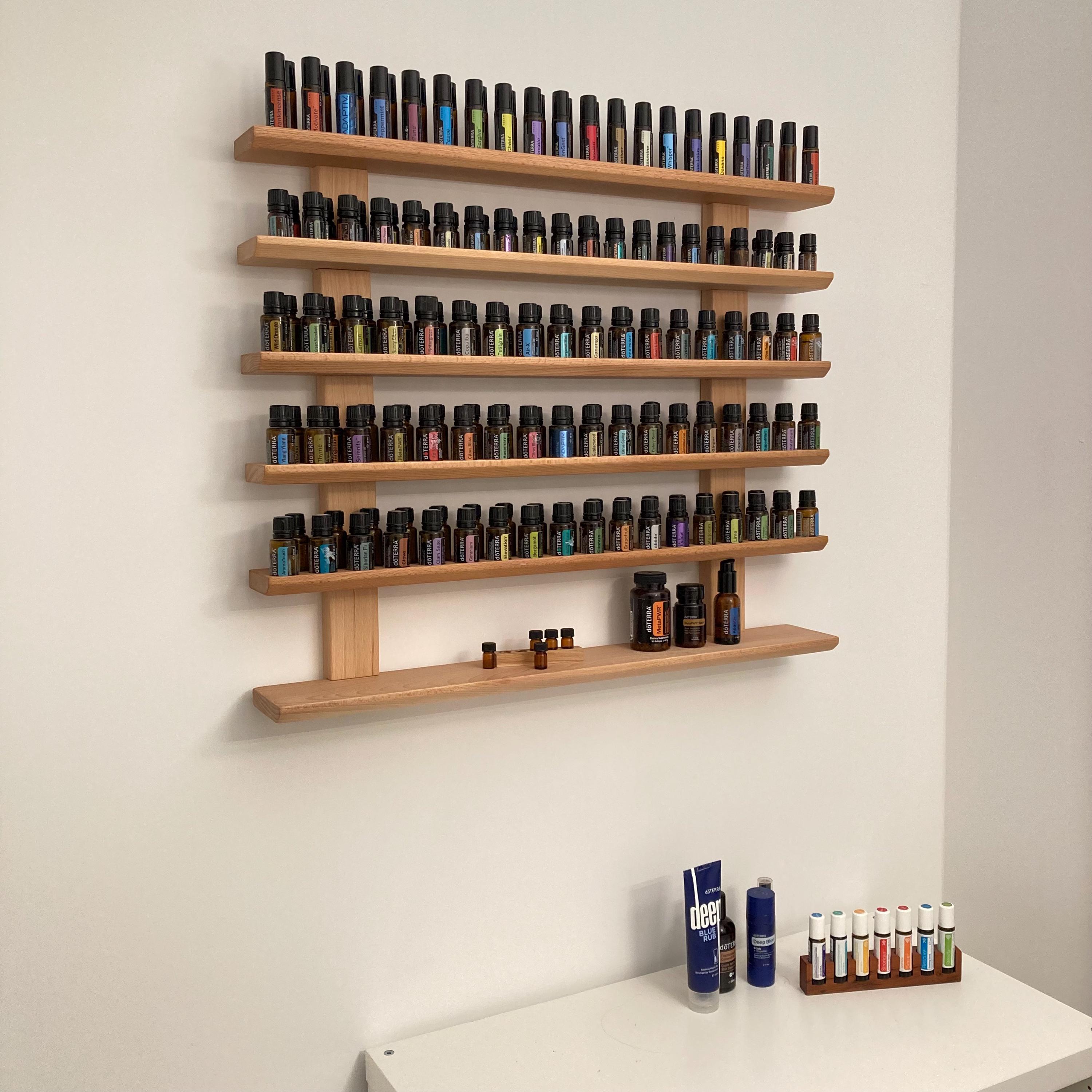 This wall-mounted oil rack is ideal for anyone using 15ml and 5ml oils, as well as 10ml roll-on applicators. It holds 105 oil bottles (29mm diameter).
