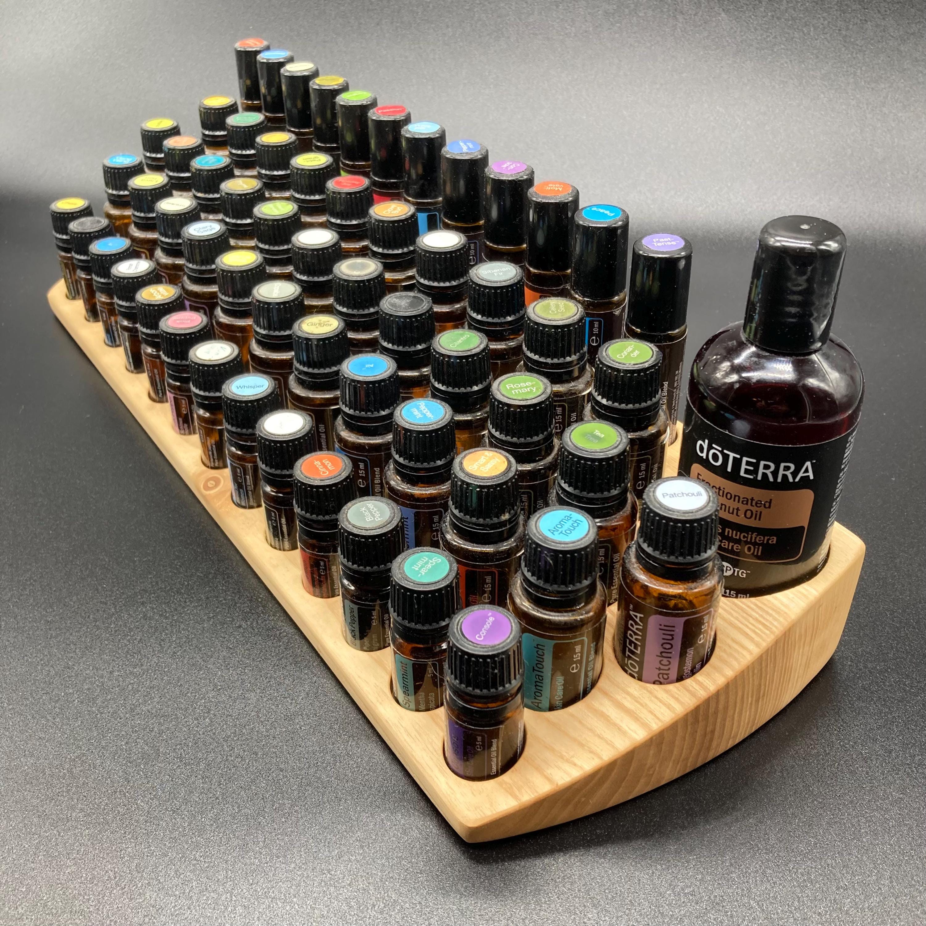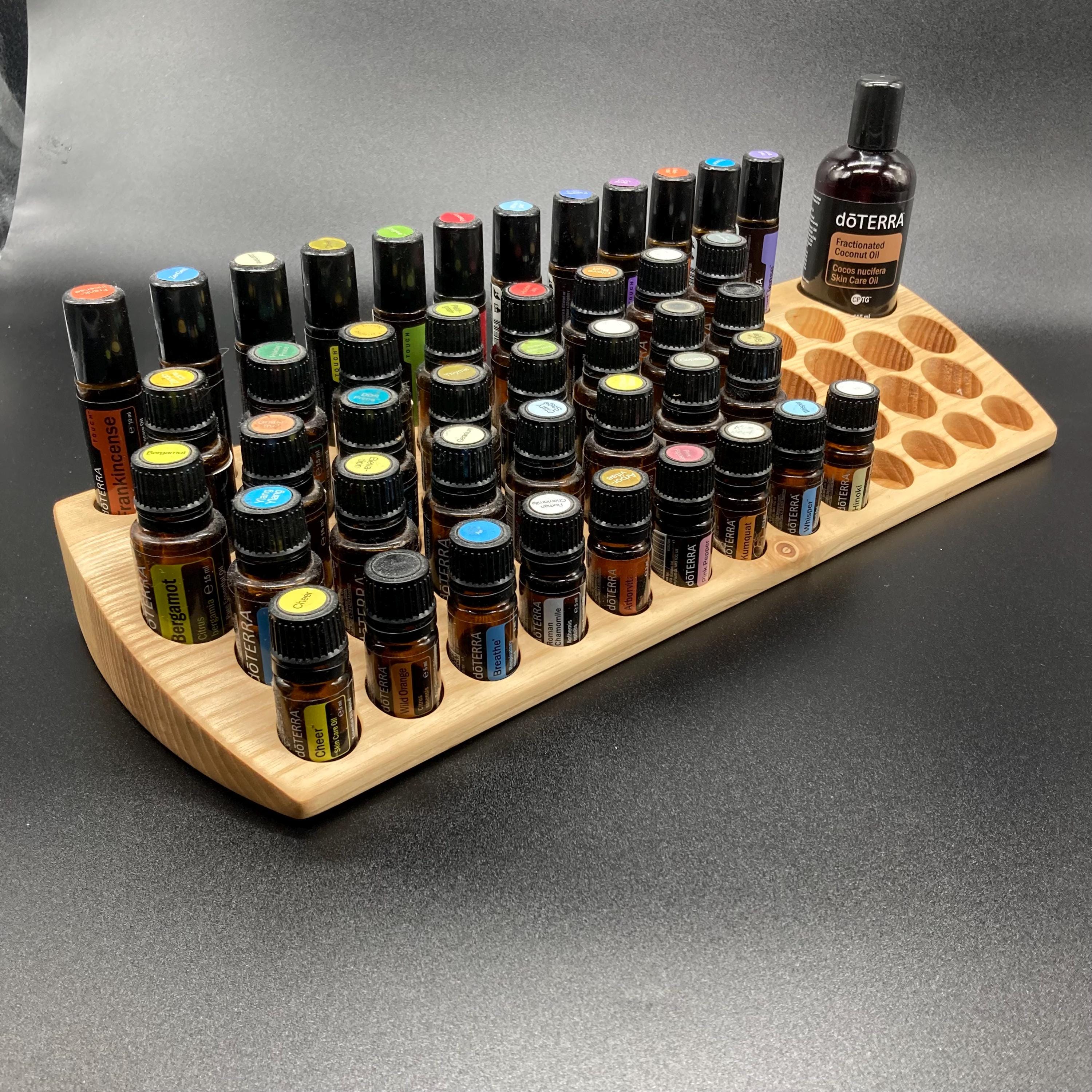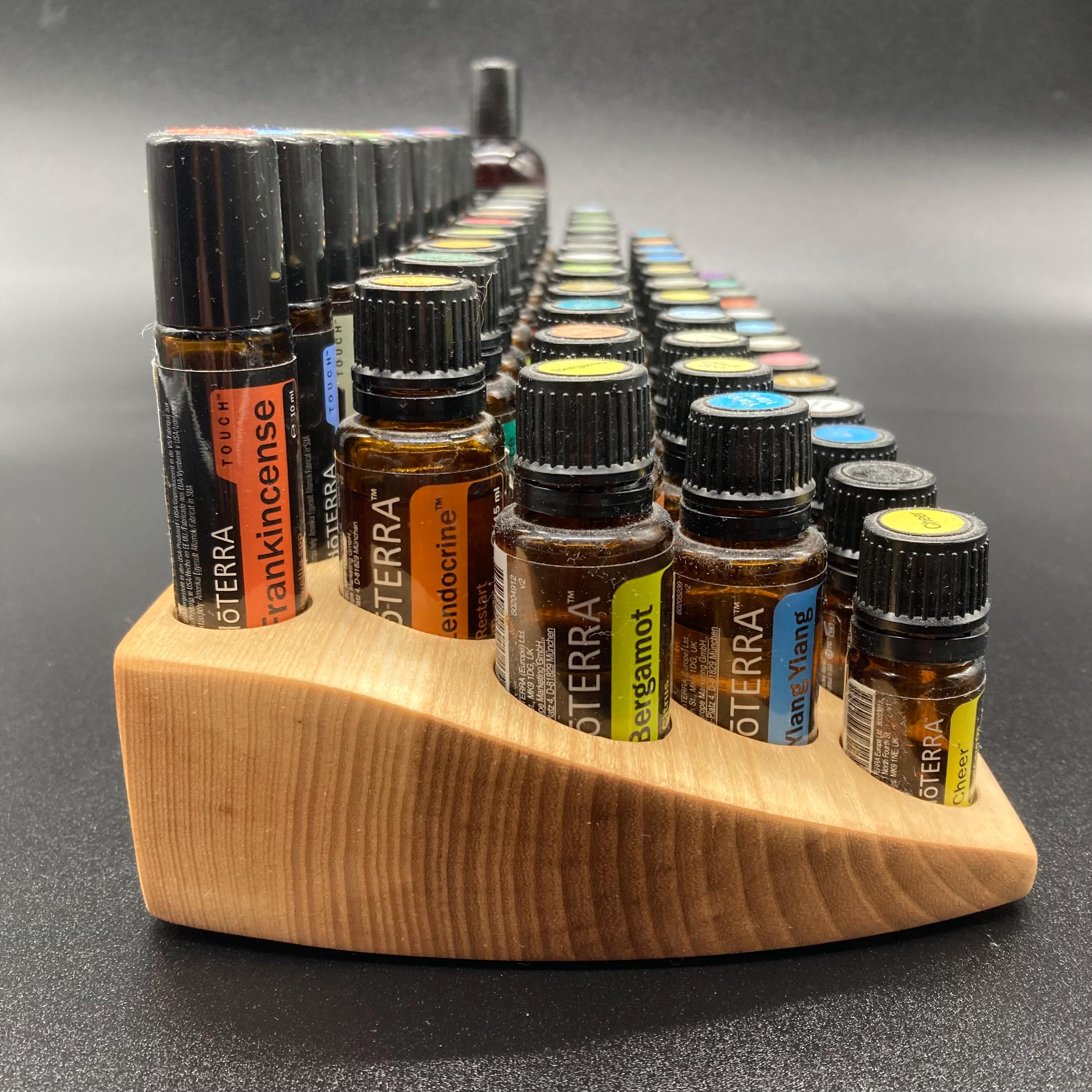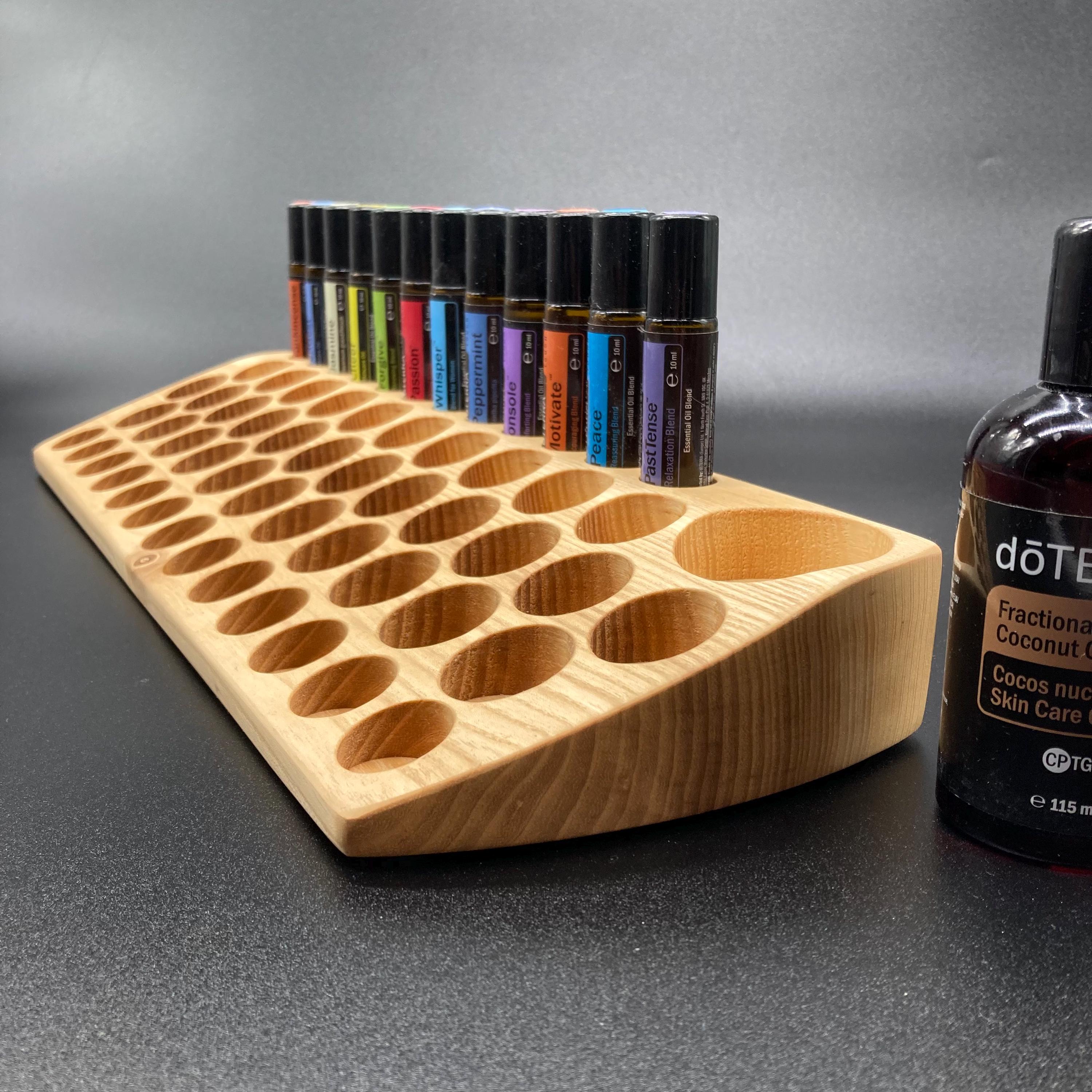 This display is ideal for anyone using 15ml bottles of essential oil (29mm diameter), fractionated coconut oil (50mm diameter), 10ml roll-ons (21mm diameter), and 5ml bottles (23mm diameter). It holds 33 bottles of essential oil (28mm diameter), 12 roll-ons (21mm diameter), and 13 5ml bottles (23mm diameter). The staggered arrangement ensures easy label reading. The front of the display is slightly angled, improving handling and visibility, and also giving it a stylish and elegant look.