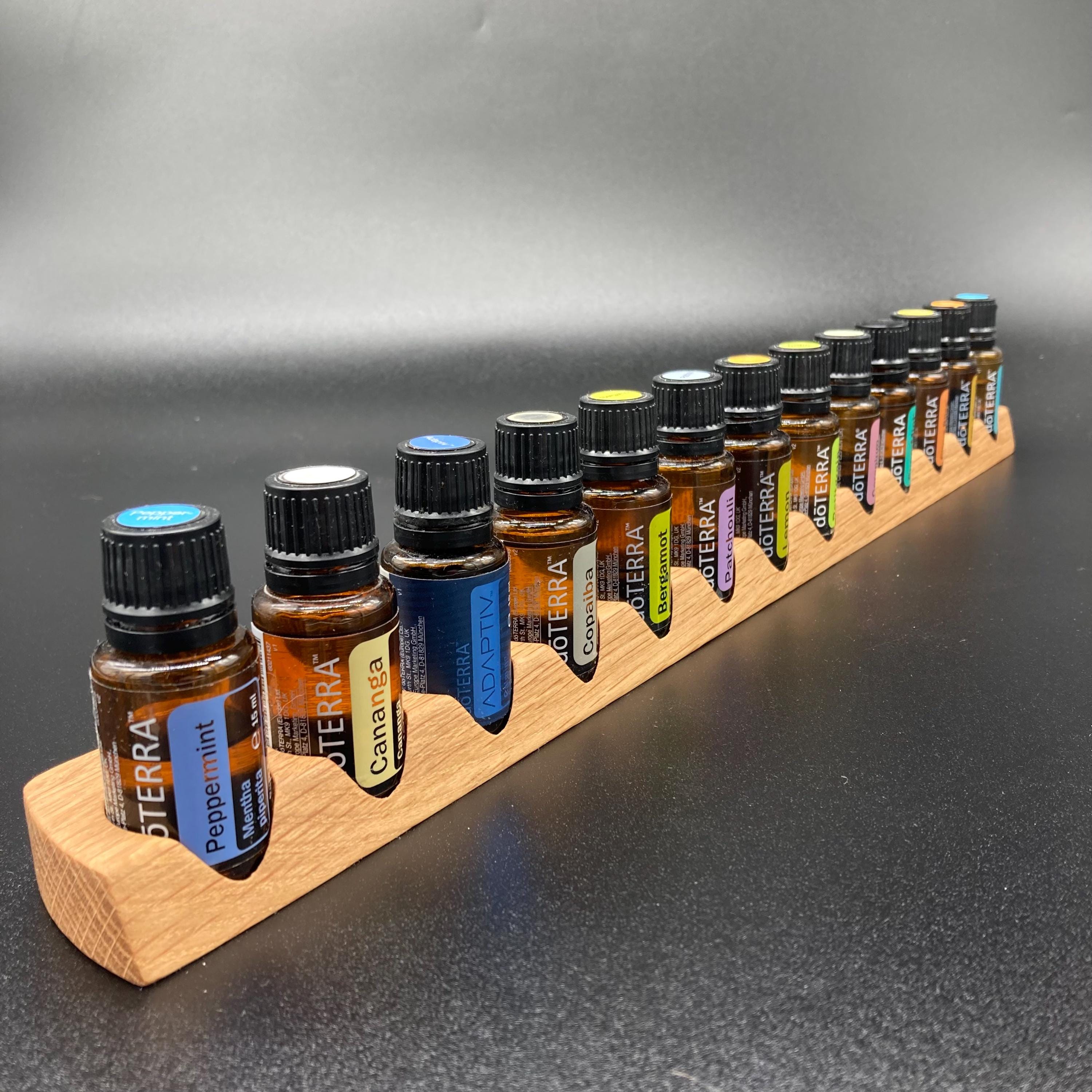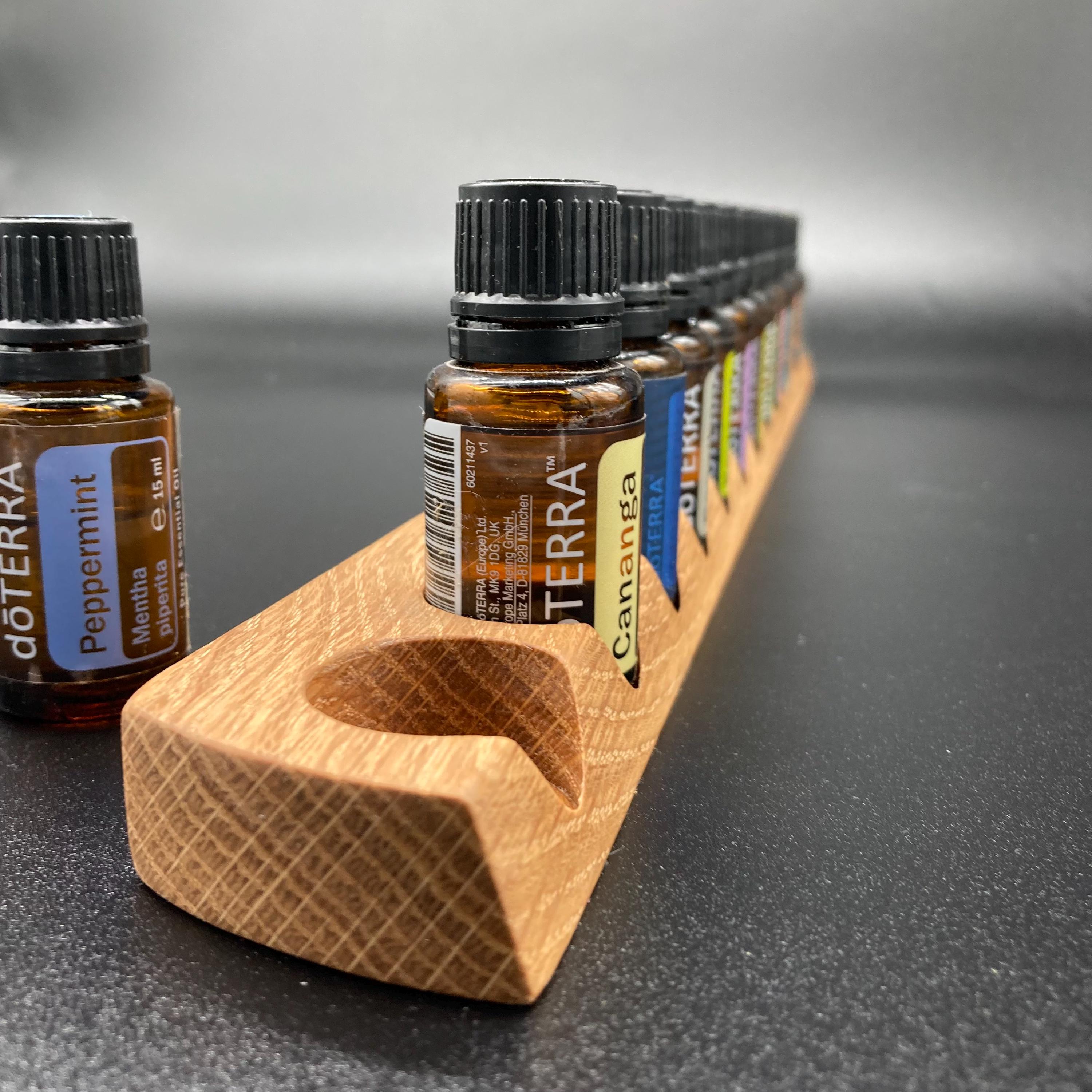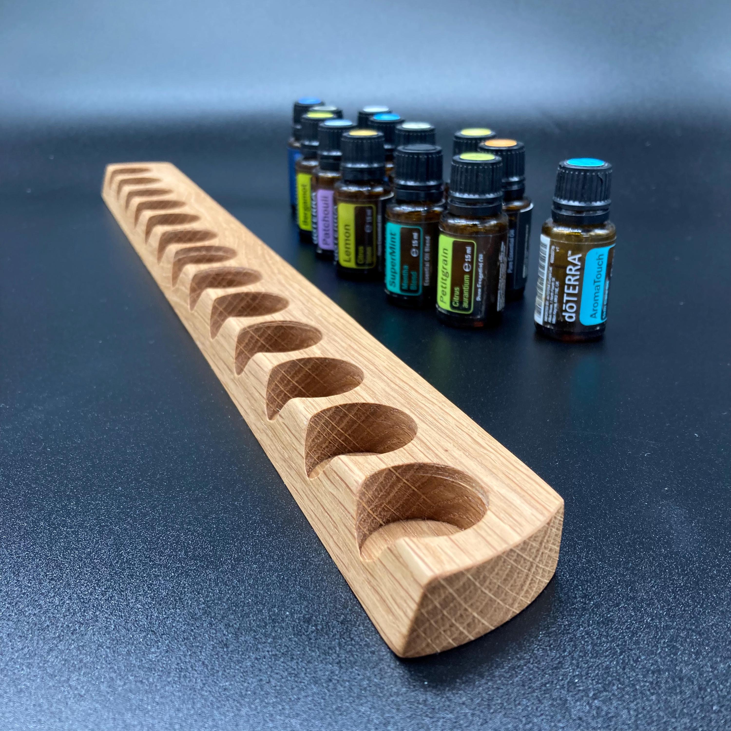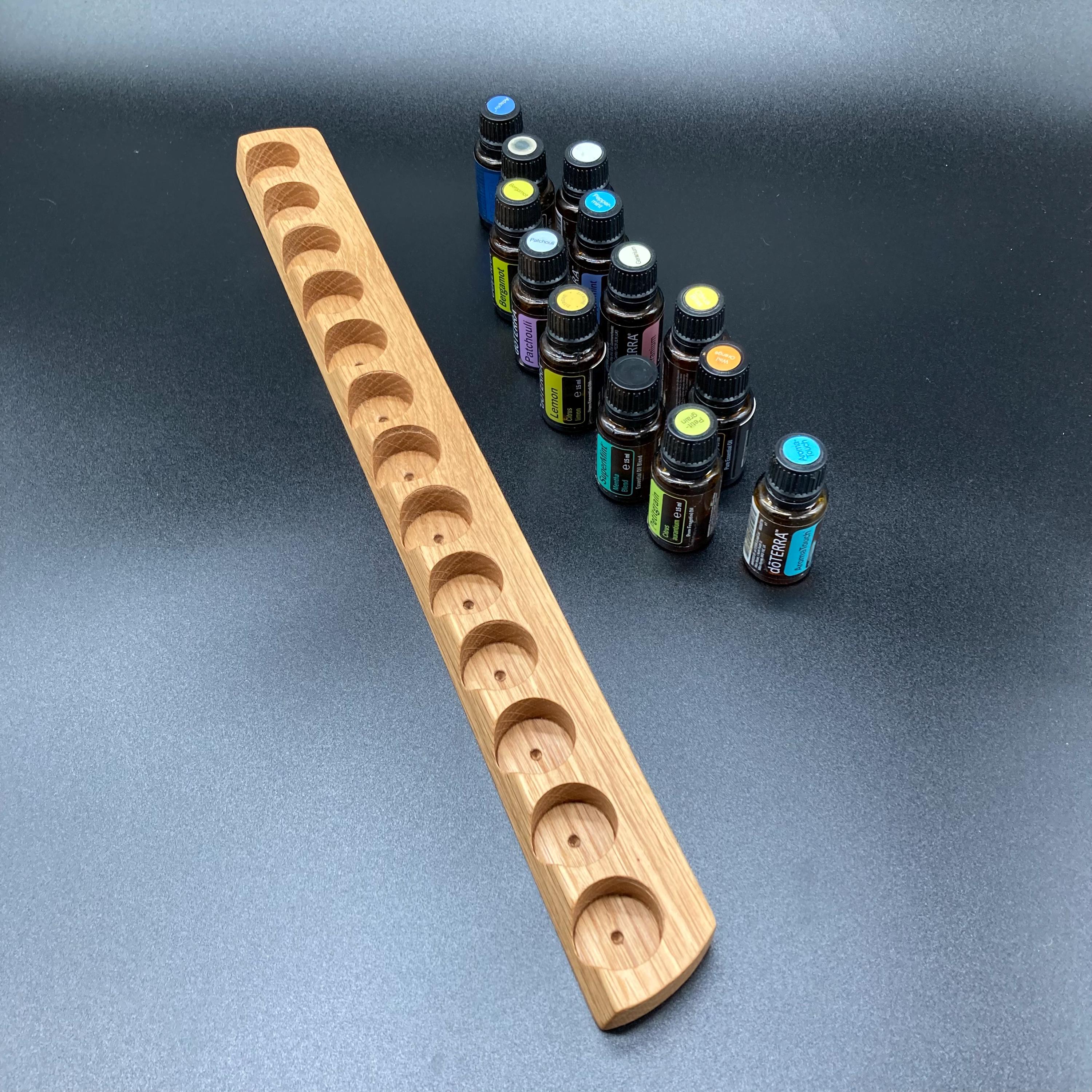 This display is ideal for anyone using 15ml bottles of essential oils. It holds 13 bottles (28mm diameter), with a 29mm opening. The opening's position and the cutout on the front allow you to read the labels much more easily without having to lift the bottles. The depth of the opening is designed to prevent the bottles from falling out. This means you can confidently carry the display around the house or pick it up for demonstrations, perfectly showcasing your oils. All of this improves handling and organization, and it also looks incredibly chic and elegant.