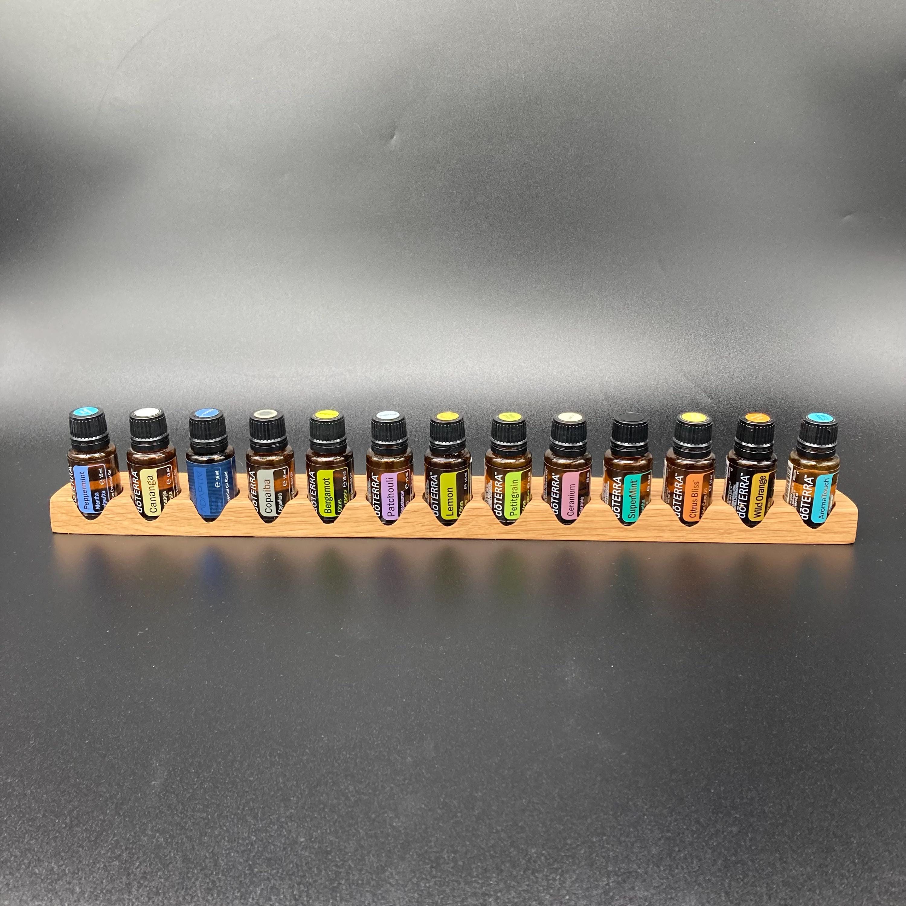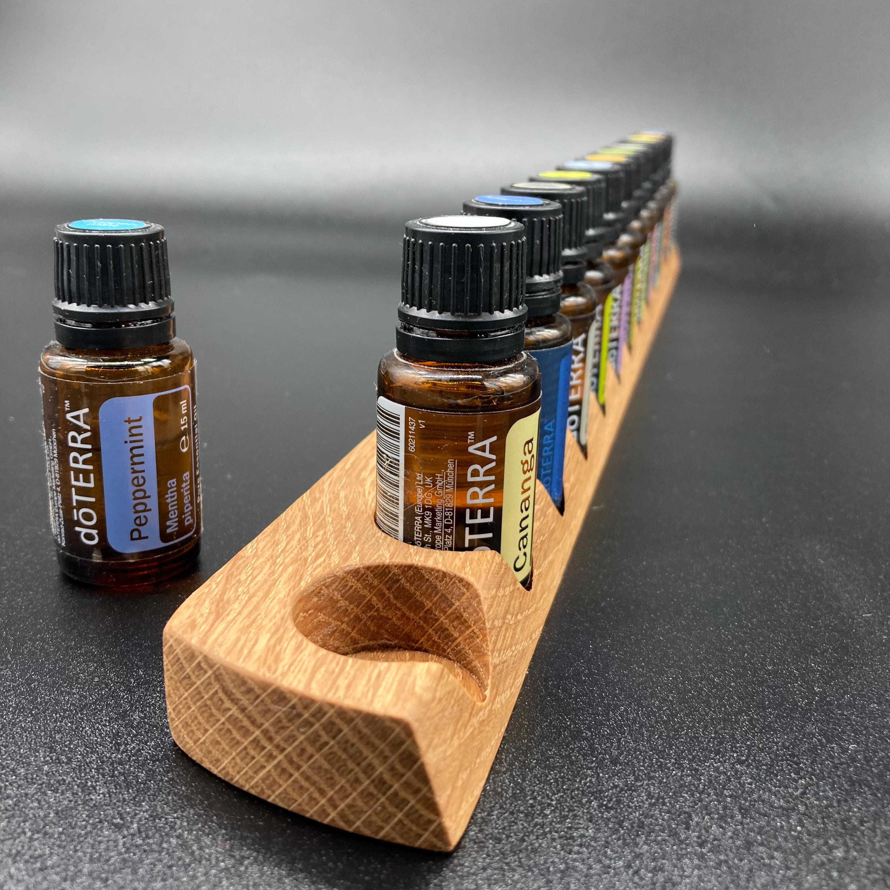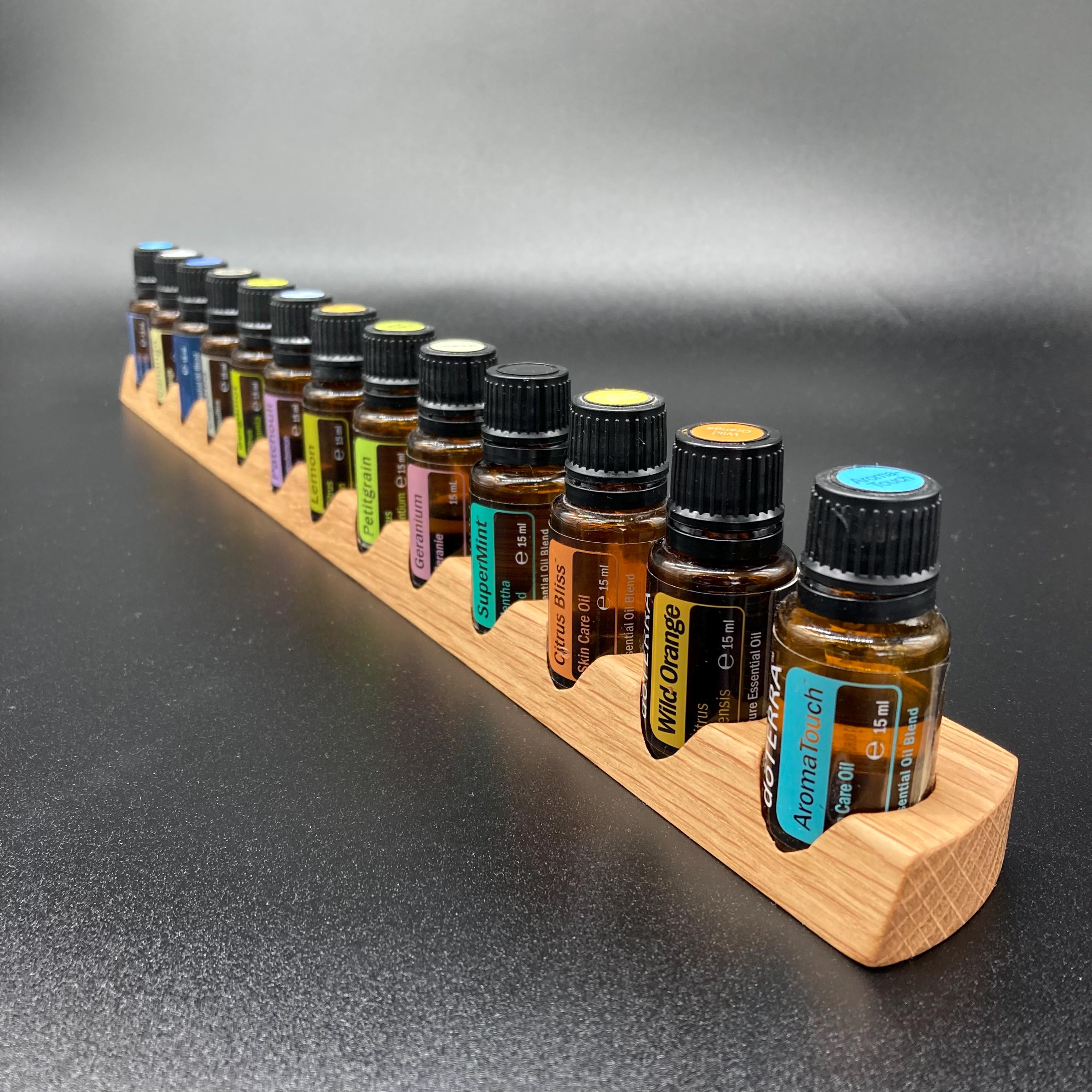 This display is ideal for anyone using 15ml bottles of essential oils. It holds 13 bottles (28mm diameter), with a 29mm opening. The opening's position and the cutout on the front allow you to read the labels much more easily without having to lift the bottles. The depth of the opening is designed to prevent the bottles from falling out. This means you can confidently carry the display around the house or pick it up for demonstrations, perfectly showcasing your oils. All of this improves handling and organization, and it also looks incredibly chic and elegant.
