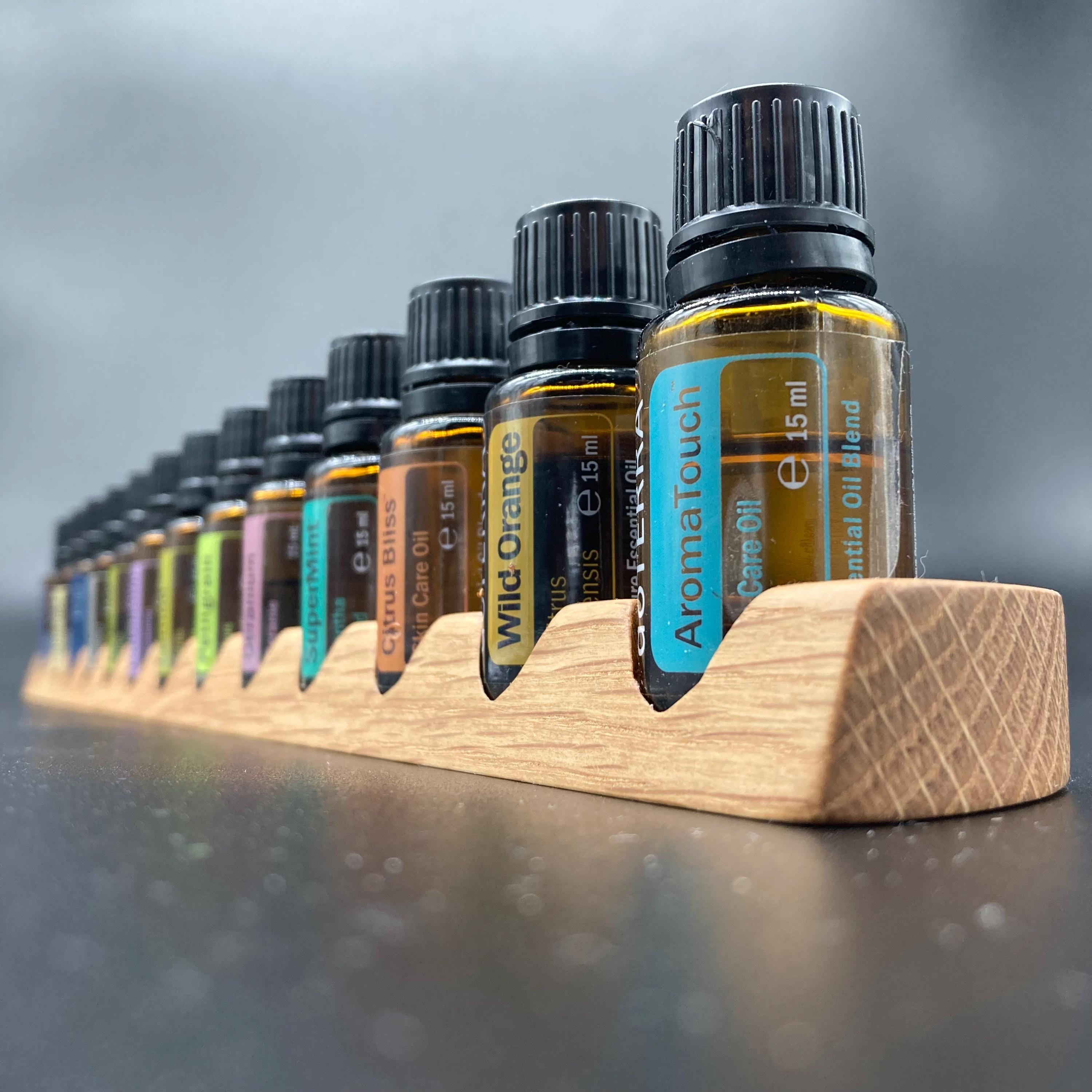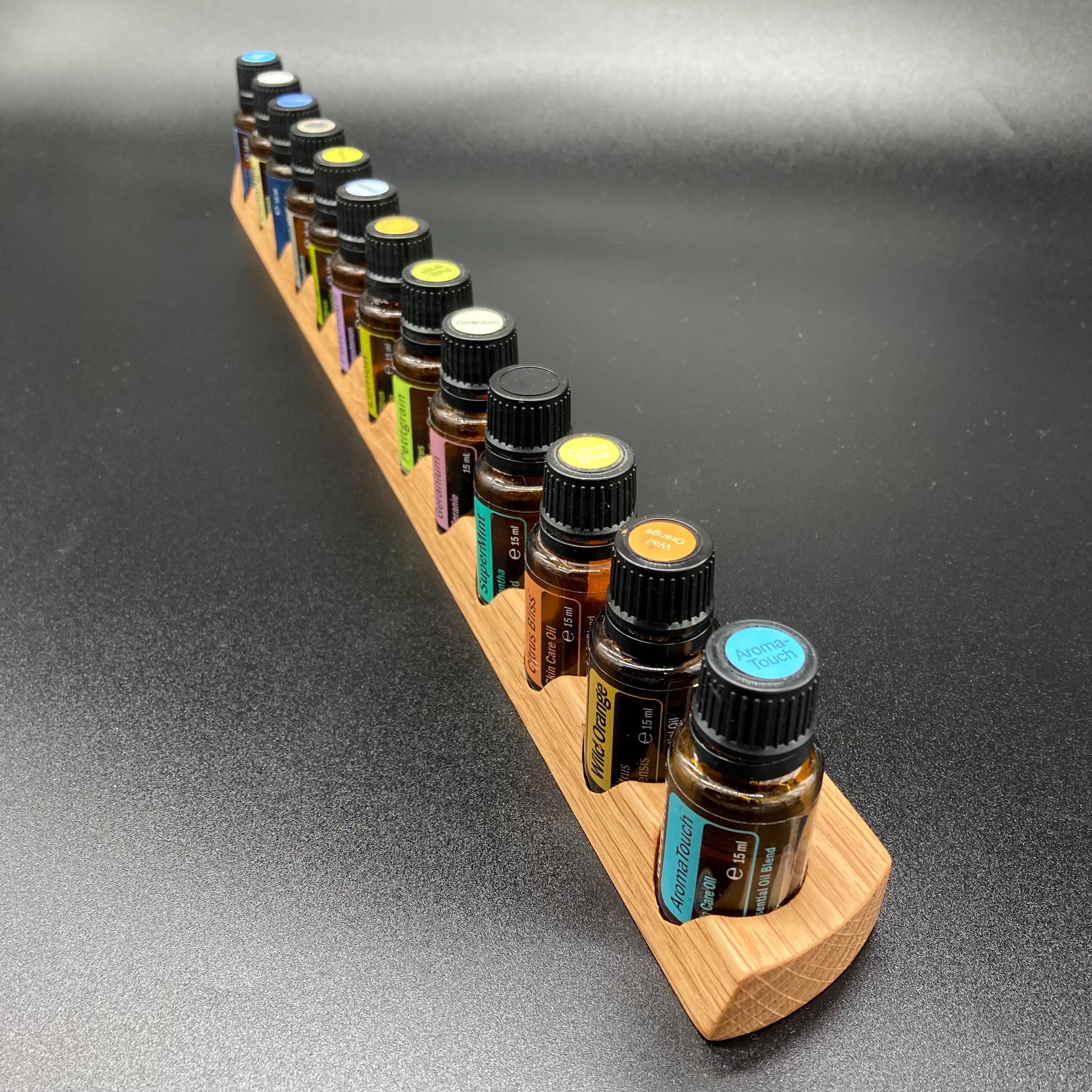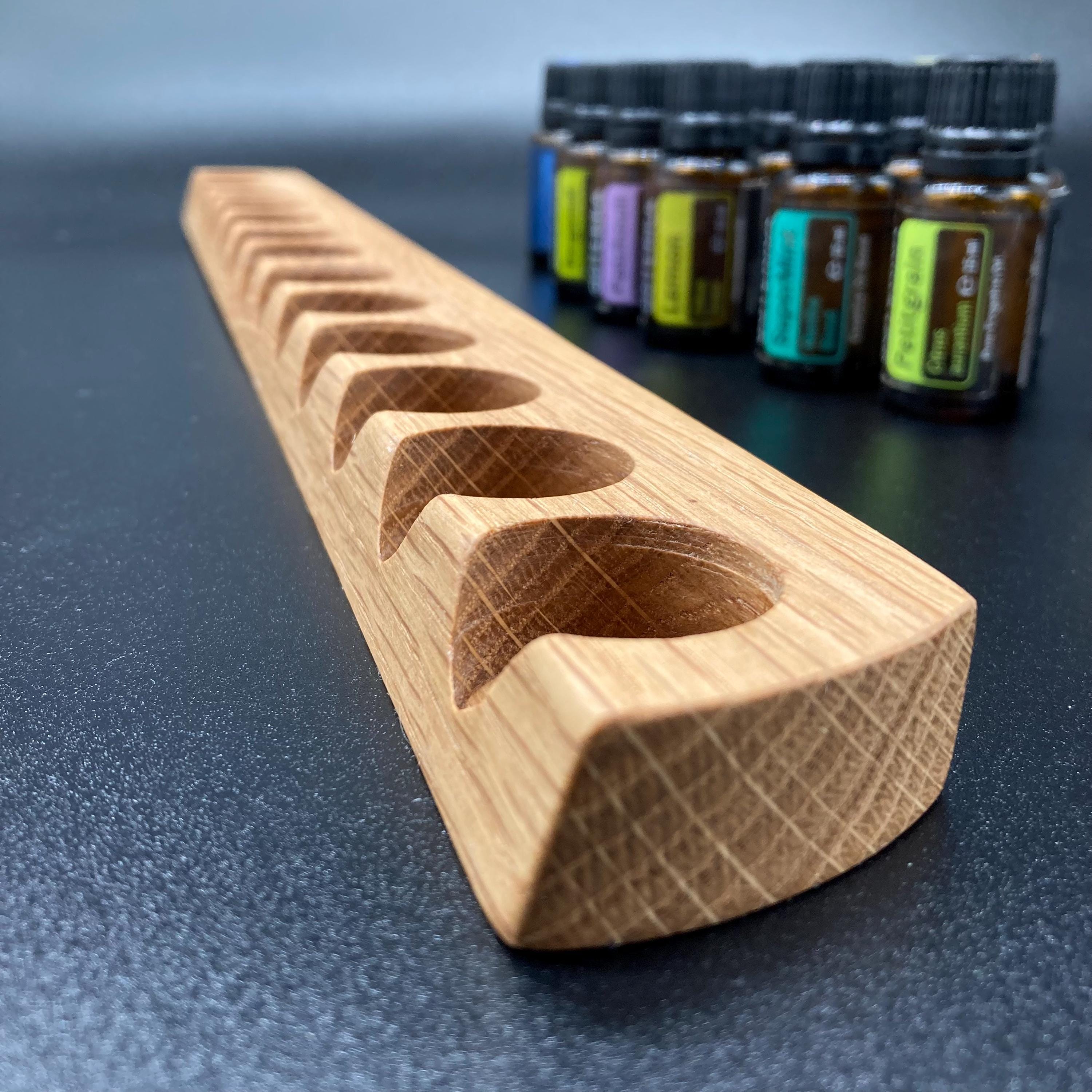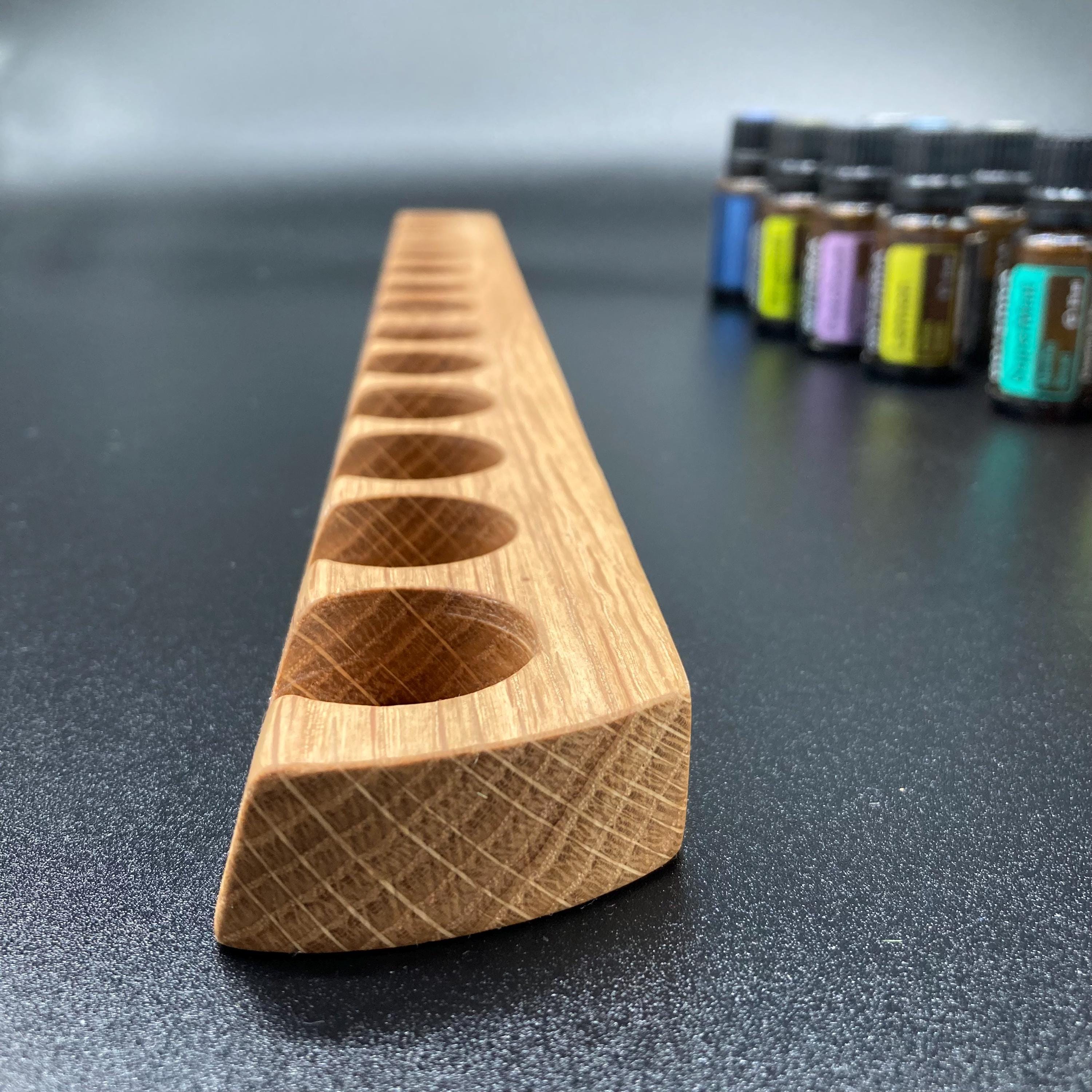 This display is ideal for anyone using 15ml bottles of essential oils. It holds 13 bottles (28mm diameter), with a 29mm opening. The opening's position and the cutout on the front allow you to read the labels much more easily without having to lift the bottles. The depth of the opening is designed to prevent the bottles from falling out. This means you can confidently carry the display around the house or pick it up for demonstrations, perfectly showcasing your oils. All of this improves handling and organization, and it also looks incredibly chic and elegant.
