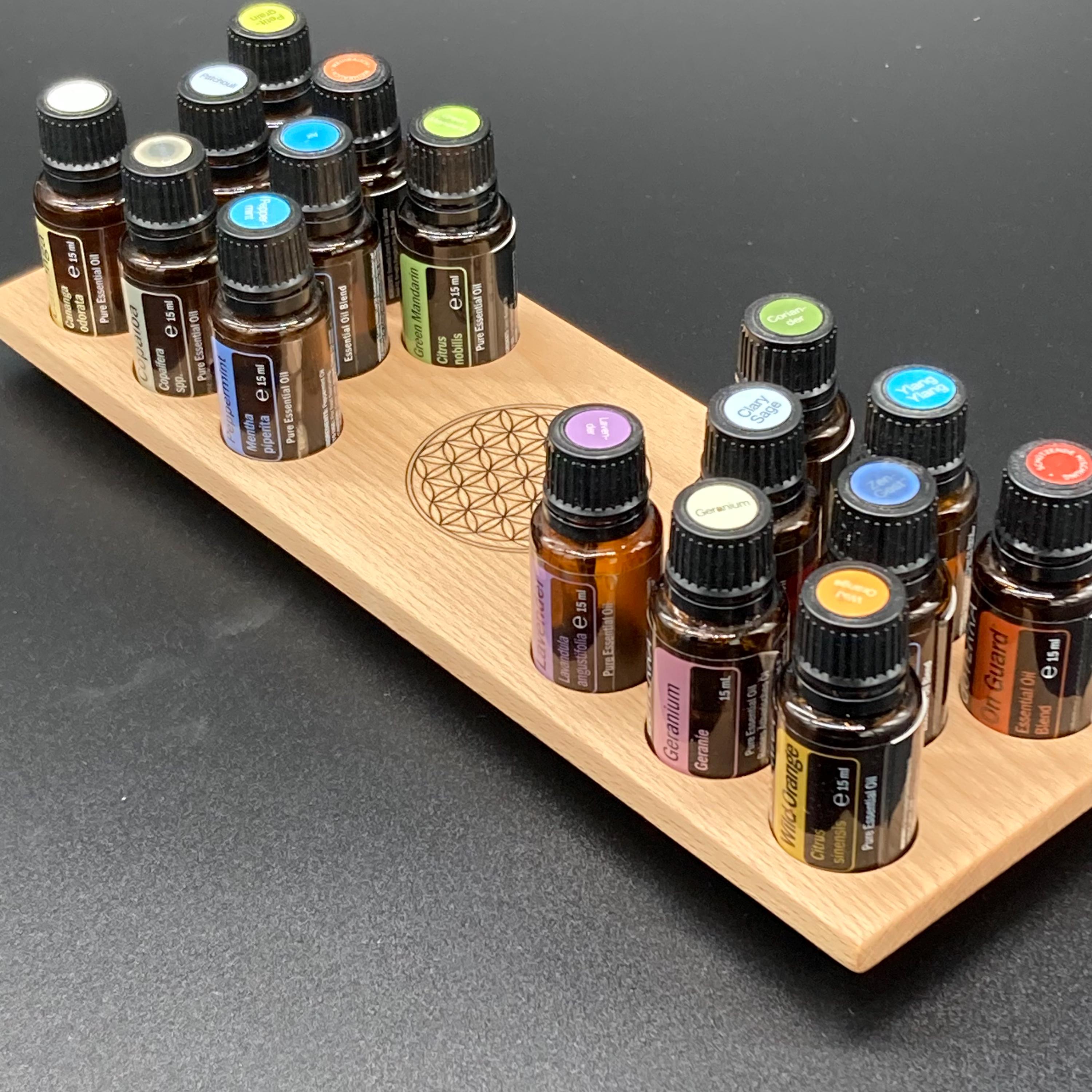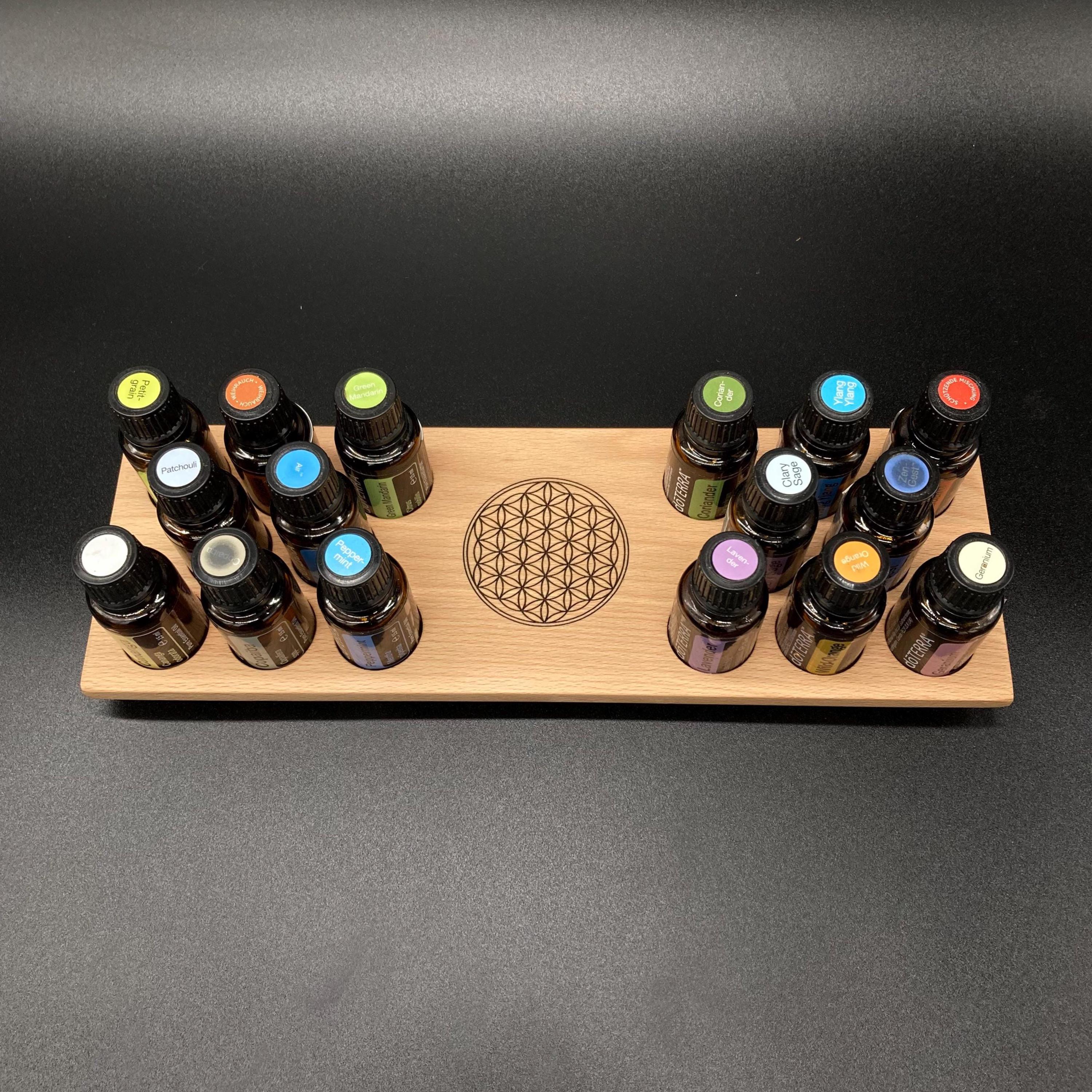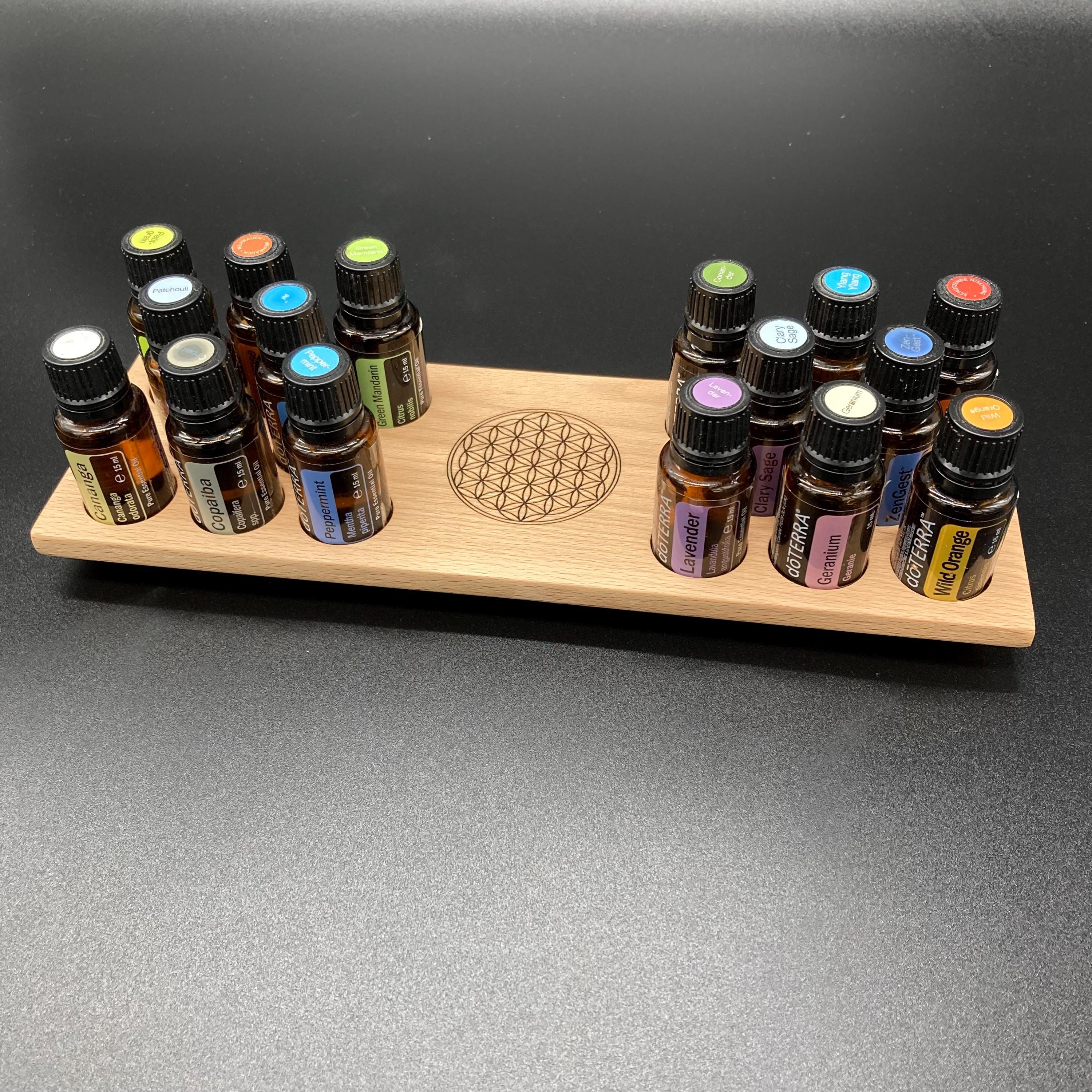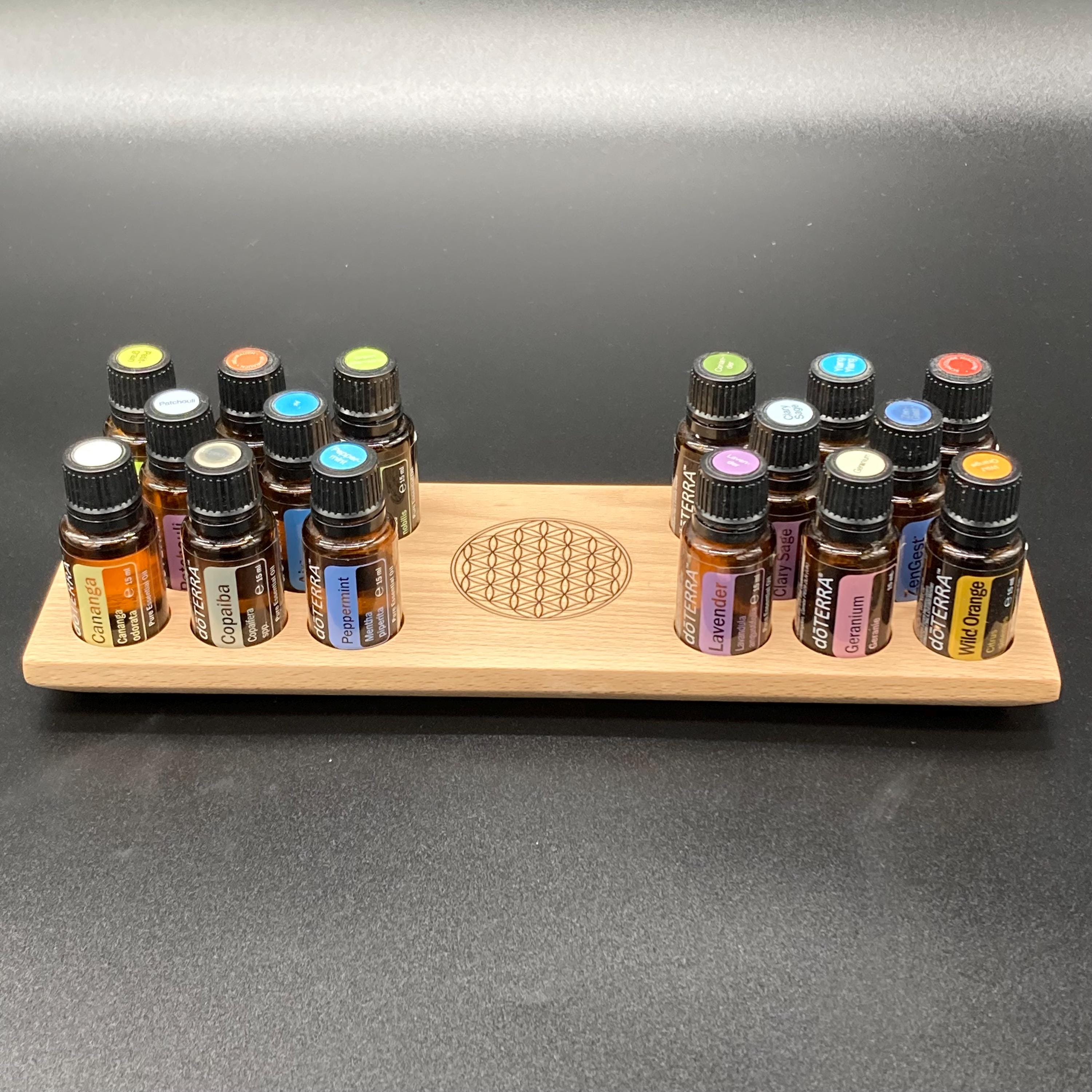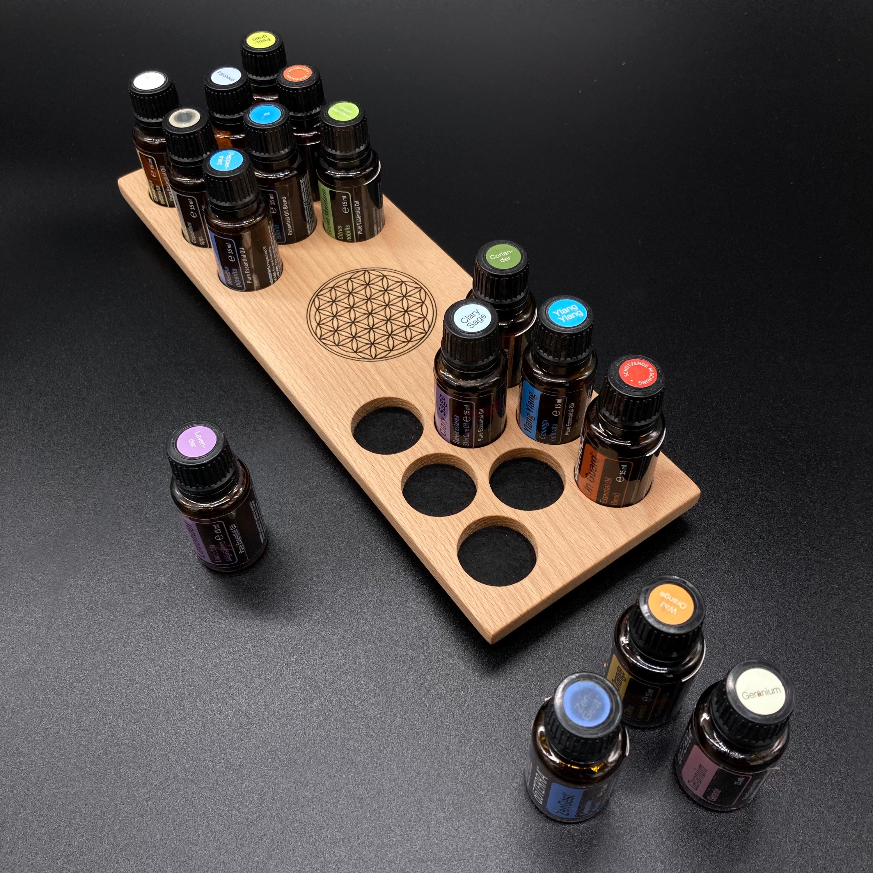 This display is ideal for anyone using 15ml bottled oils. It holds 16 oil bottles (28mm diameter). The staggered arrangement ensures that each label is easy to read. This improves handling and organization, and also looks incredibly chic and elegant.