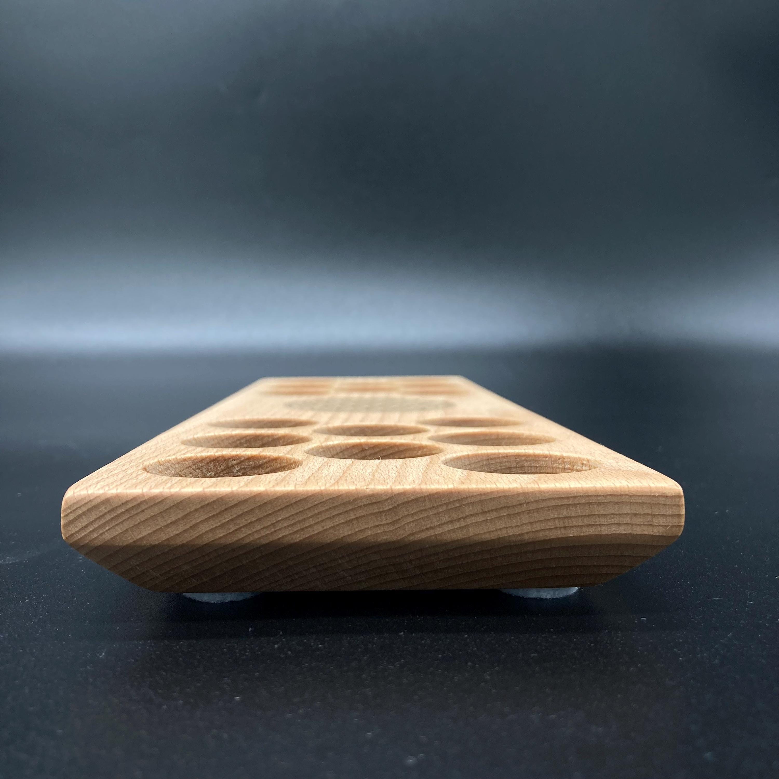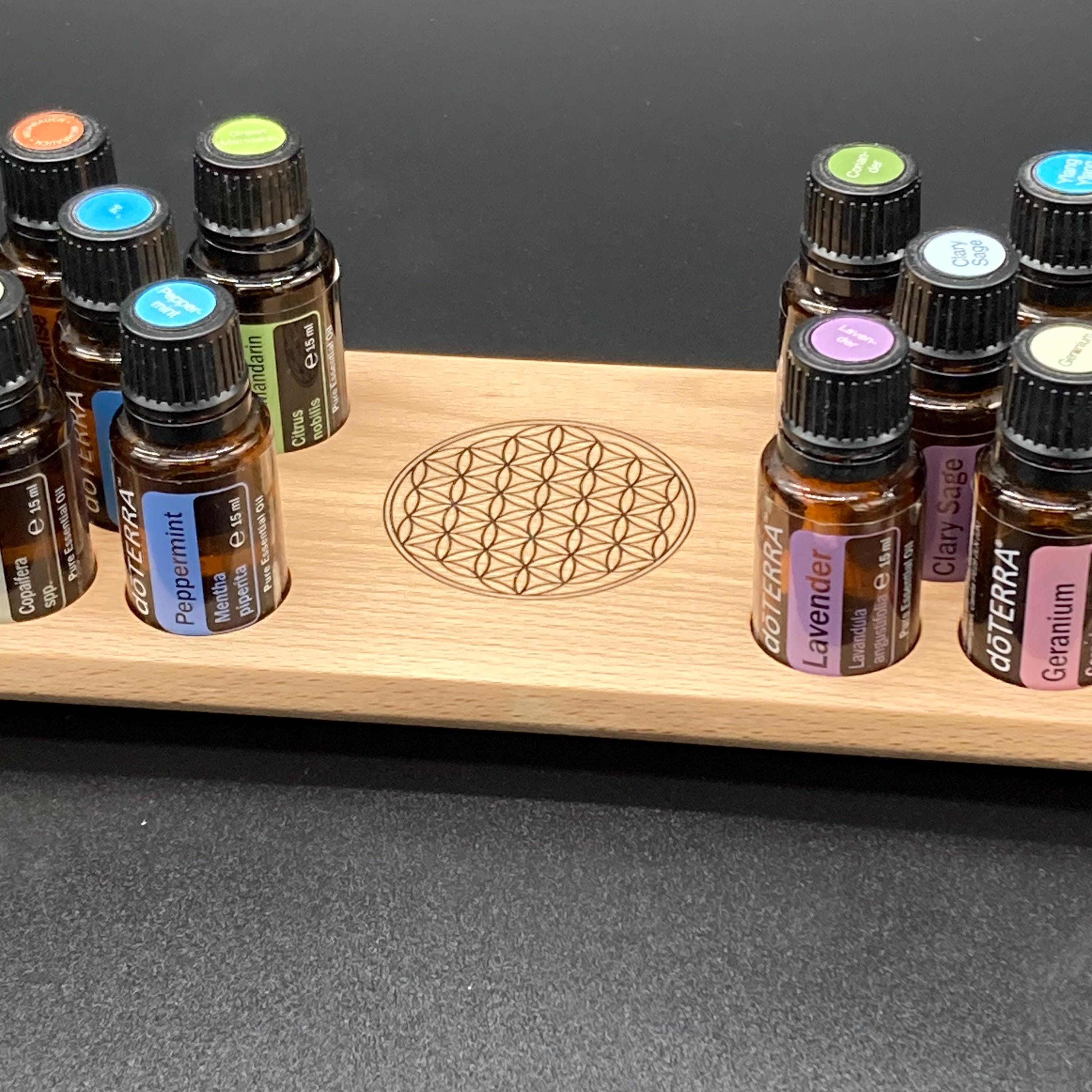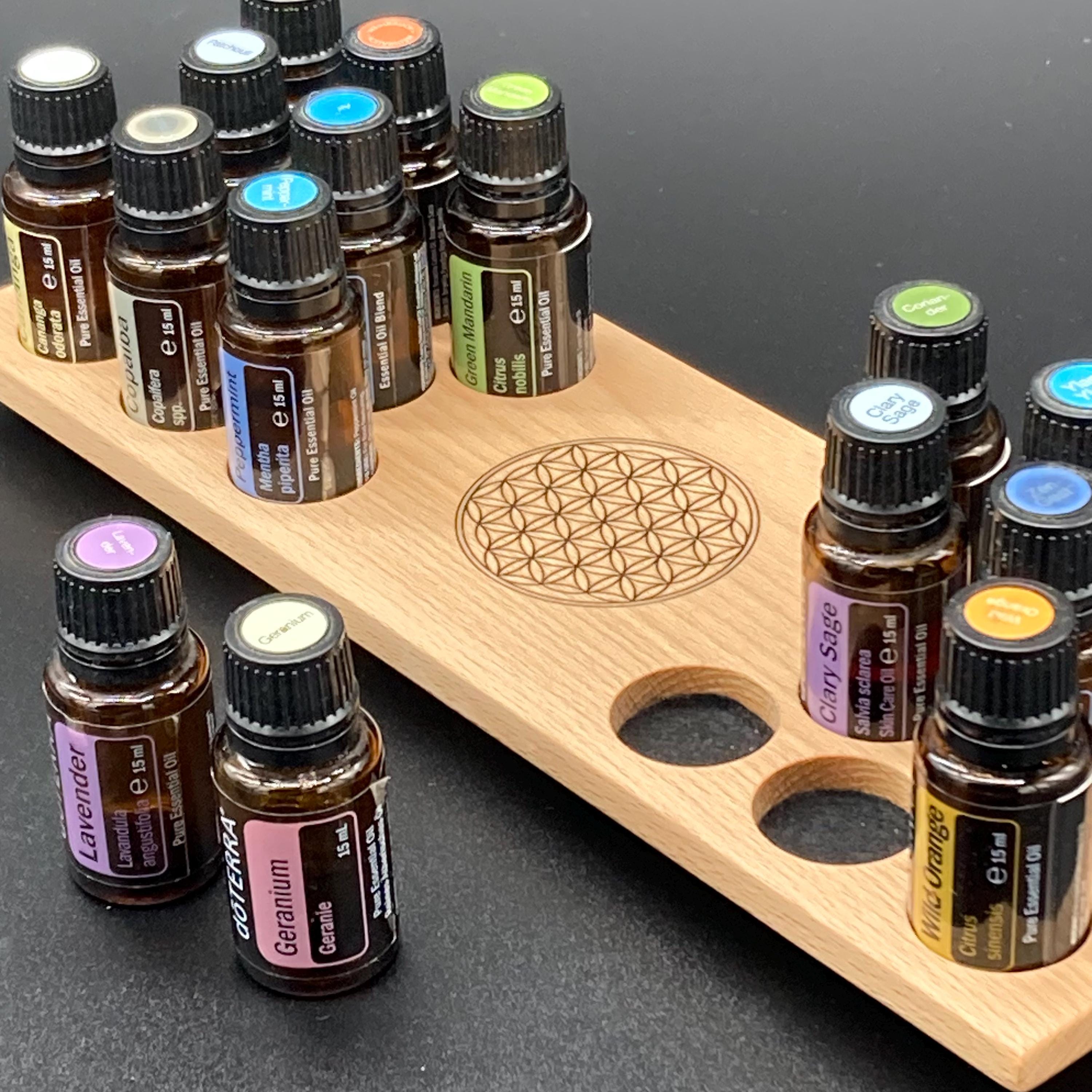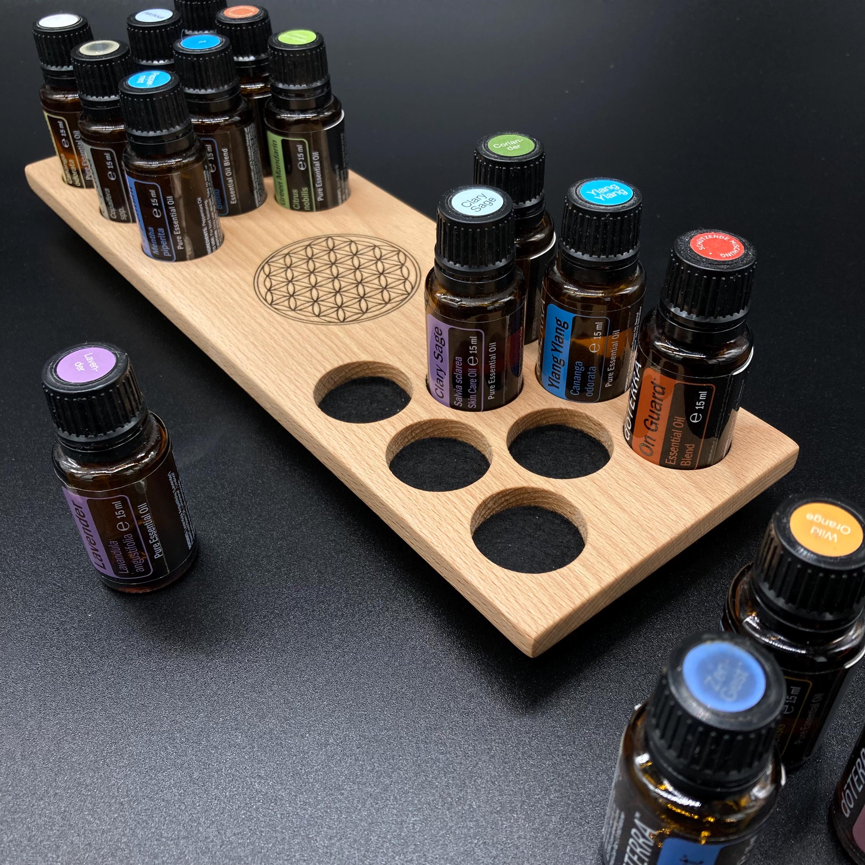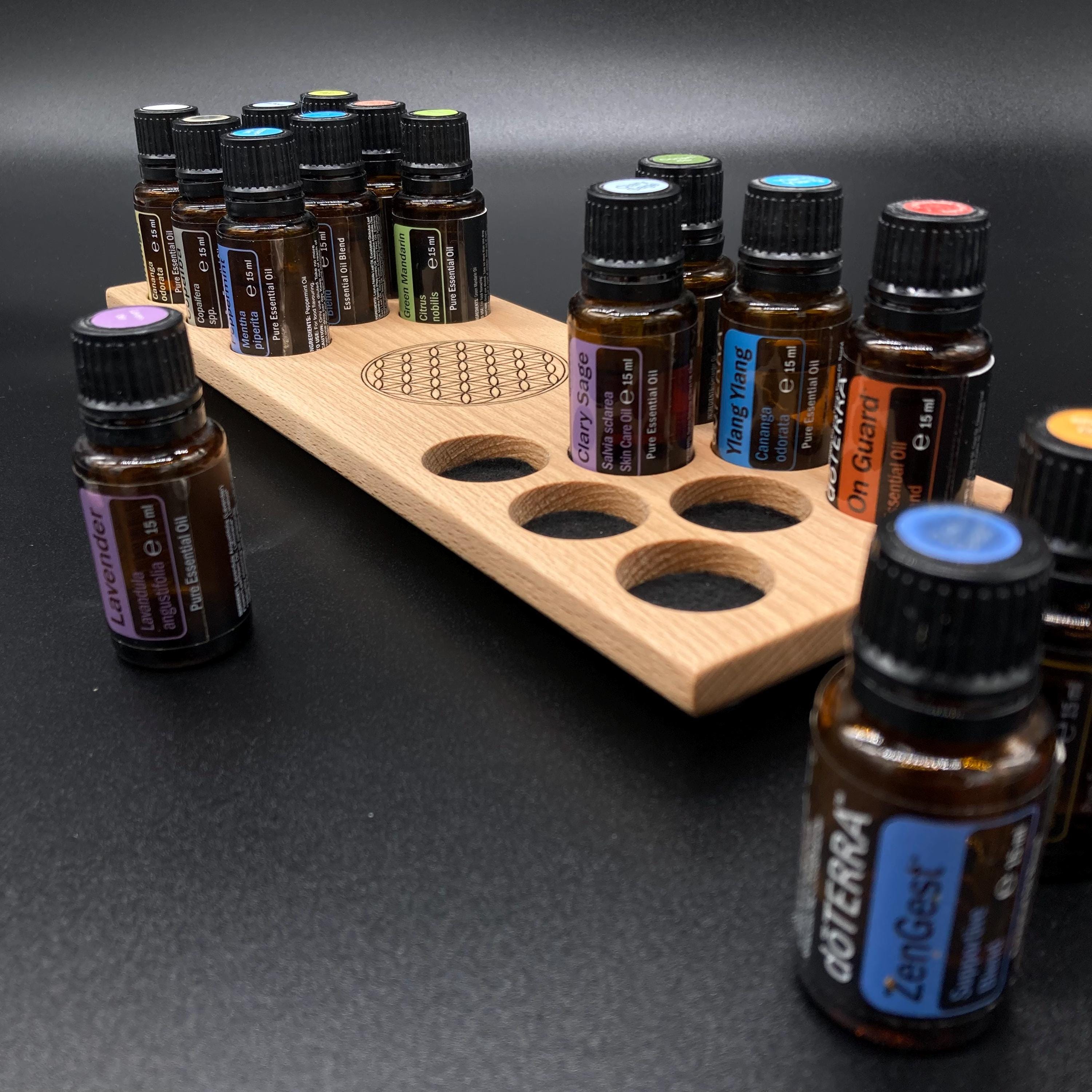 This display is ideal for anyone using 15ml bottled oils. It holds 16 oil bottles (28mm diameter). The staggered arrangement ensures that each label is easy to read. This improves handling and organization, and also looks incredibly chic and elegant.