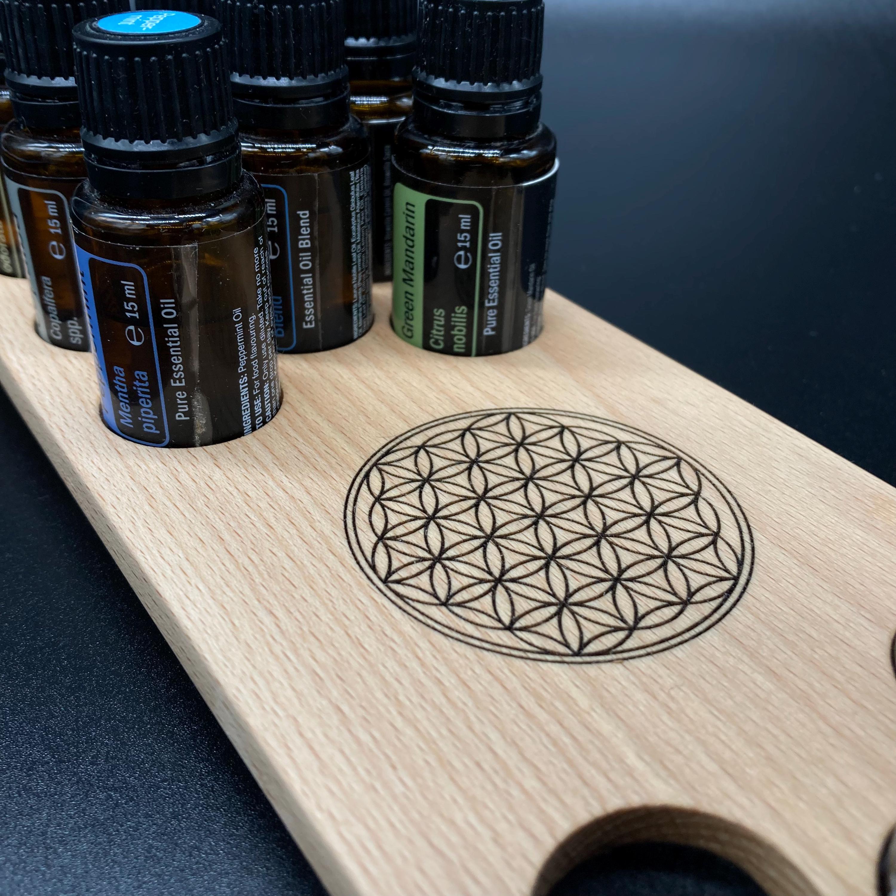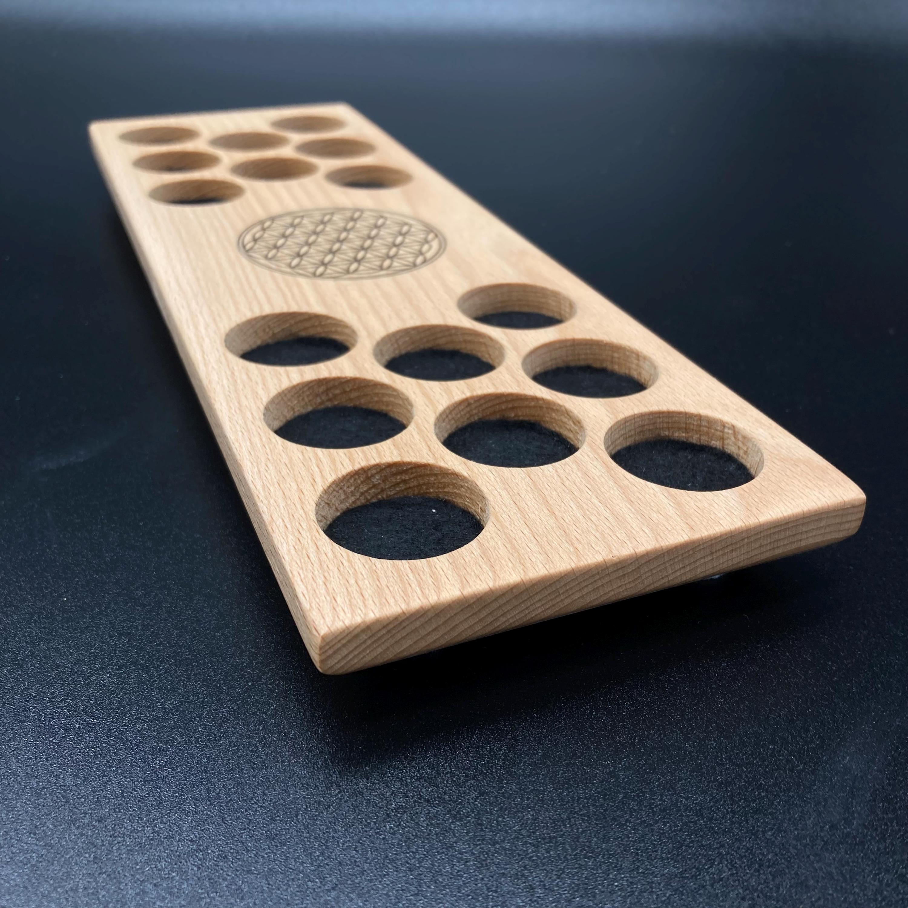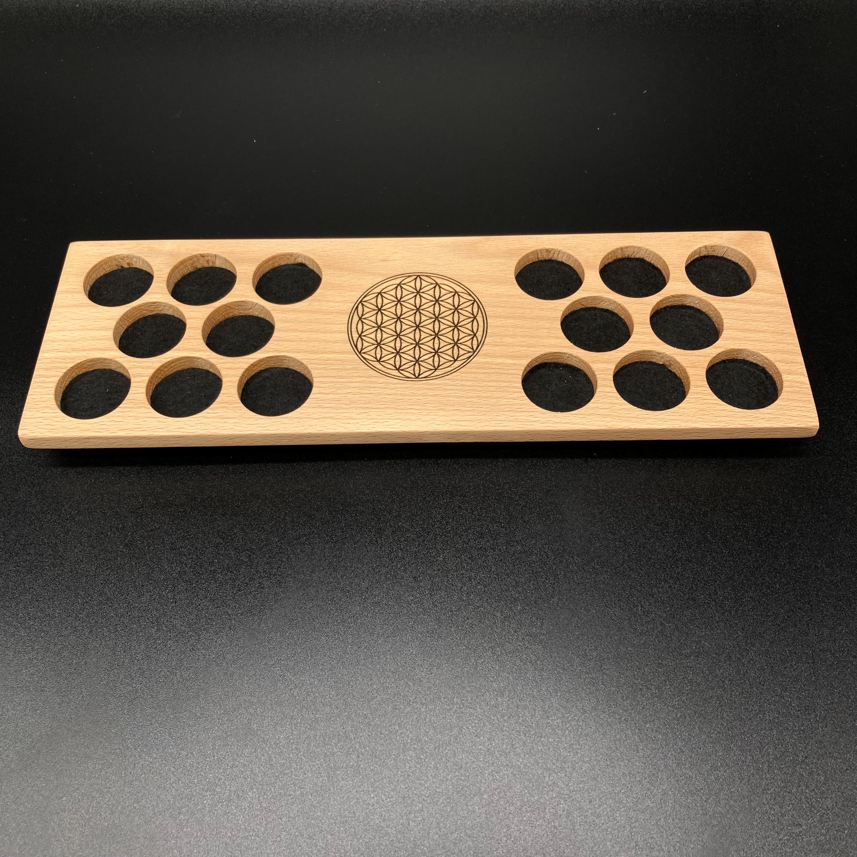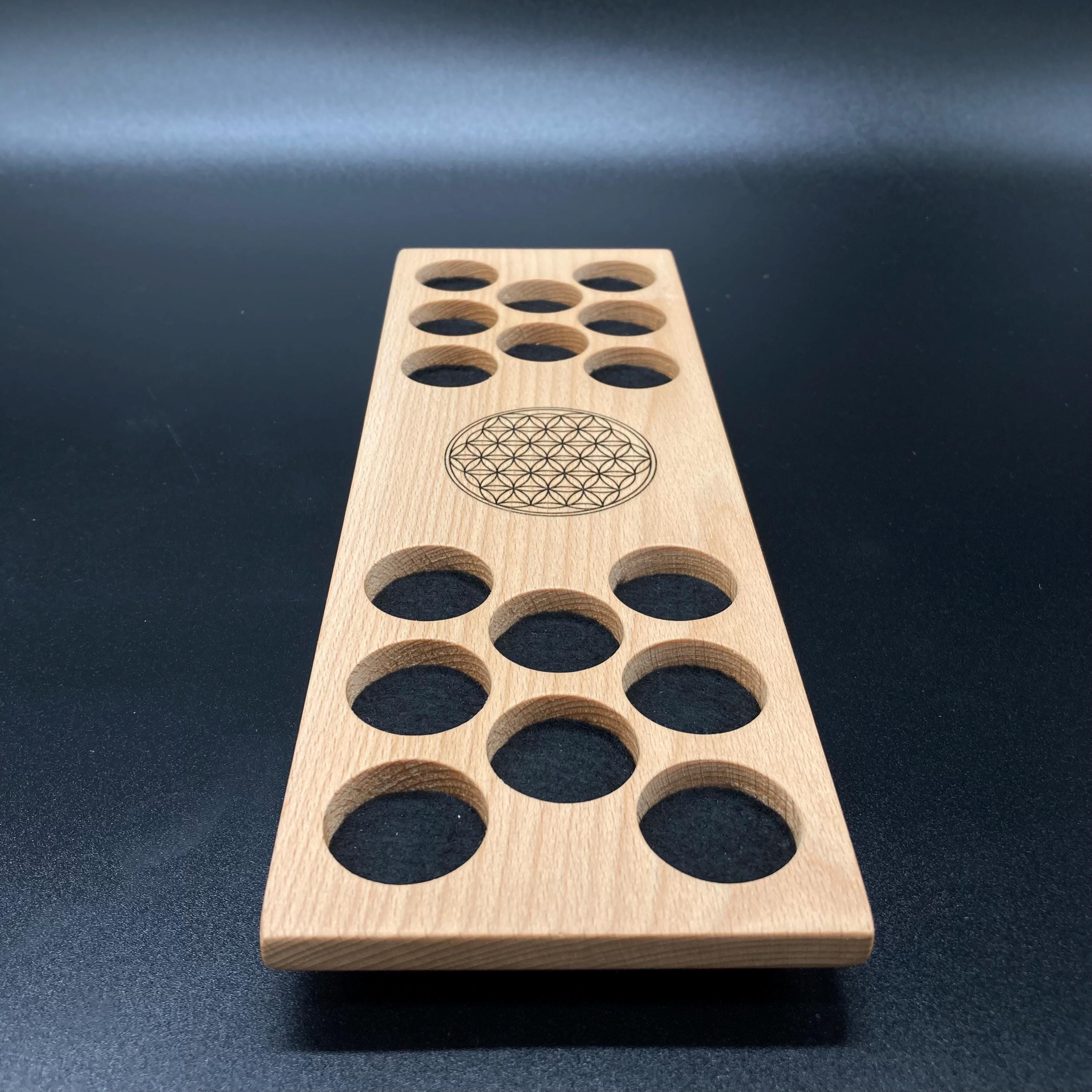 A "Flower of Life" is engraved in the center of the display. The holes are lined with fine felt.