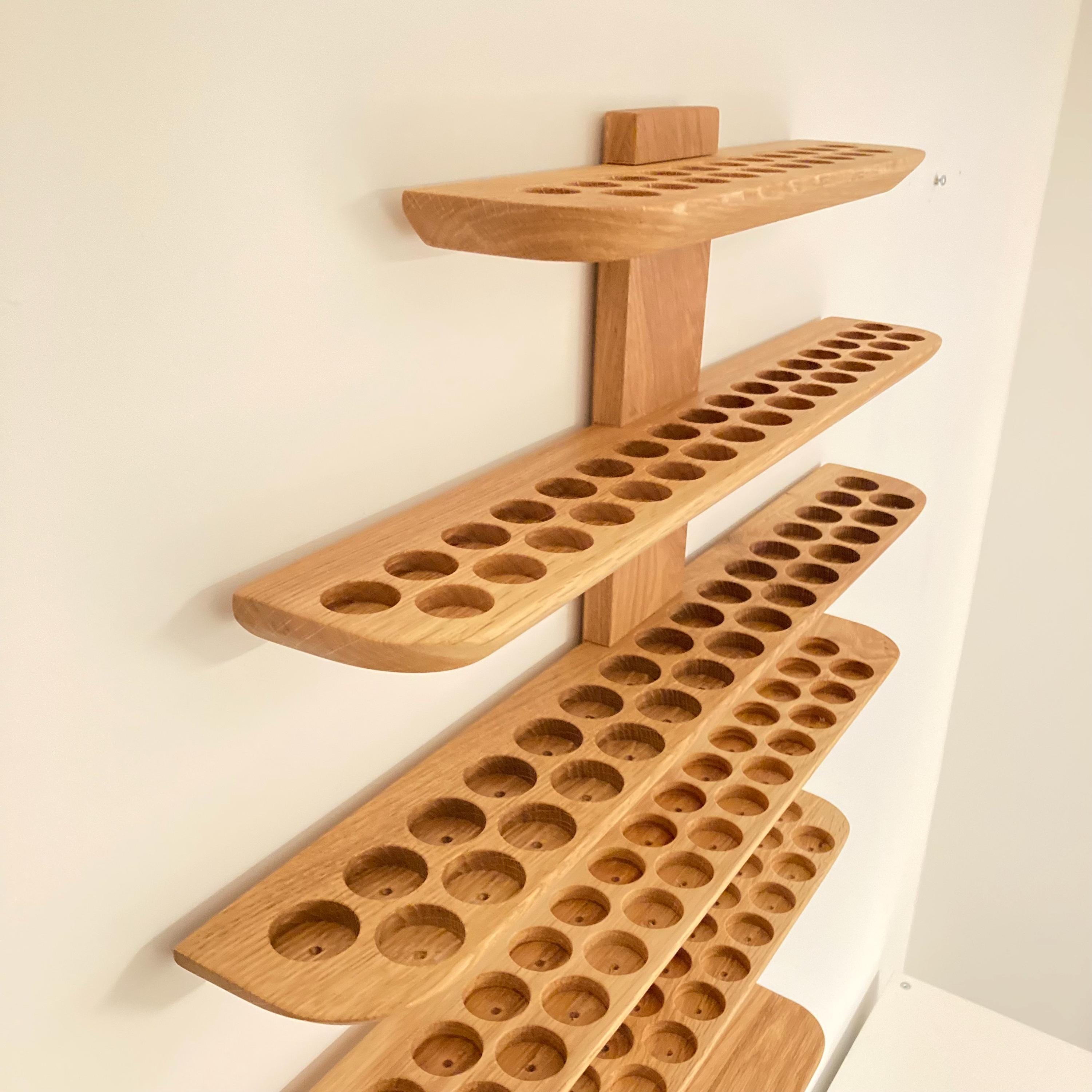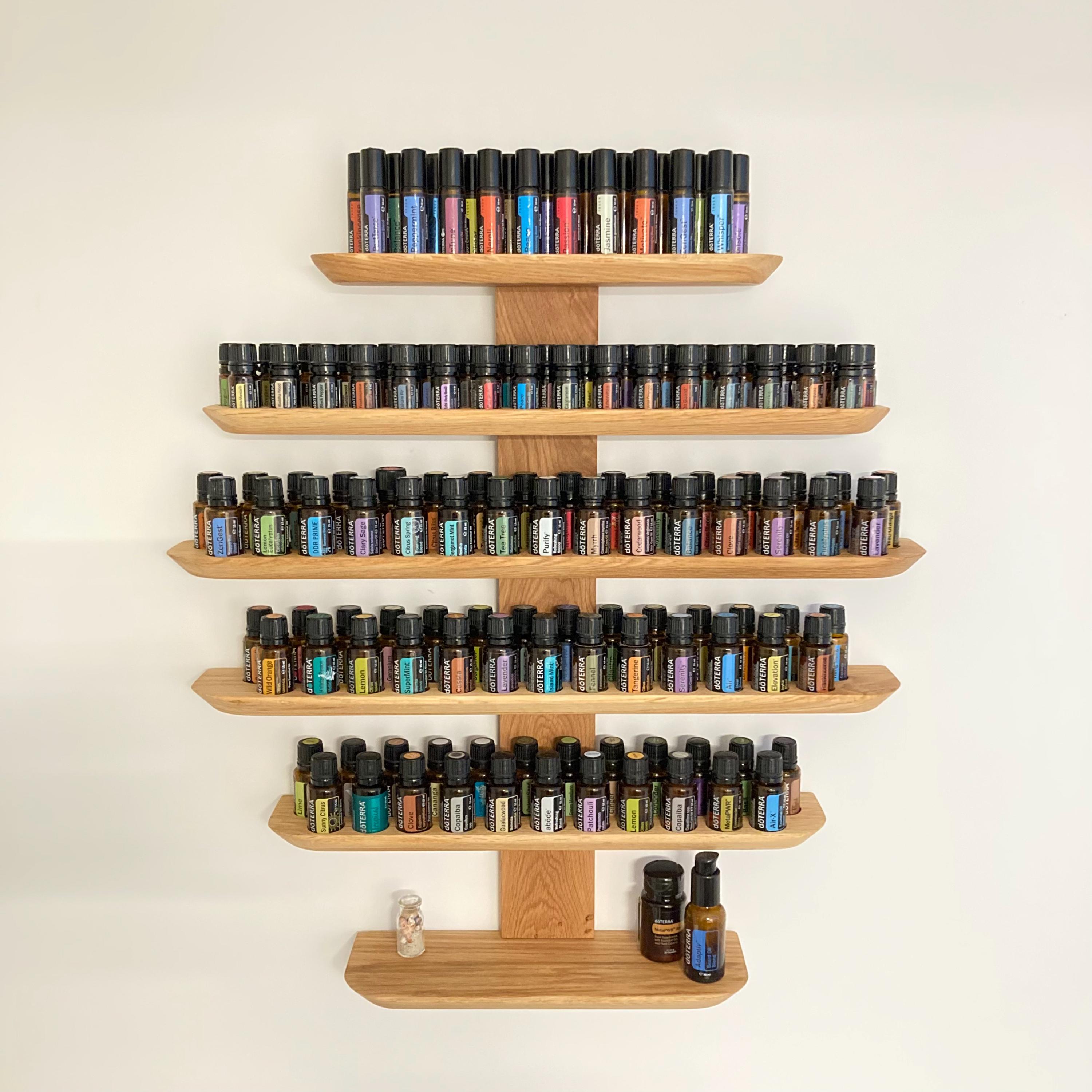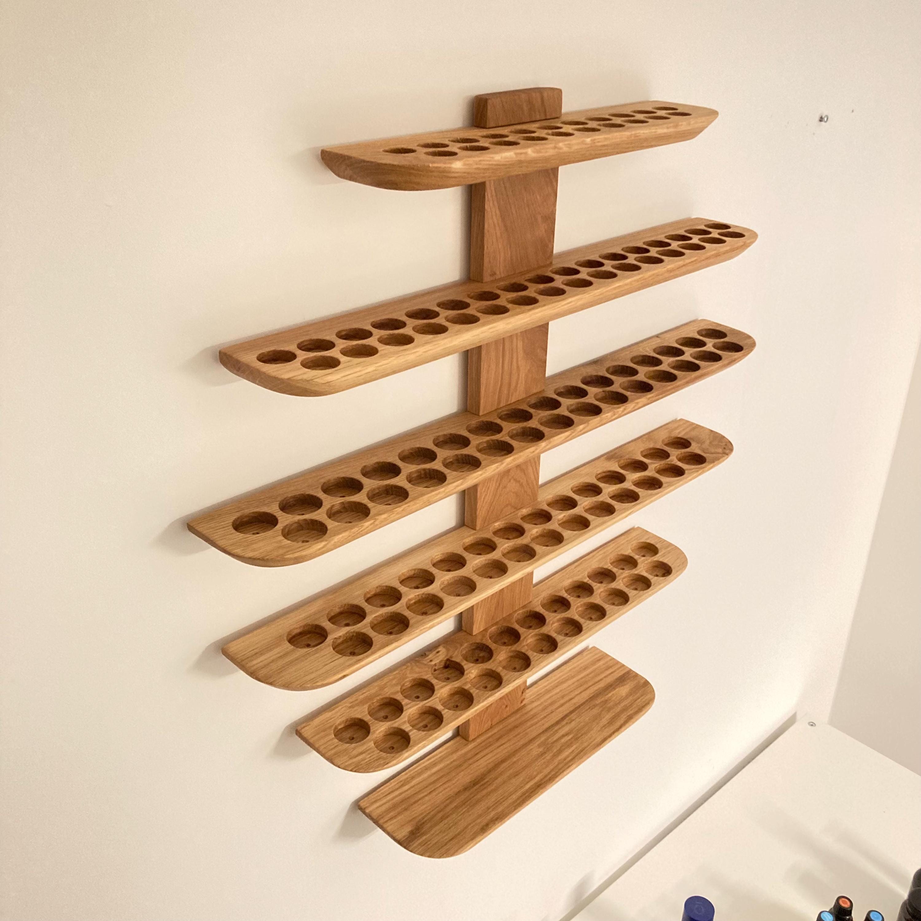 This wall-mounted oil rack is ideal for anyone using 15ml and 5ml oils, as well as 10ml roll-on bottles. It holds 81 oil bottles (29mm diameter).