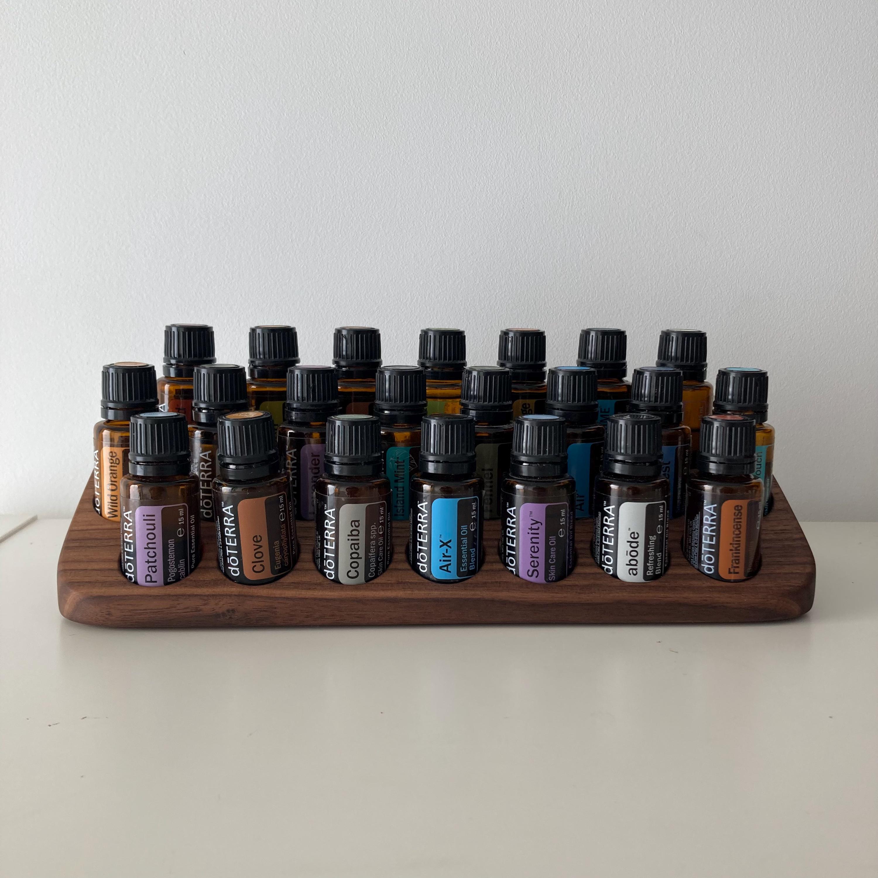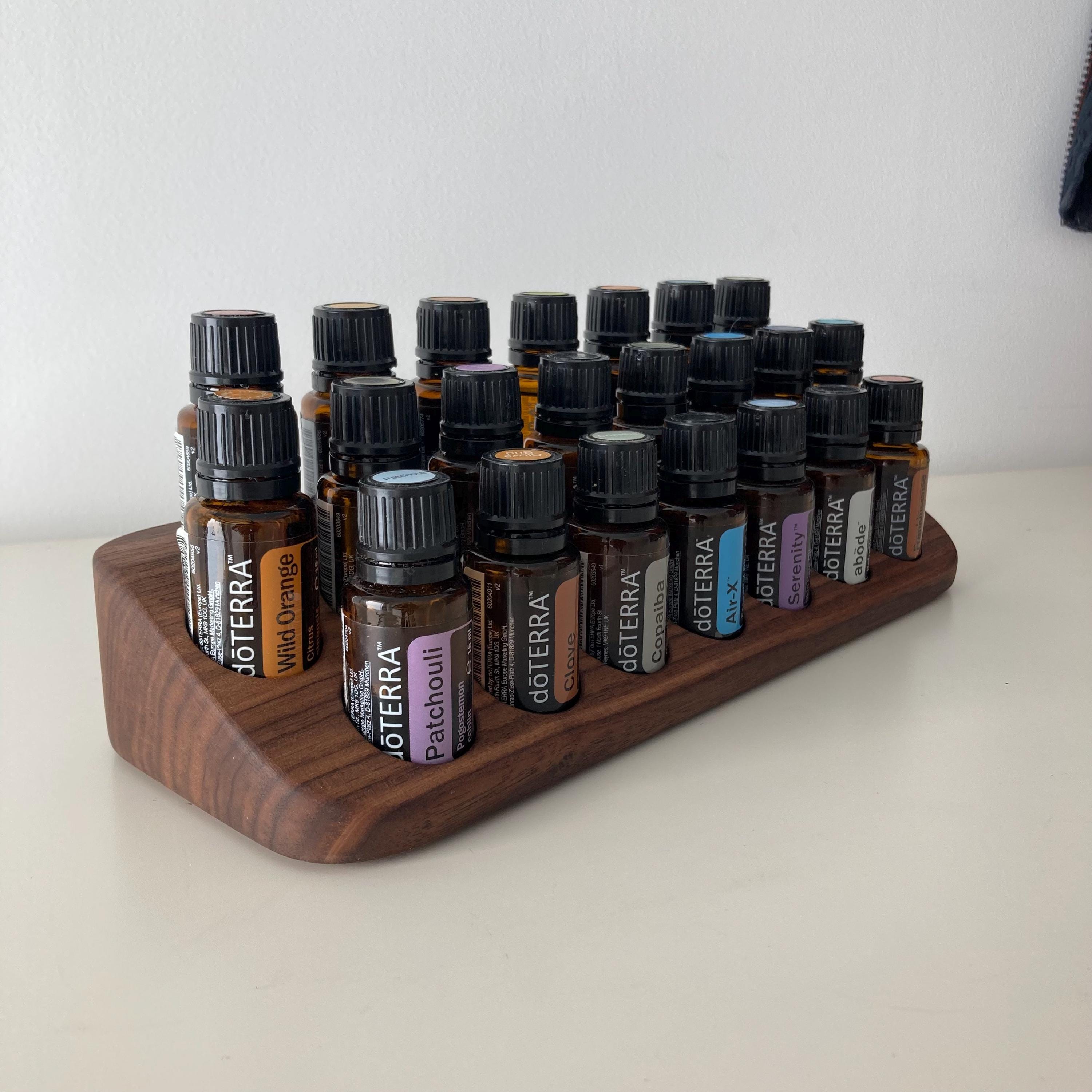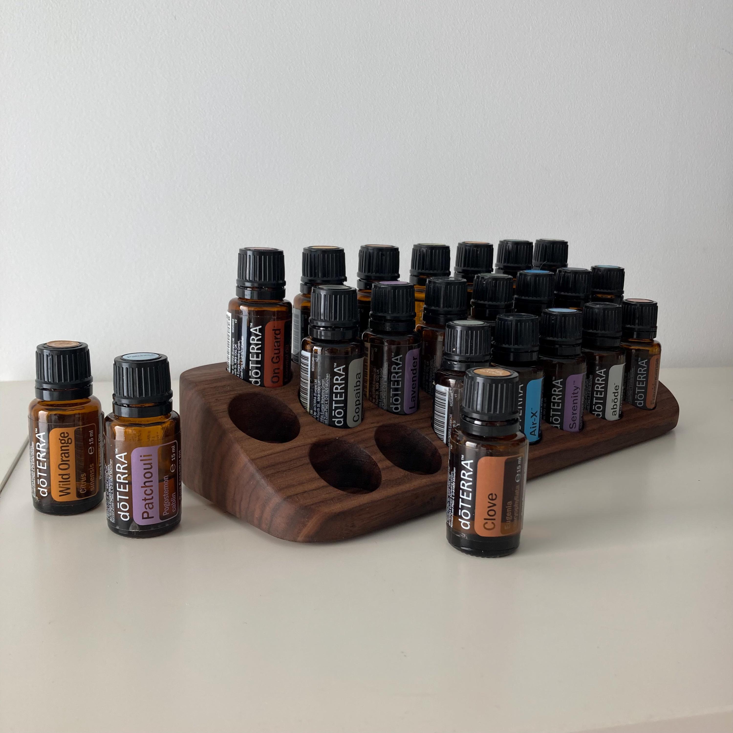 This display is ideal for all essential oils in 15ml bottles. It holds 22 oil bottles (28mm diameter). The staggered arrangement ensures that each label is easy to read. The front of the display is slightly angled, improving handling and visibility, and also giving it a very chic and elegant look.