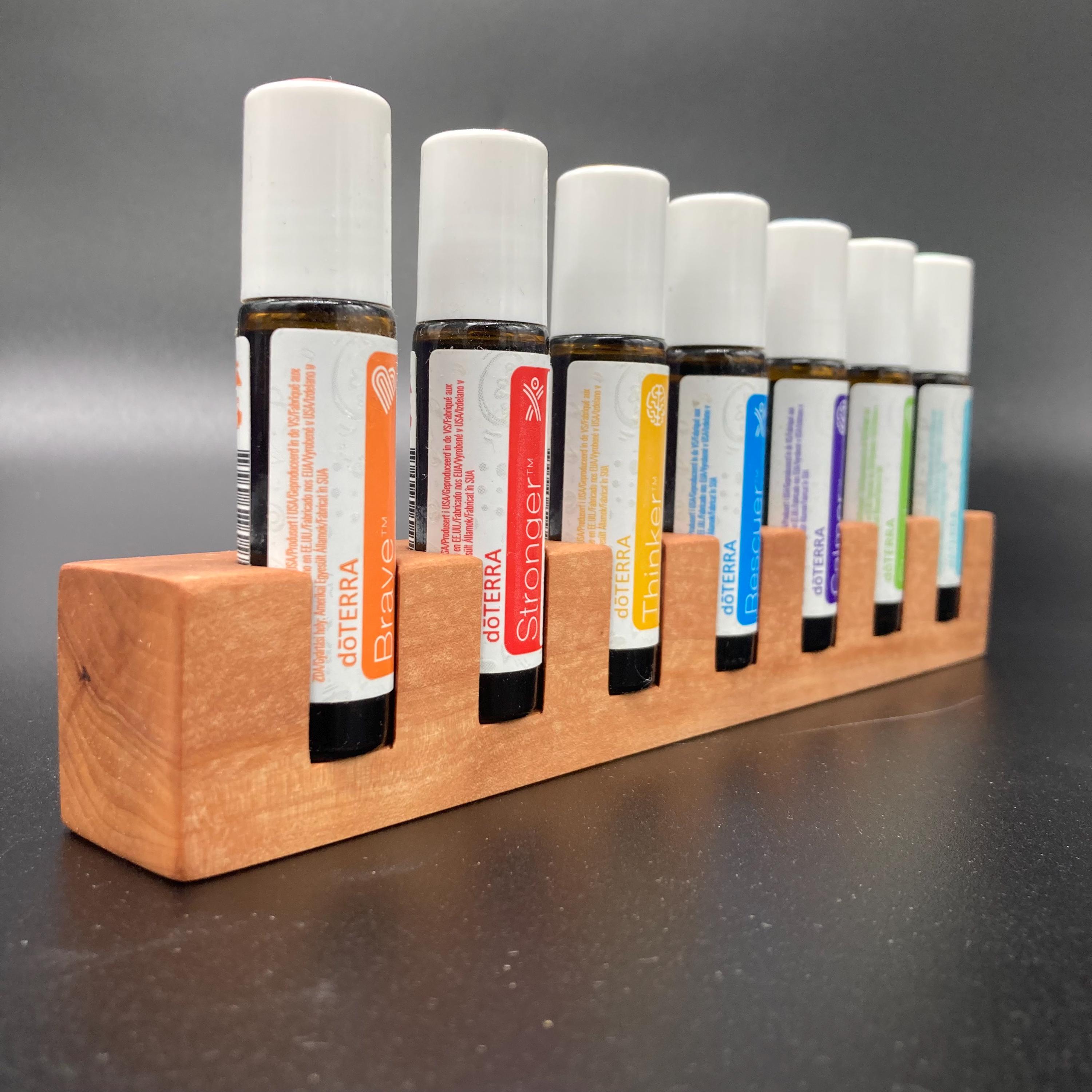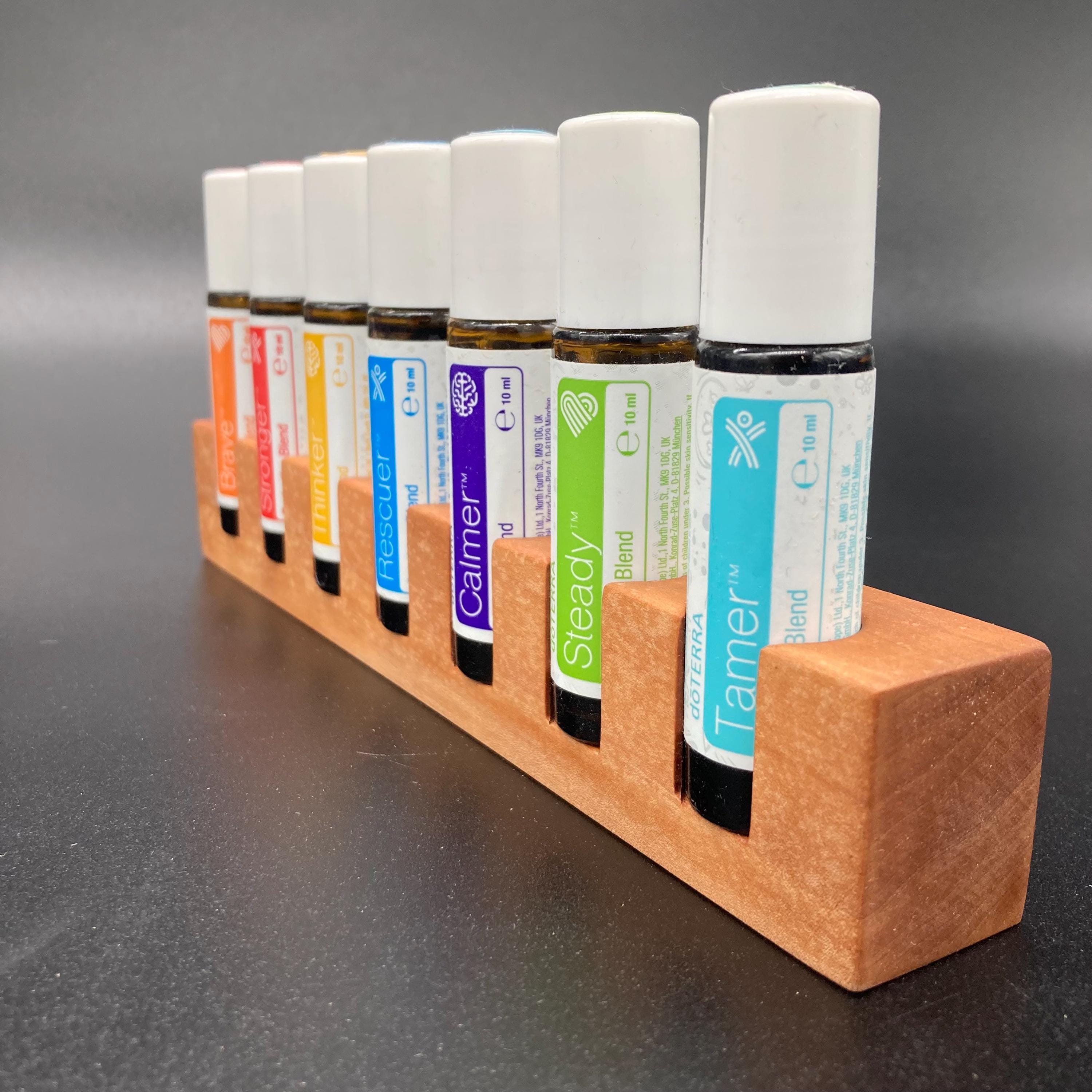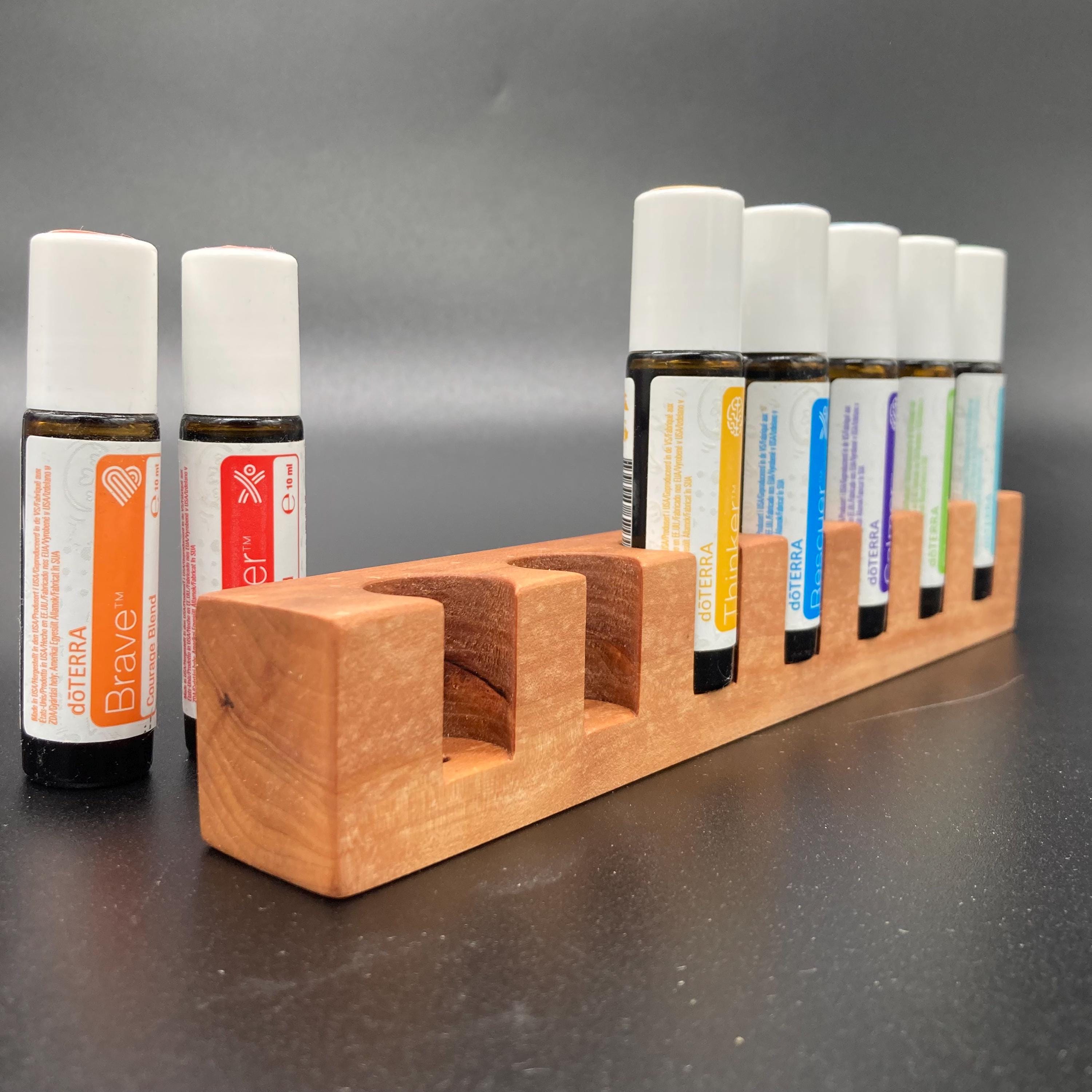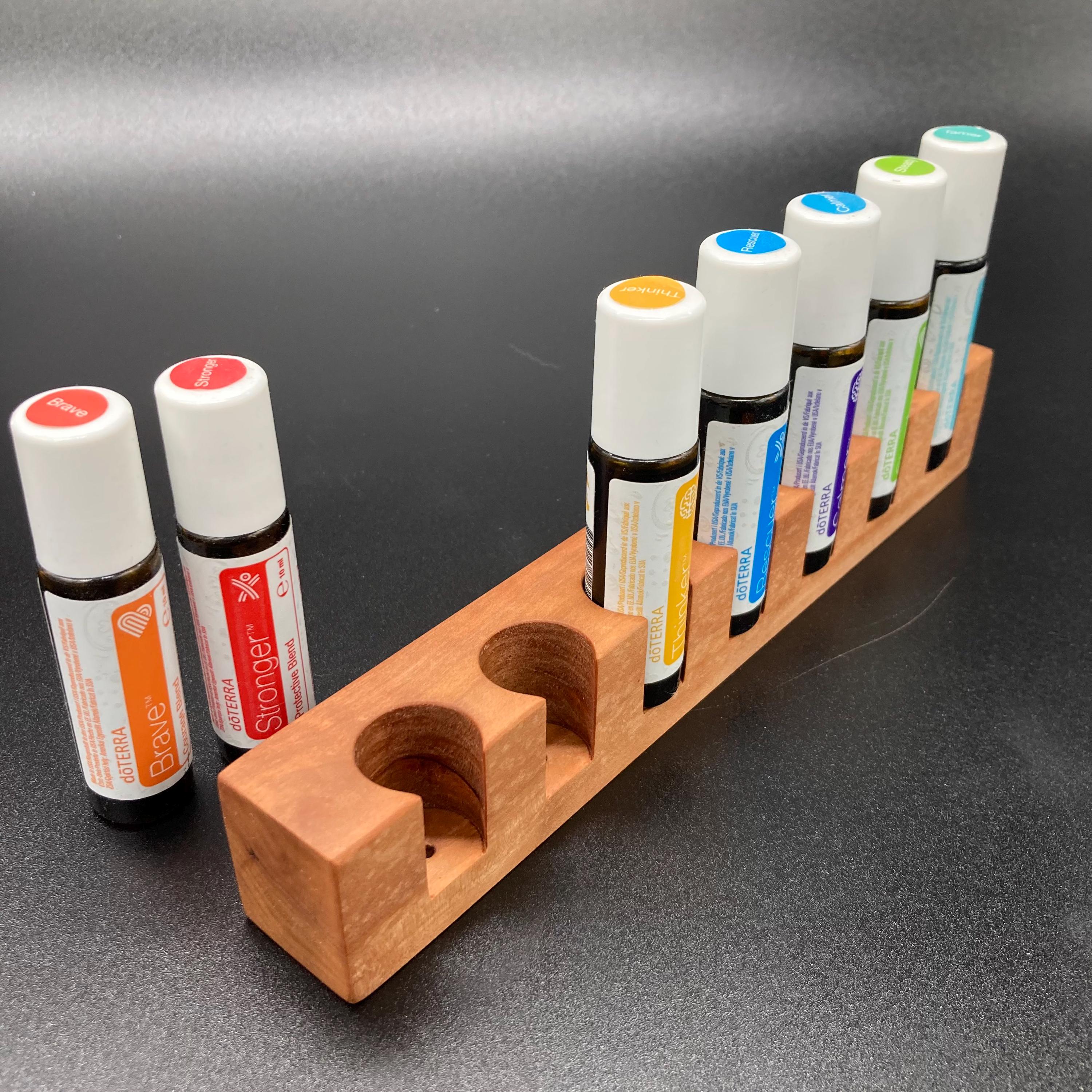 This display is ideal for anyone using 10ml oil bottles and roll-on applicators. It holds seven oil bottles (18mm diameter), with a 21mm opening. The opening's position and the cutout on the front allow you to read the labels much more easily without lifting the bottles. The depth of the opening is designed to prevent the bottles from falling out. This means you can confidently carry the display around the house or pick it up for demonstrations, showcasing your oils perfectly. All of this improves handling and organization, and it looks incredibly chic and elegant. It's also easy for kids to safely transport the entire collection from one place to another without everything rolling around.