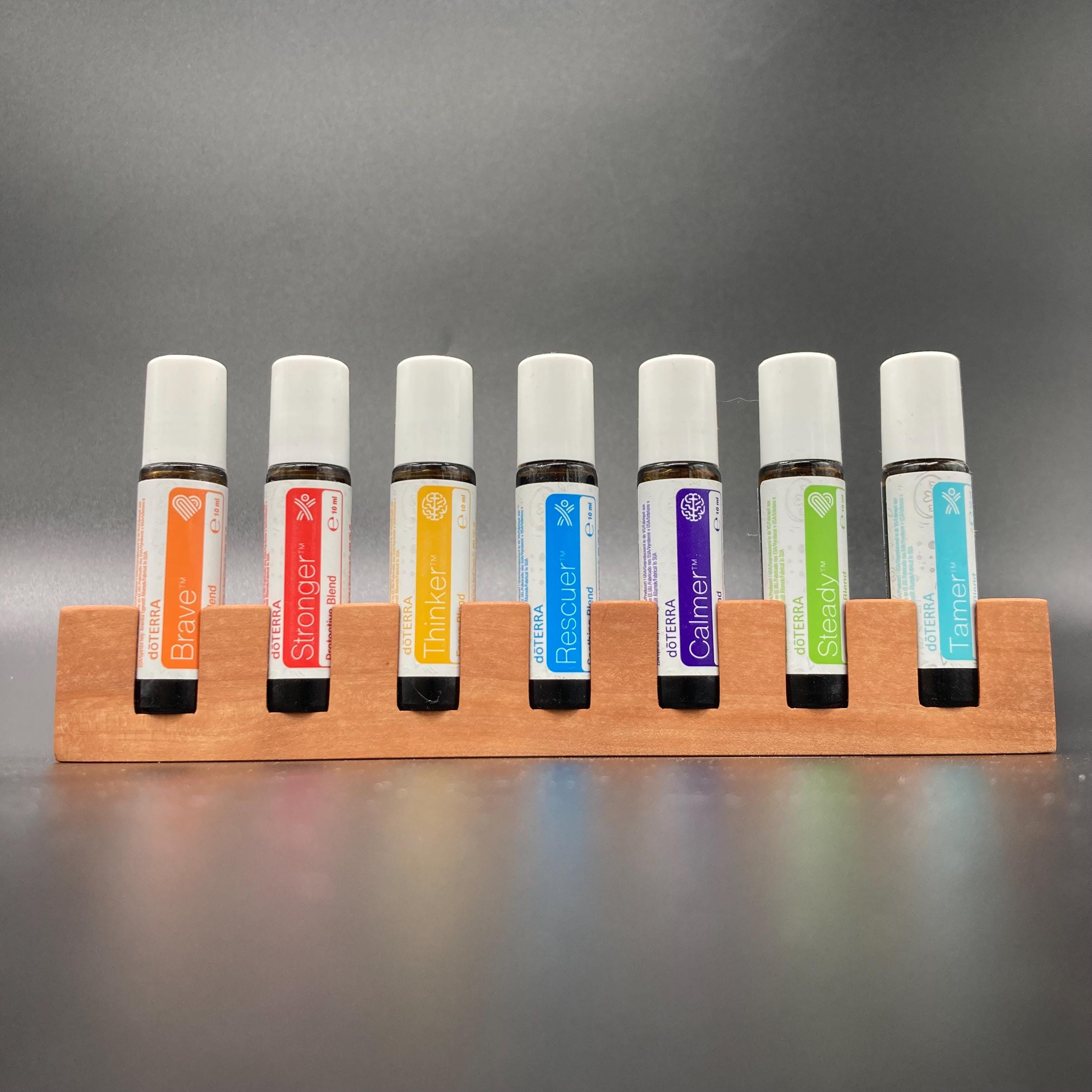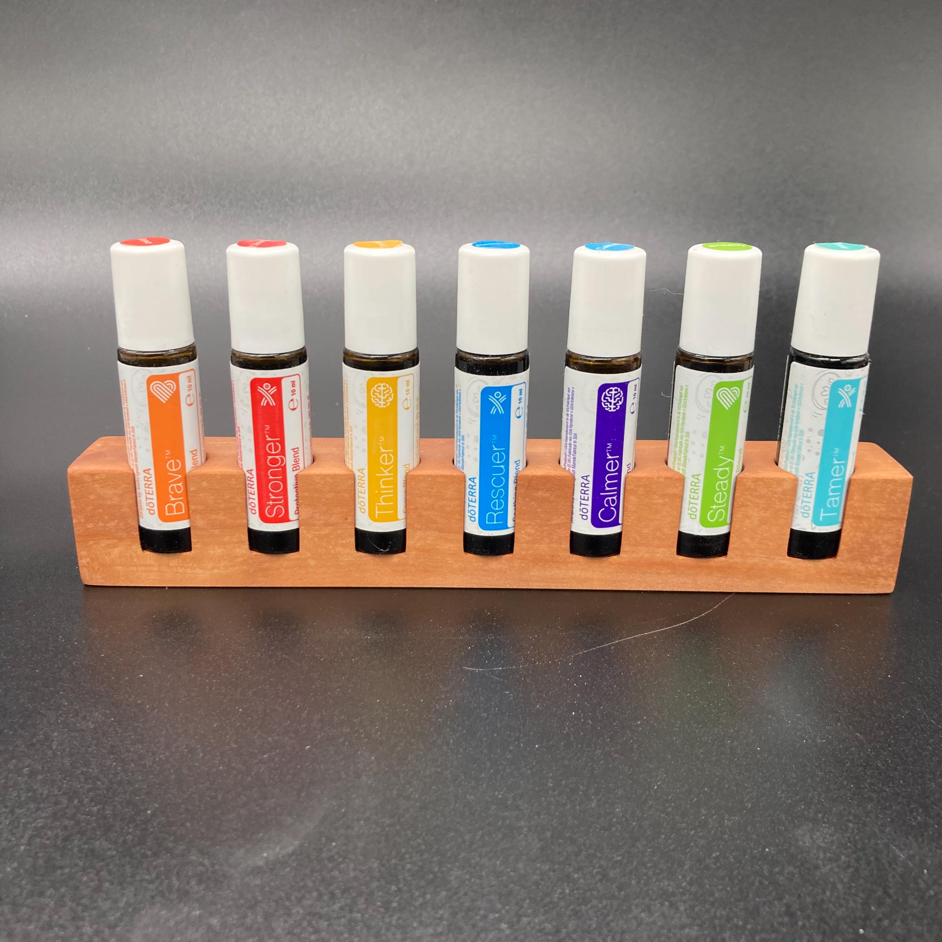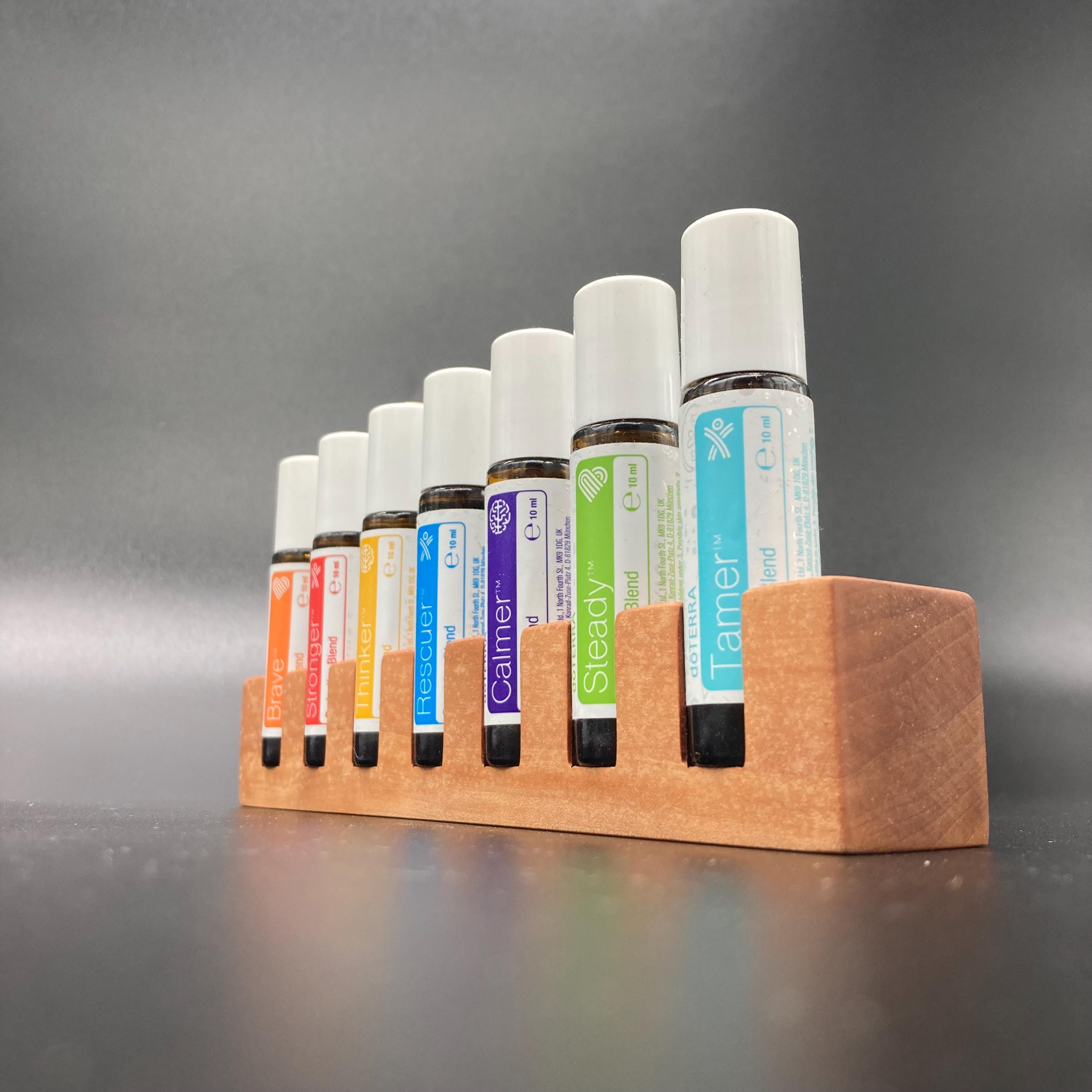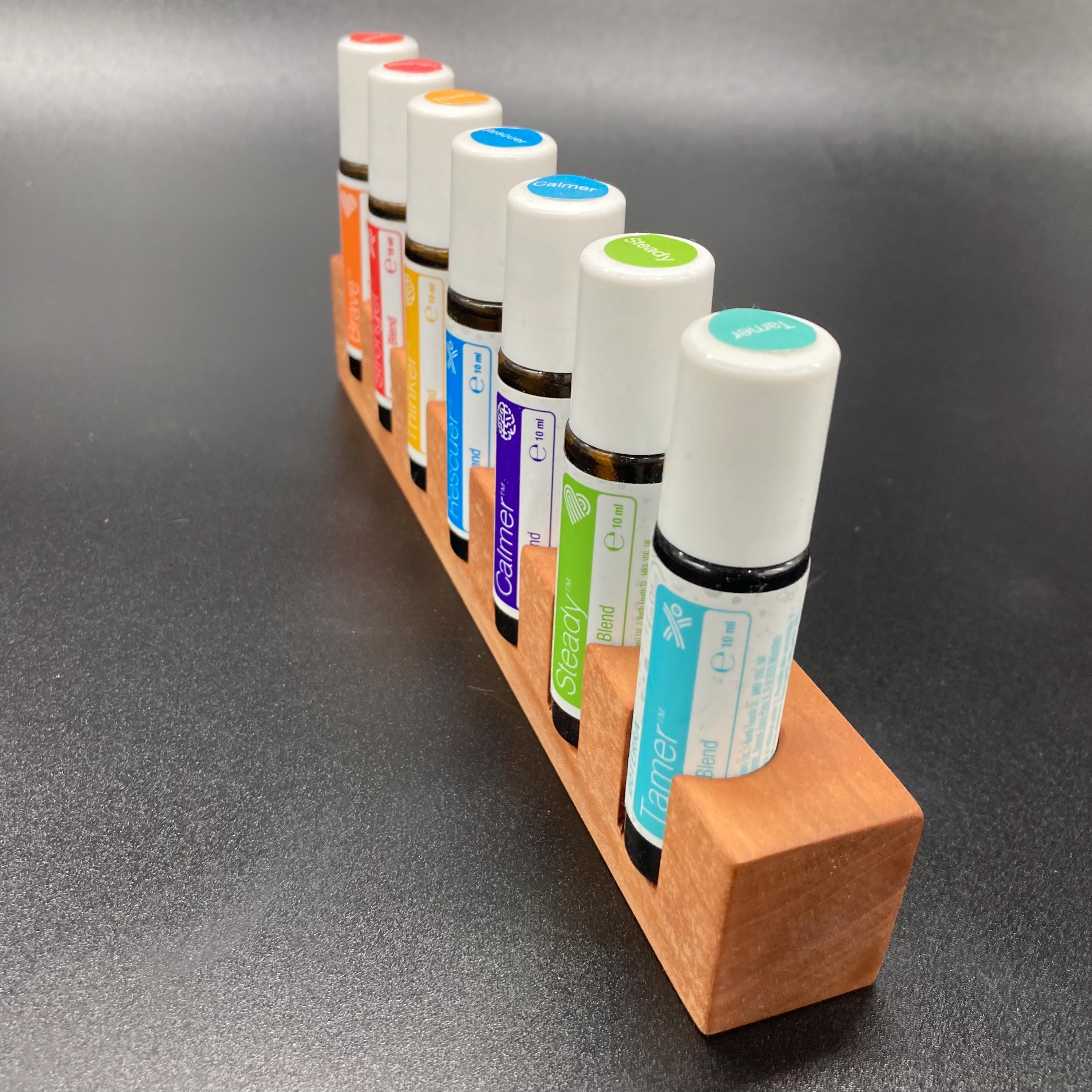 This display is ideal for anyone using 10ml oil bottles and roll-on applicators. It holds seven oil bottles (18mm diameter), with a 21mm opening. The opening's position and the cutout on the front allow you to read the labels much more easily without lifting the bottles. The depth of the opening is designed to prevent the bottles from falling out. This means you can confidently carry the display around the house or pick it up for demonstrations, showcasing your oils perfectly. All of this improves handling and organization, and it looks incredibly chic and elegant. It's also easy for kids to safely transport the entire collection from one place to another without everything rolling around.