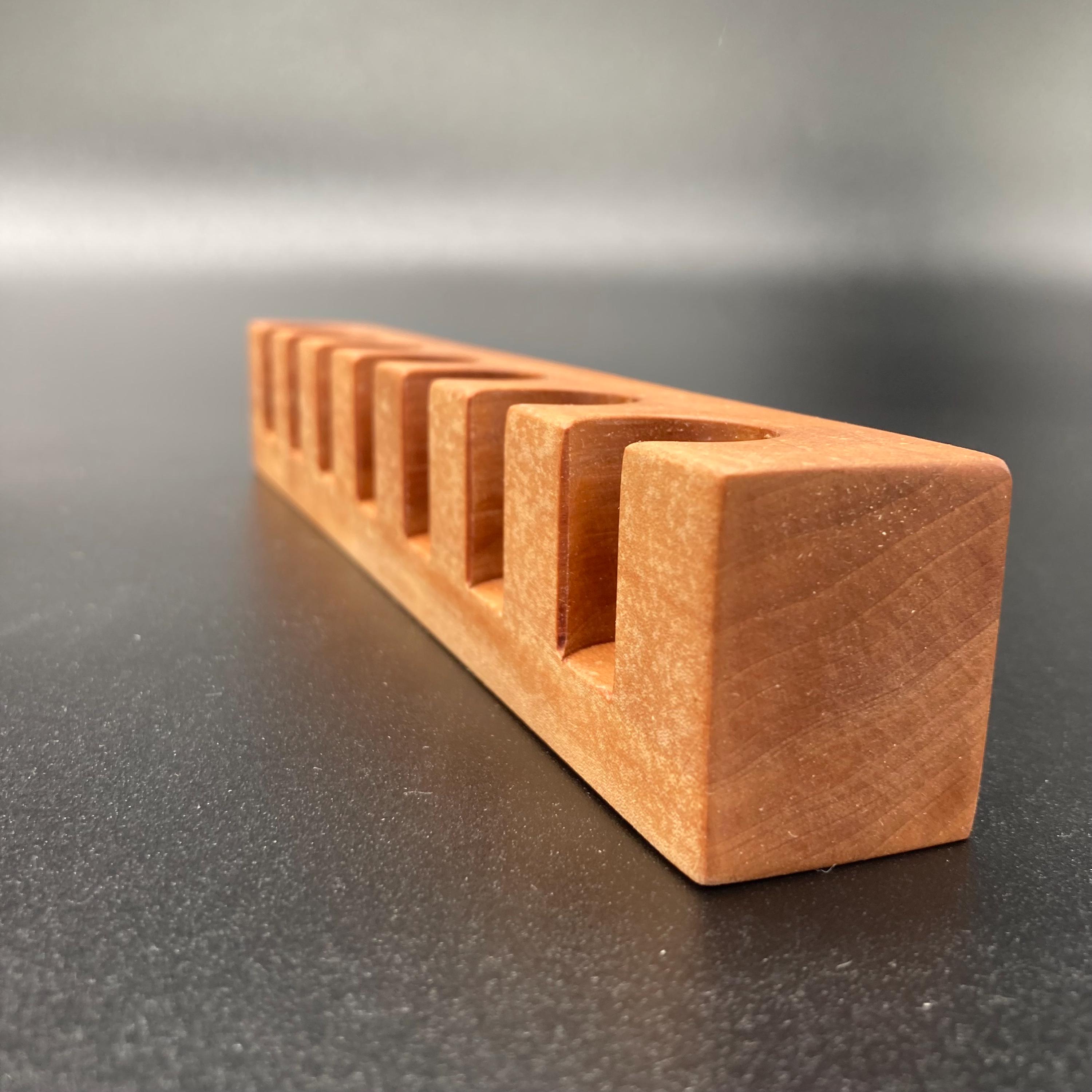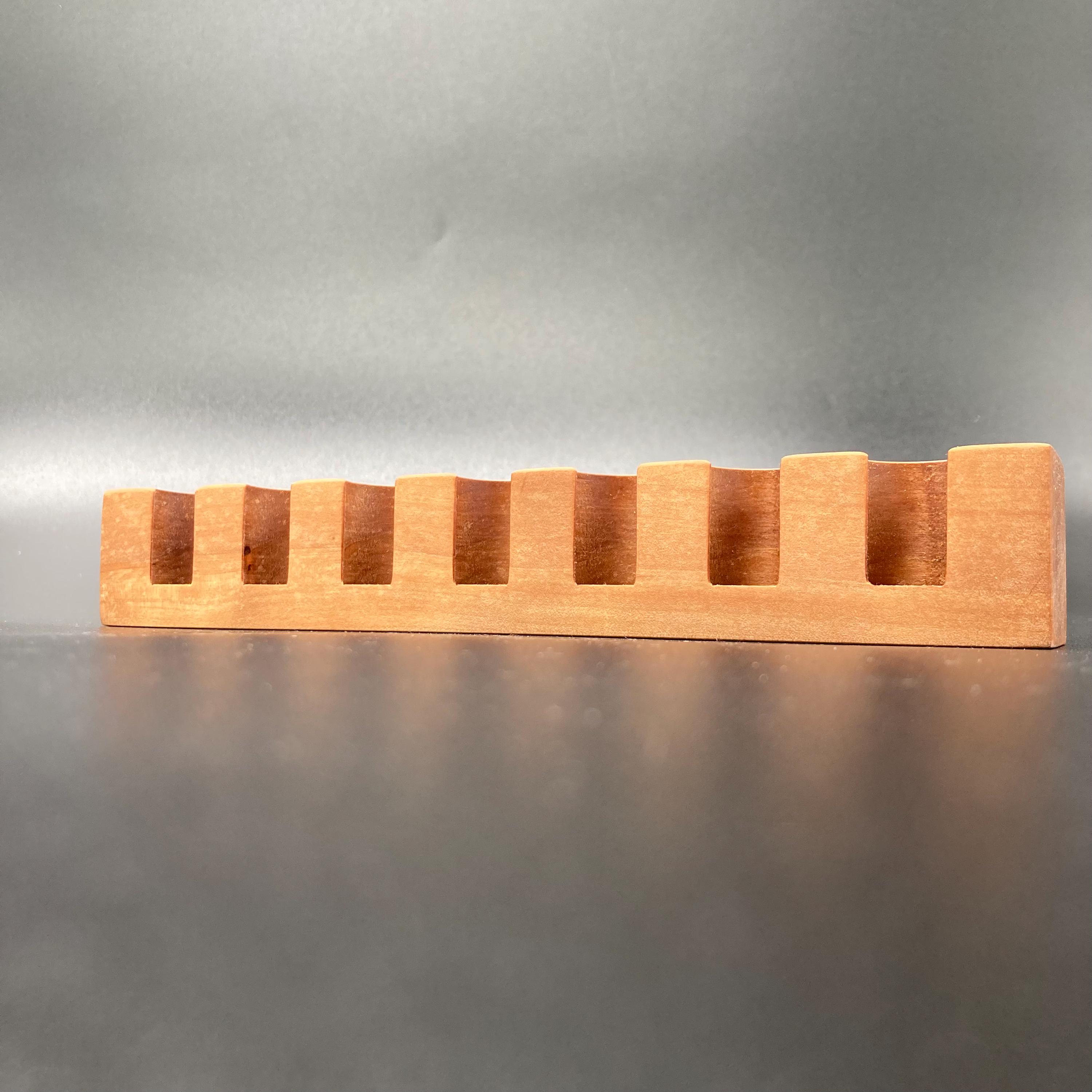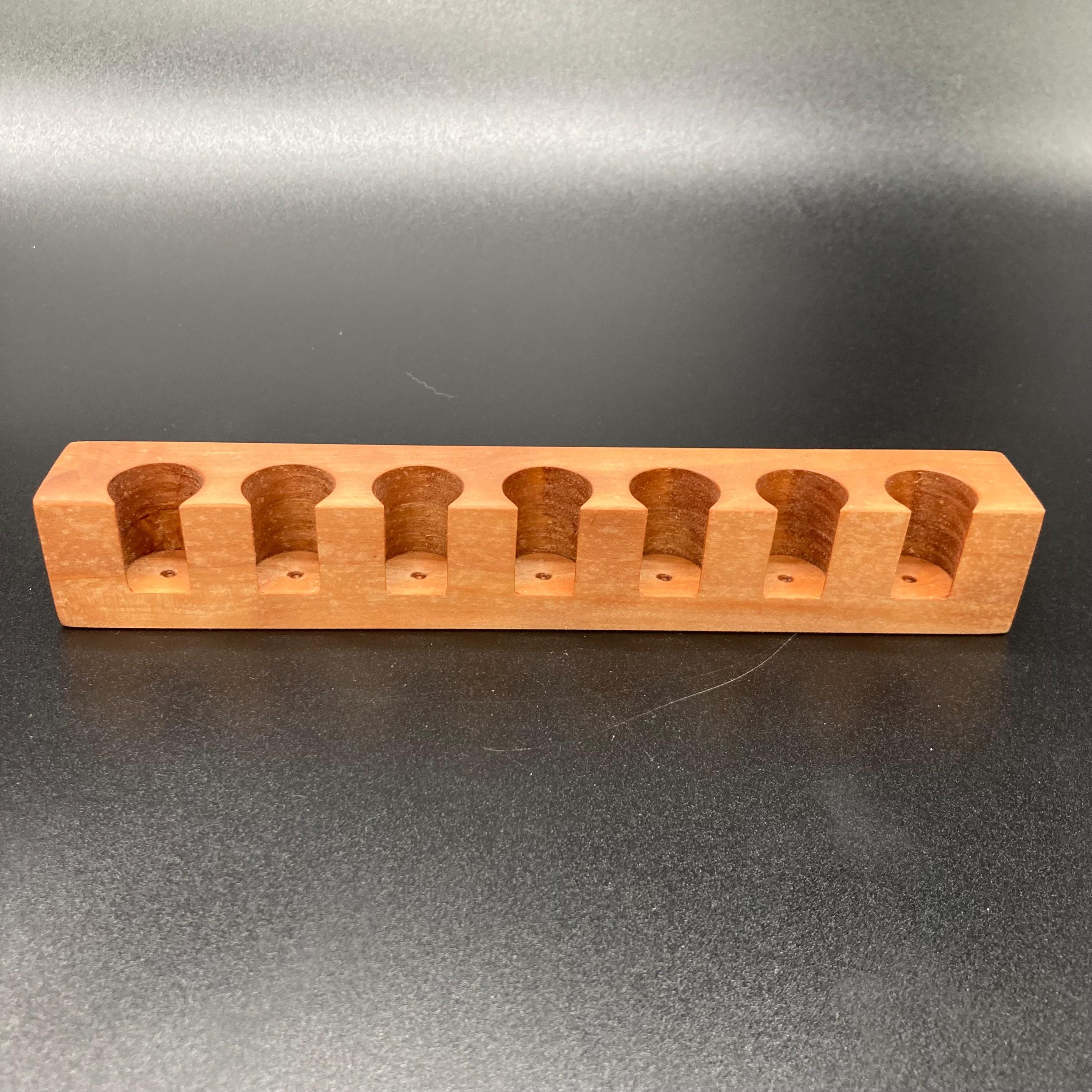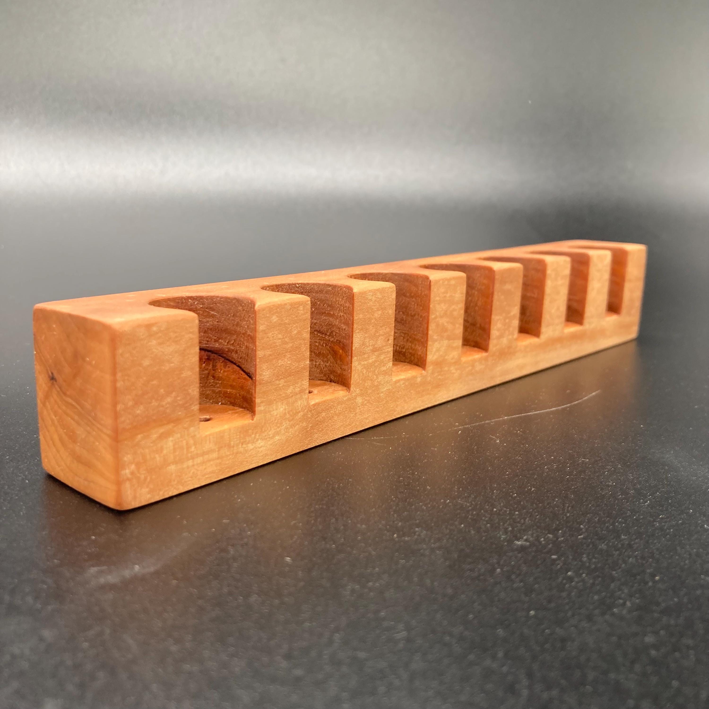 This display is ideal for anyone using 10ml oil bottles and roll-on applicators. It holds seven oil bottles (18mm diameter), with a 21mm opening. The opening's position and the cutout on the front allow you to read the labels much more easily without lifting the bottles. The depth of the opening is designed to prevent the bottles from falling out. This means you can confidently carry the display around the house or pick it up for demonstrations, showcasing your oils perfectly. All of this improves handling and organization, and it looks incredibly chic and elegant. It's also easy for kids to safely transport the entire collection from one place to another without everything rolling around.
