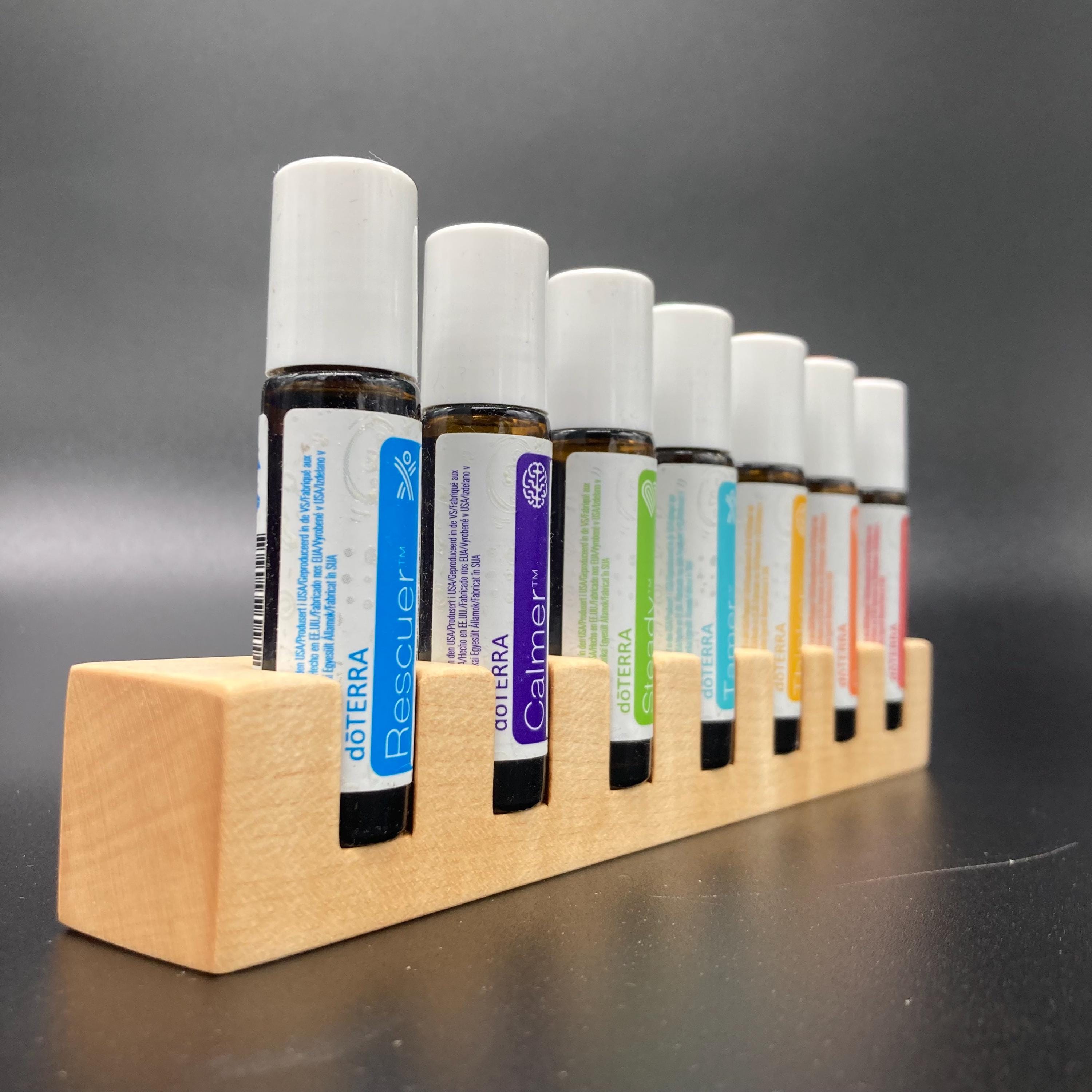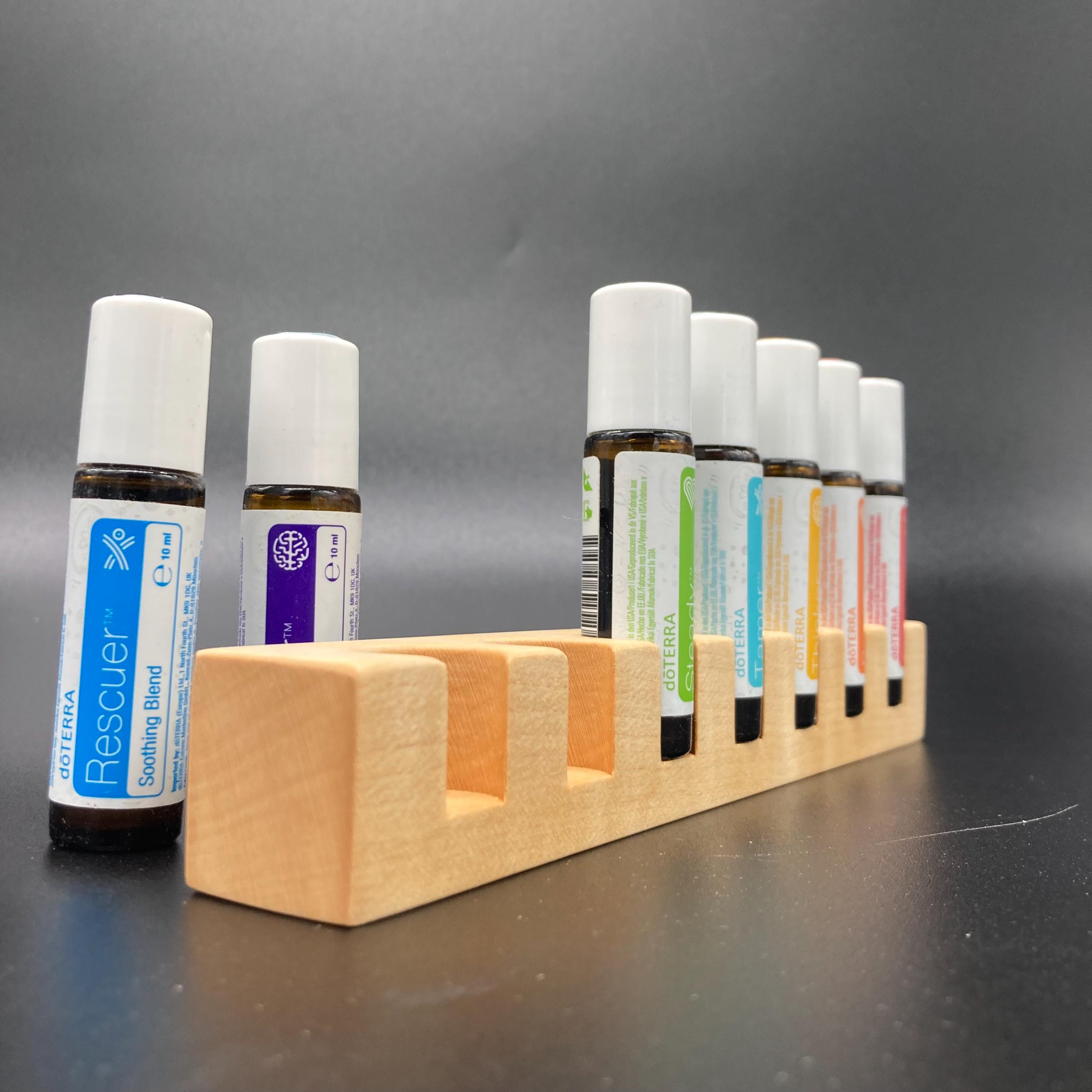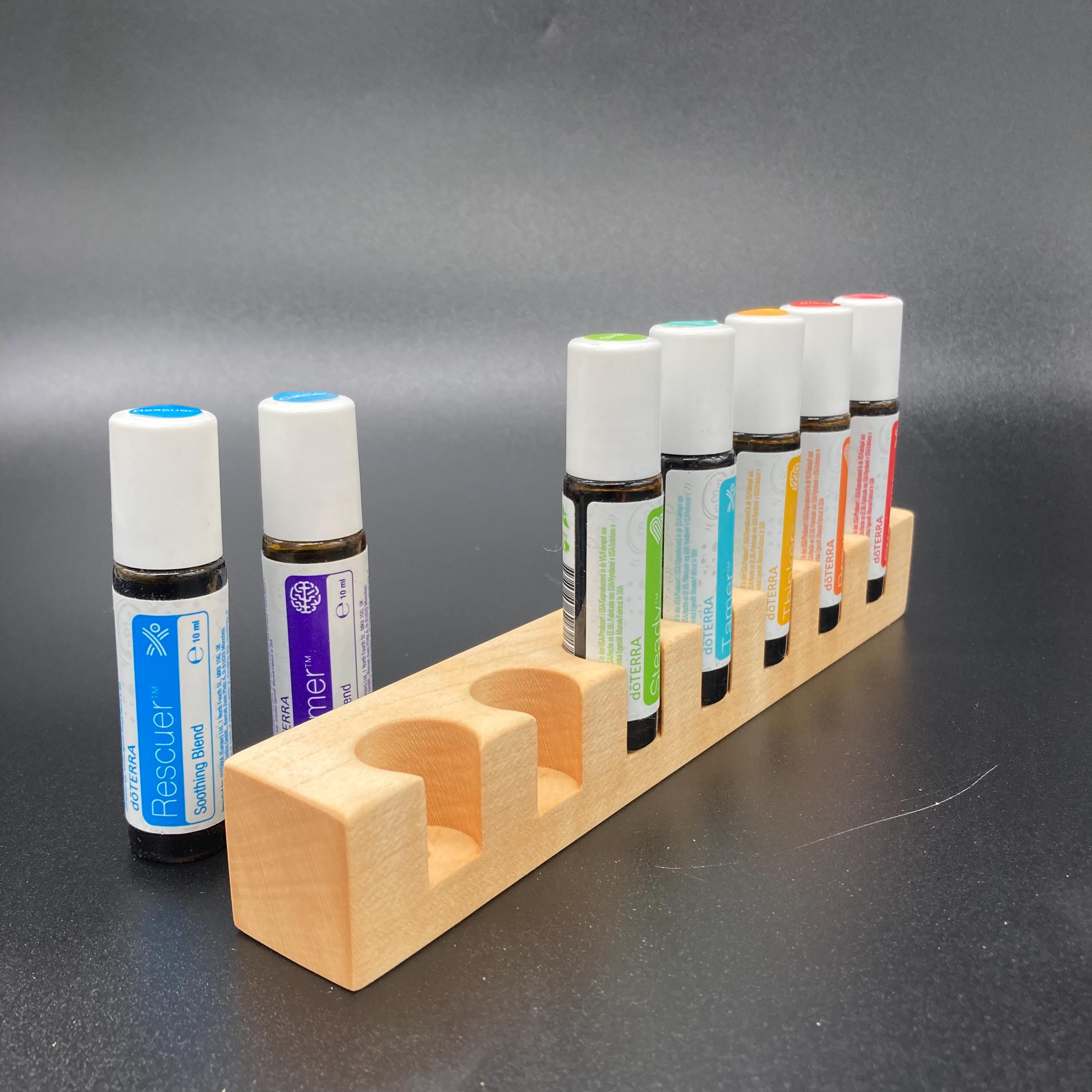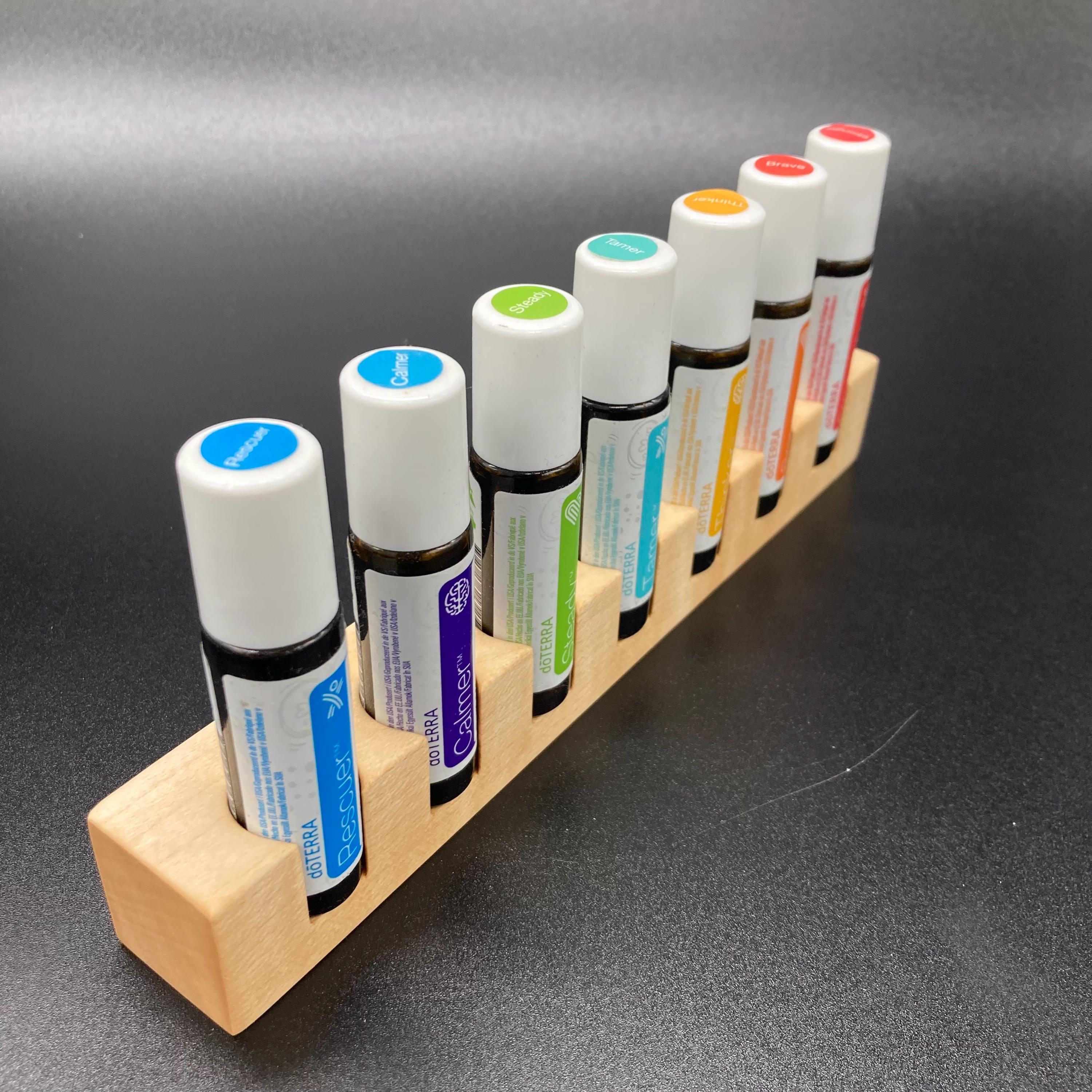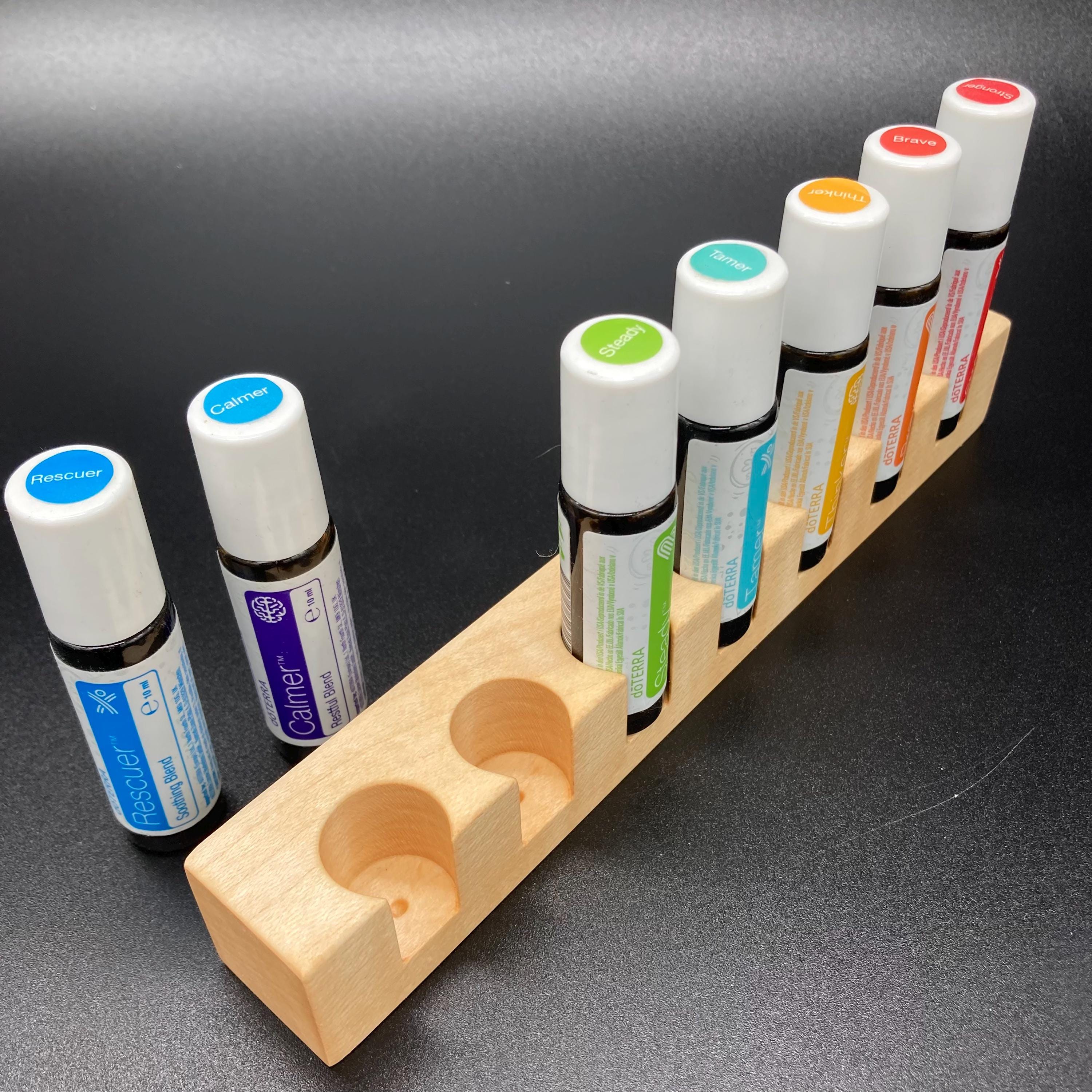 This display is ideal for anyone using 10ml oil bottles and roll-on applicators. It holds seven oil bottles (18mm diameter), with a 21mm opening. The opening's position and the cutout on the front allow you to read the labels much more easily without lifting the bottles. The depth of the opening is designed to prevent the bottles from falling out. This means you can confidently carry the display around the house or pick it up for demonstrations, showcasing your oils perfectly. All of this improves handling and organization, and it looks incredibly chic and elegant. It's also easy for kids to safely transport the entire collection from one place to another without everything rolling around.
