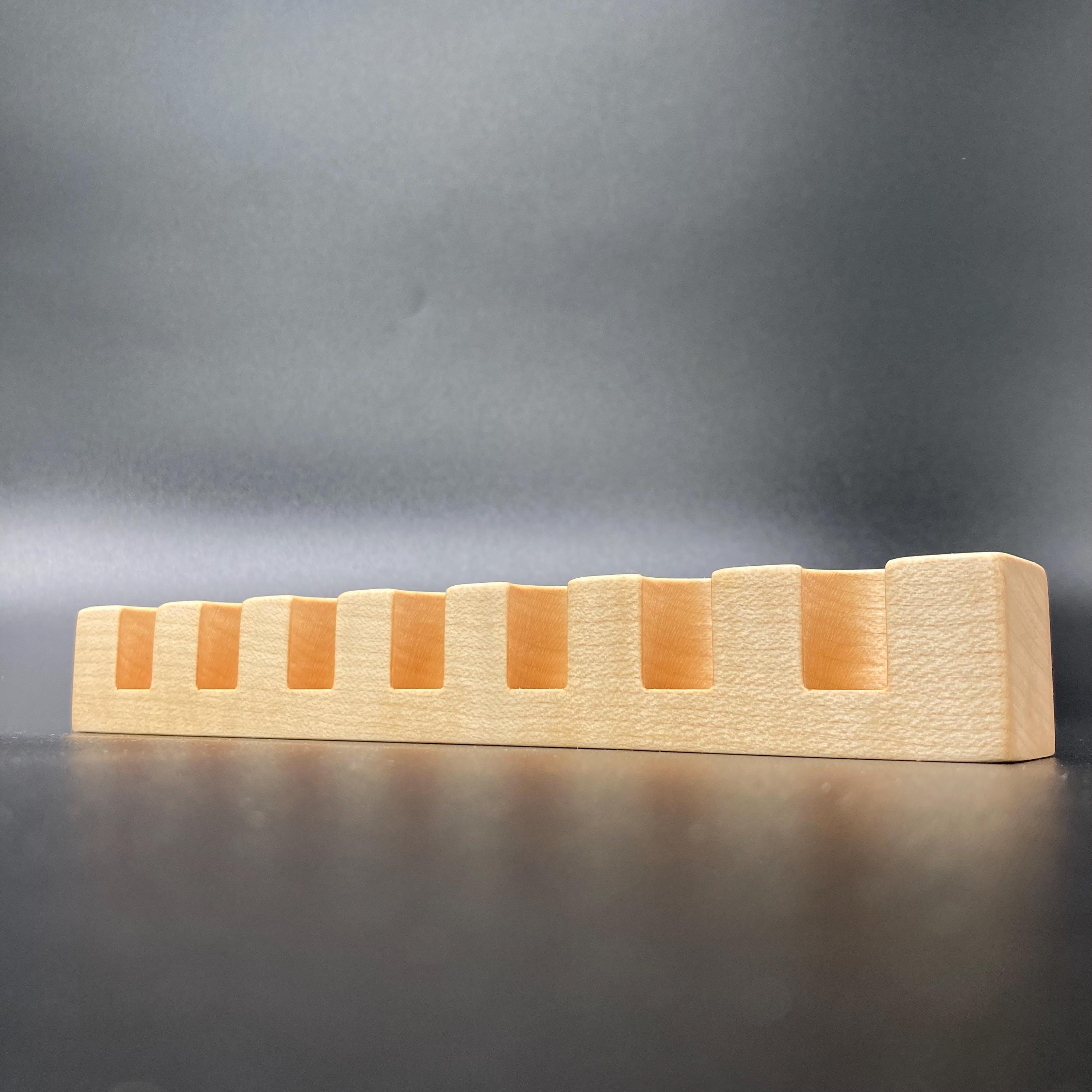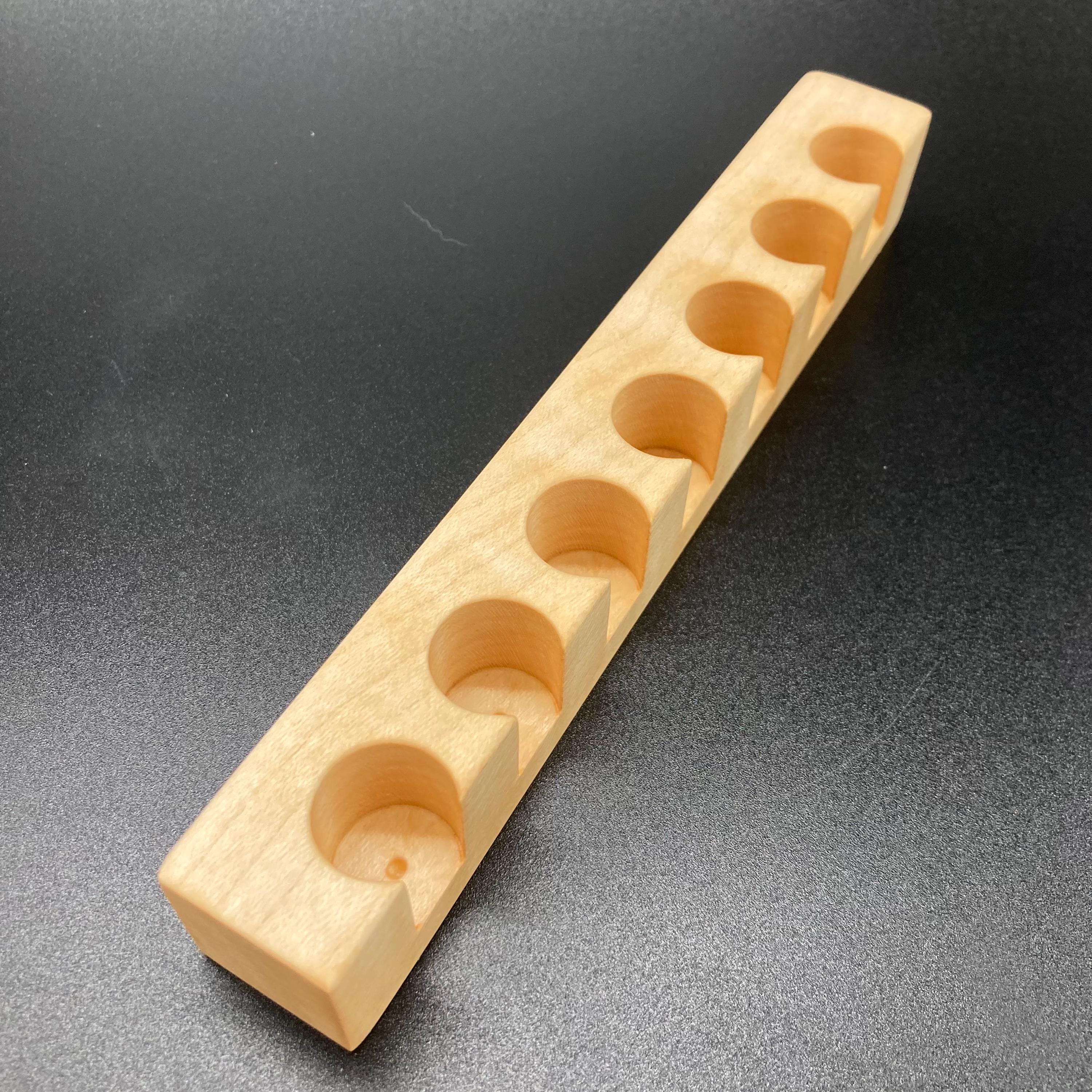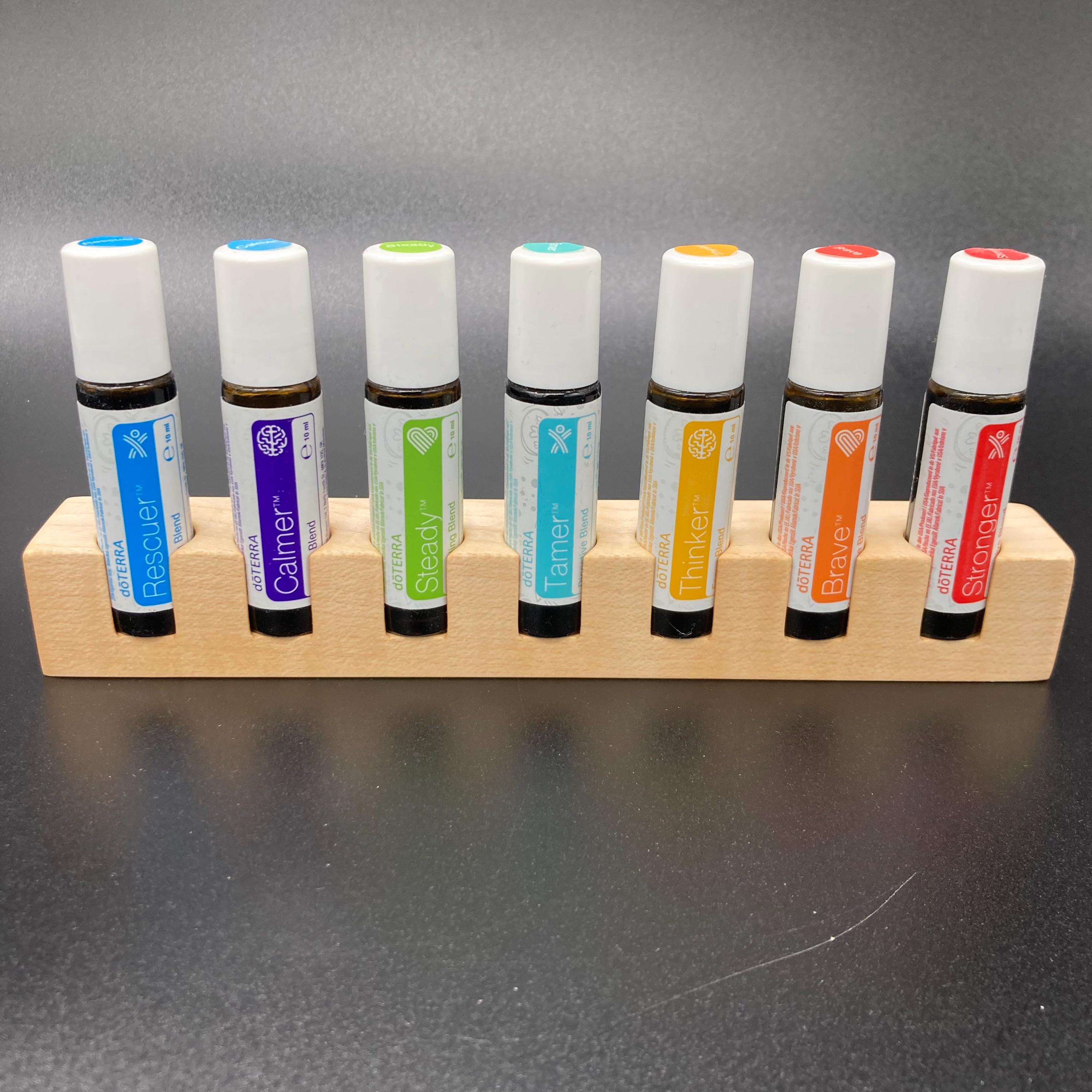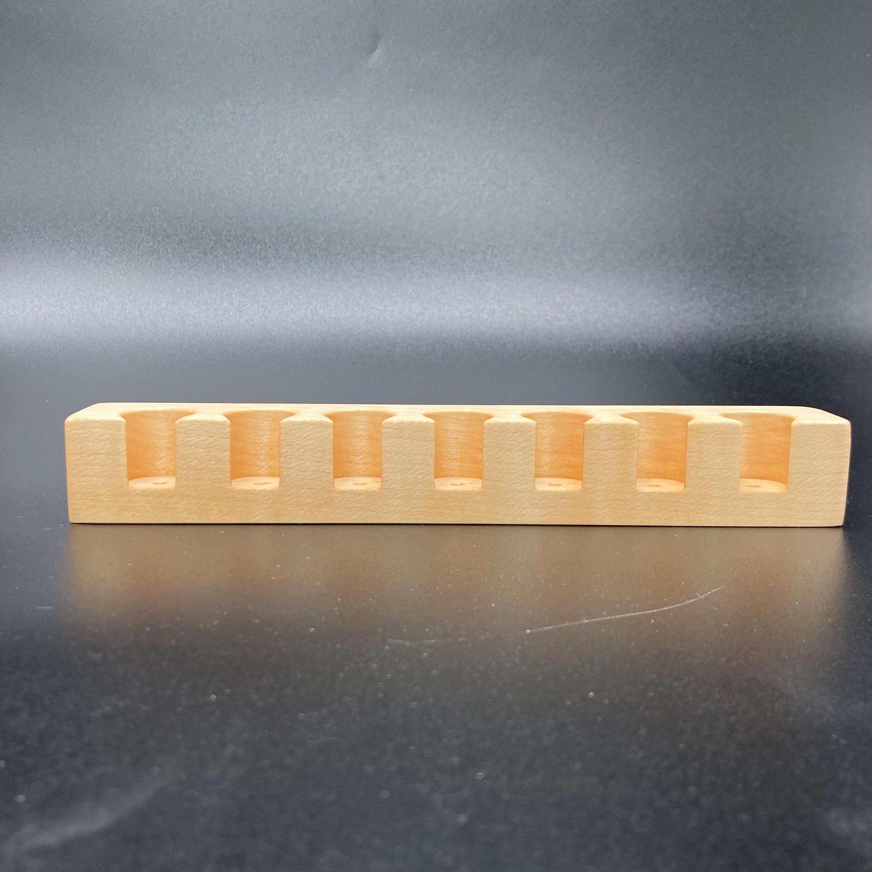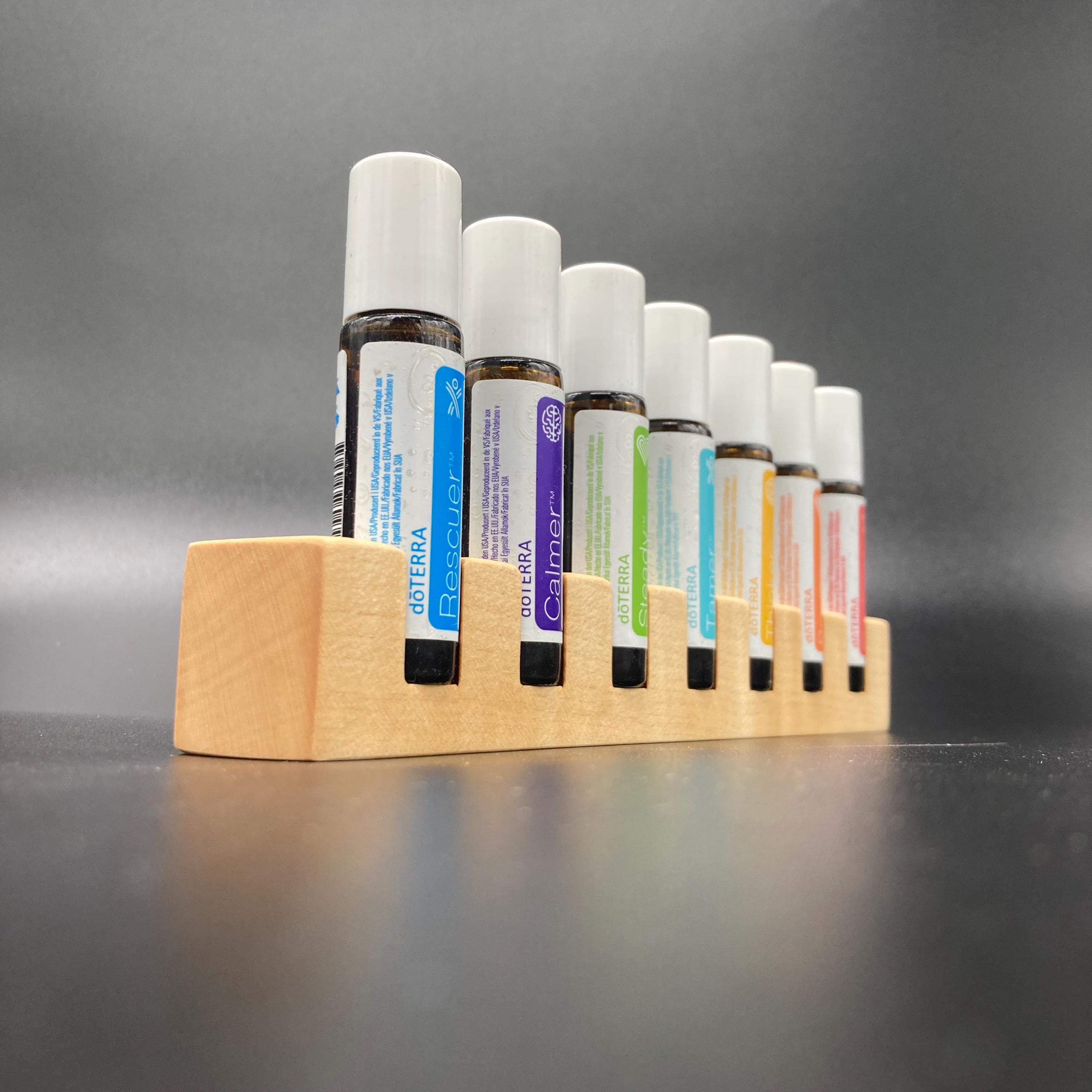 This display is ideal for anyone using 10ml oil bottles and roll-on applicators. It holds seven oil bottles (18mm diameter), with a 21mm opening. The opening's position and the cutout on the front allow you to read the labels much more easily without lifting the bottles. The depth of the opening is designed to prevent the bottles from falling out. This means you can confidently carry the display around the house or pick it up for demonstrations, showcasing your oils perfectly. All of this improves handling and organization, and it looks incredibly chic and elegant. It's also easy for kids to safely transport the entire collection from one place to another without everything rolling around.