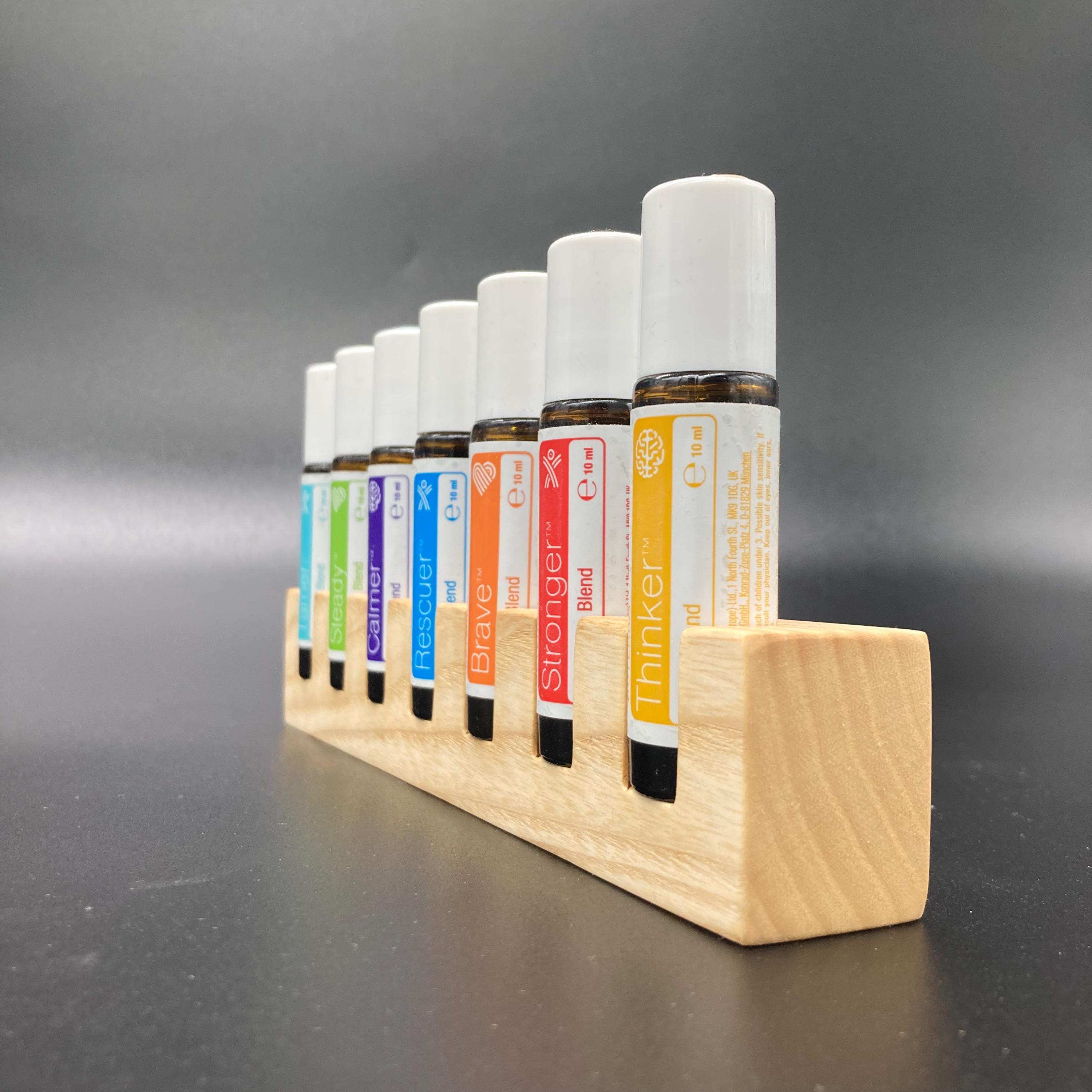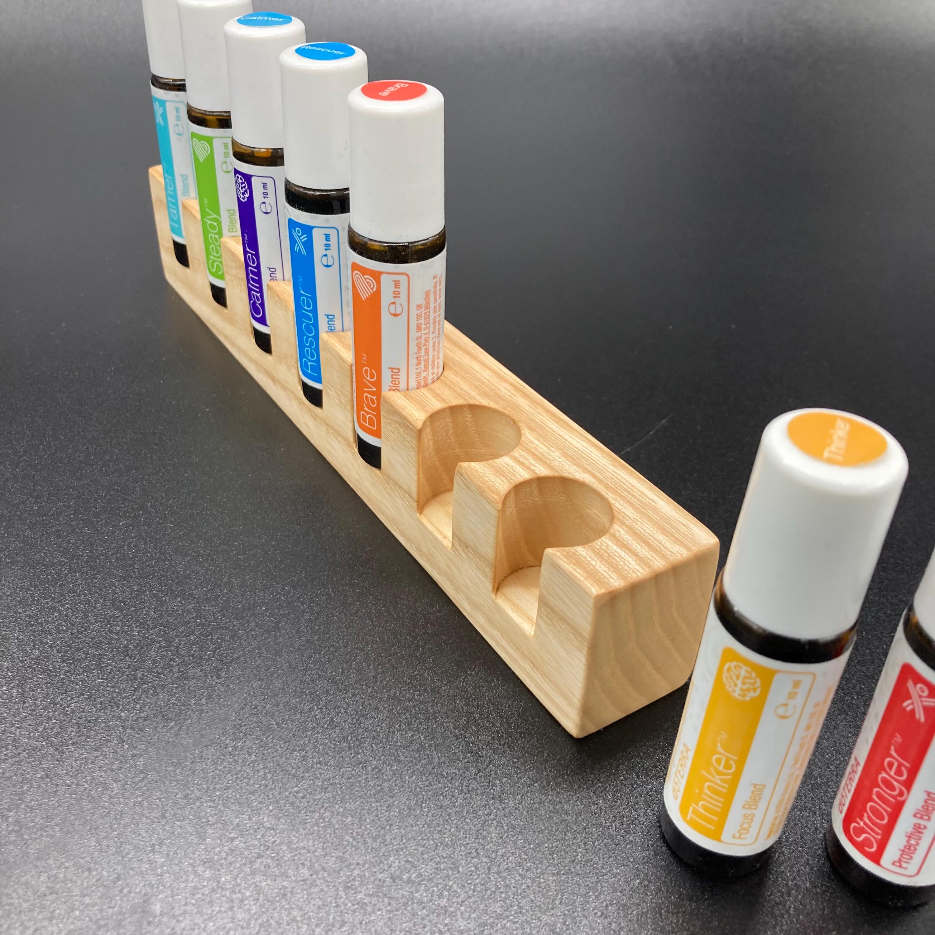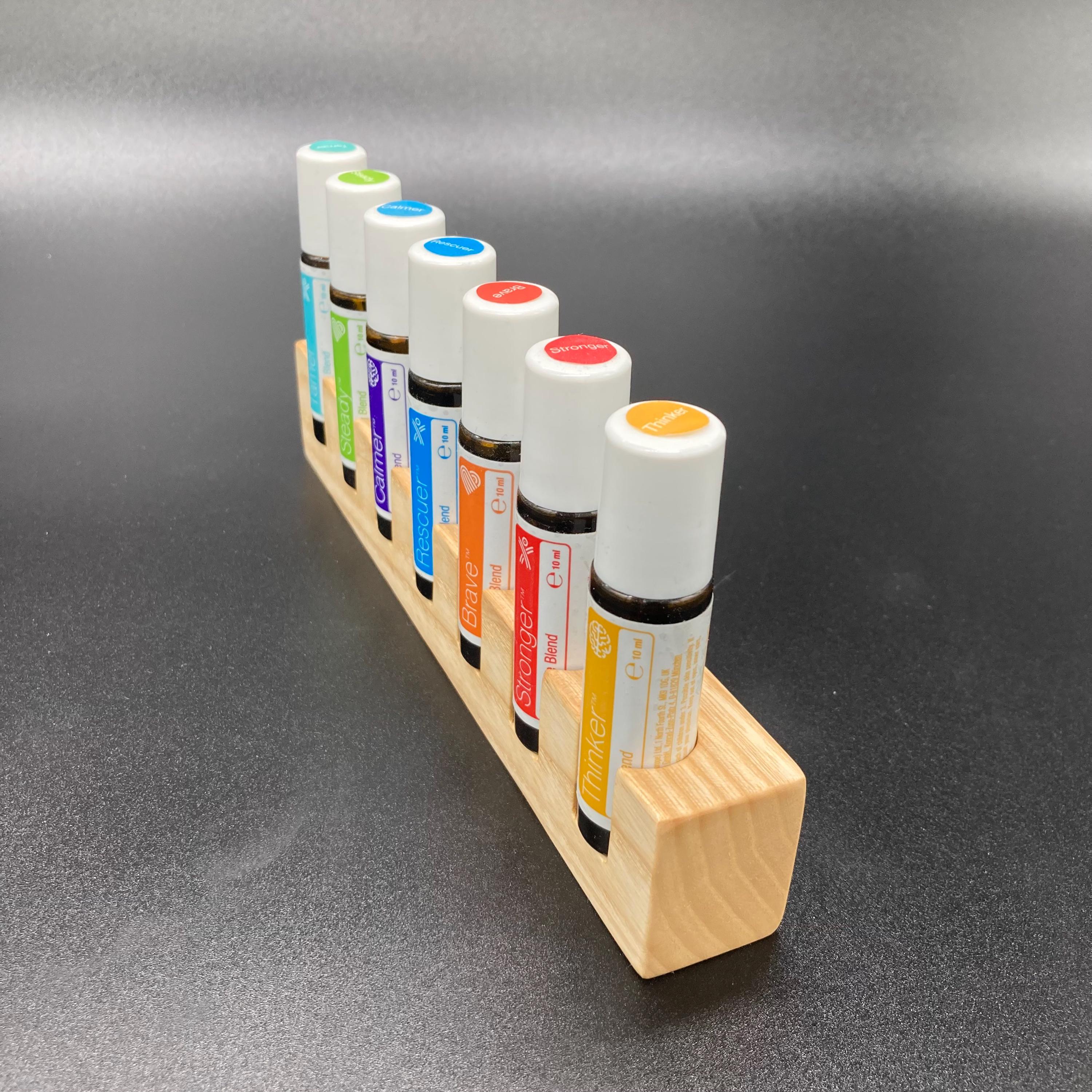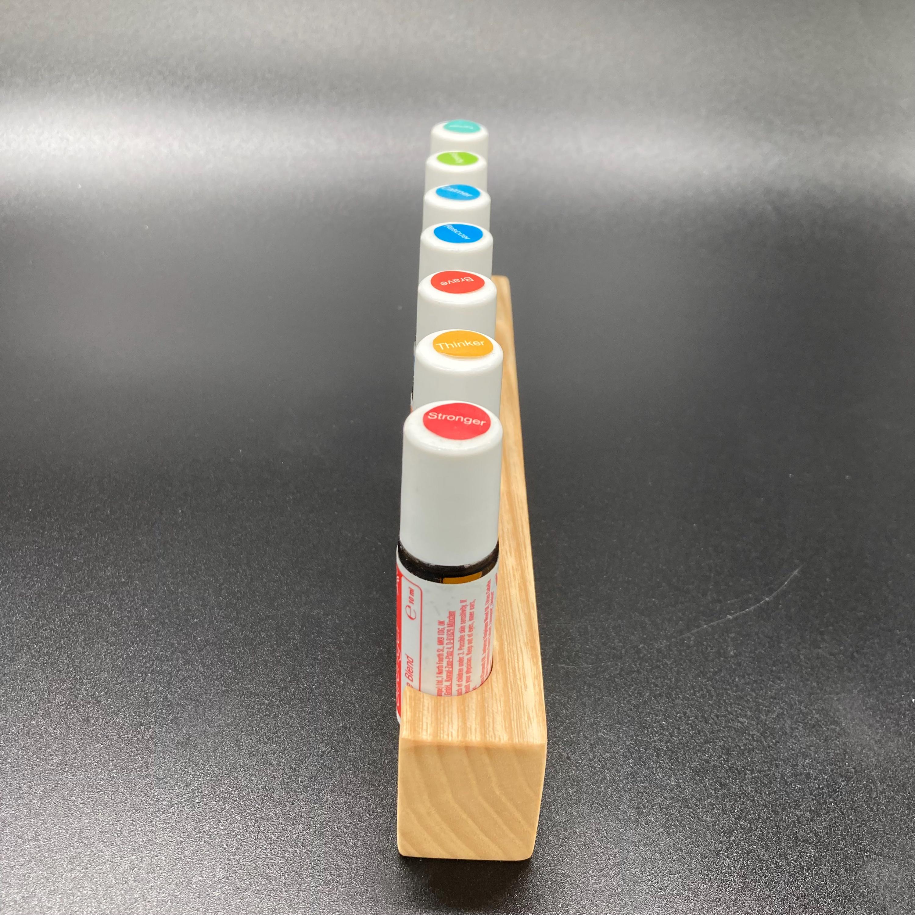 This display is ideal for anyone using 10ml oil bottles and roll-on applicators. It holds seven oil bottles (18mm diameter), with a 21mm opening. The opening's position and the cutout on the front allow you to read the labels much more easily without lifting the bottles. The depth of the opening is designed to prevent the bottles from falling out. This means you can confidently carry the display around the house or pick it up for demonstrations, showcasing your oils perfectly. All of this improves handling and organization, and it looks incredibly chic and elegant. It's also easy for kids to safely transport the entire collection from one place to another without everything rolling around.