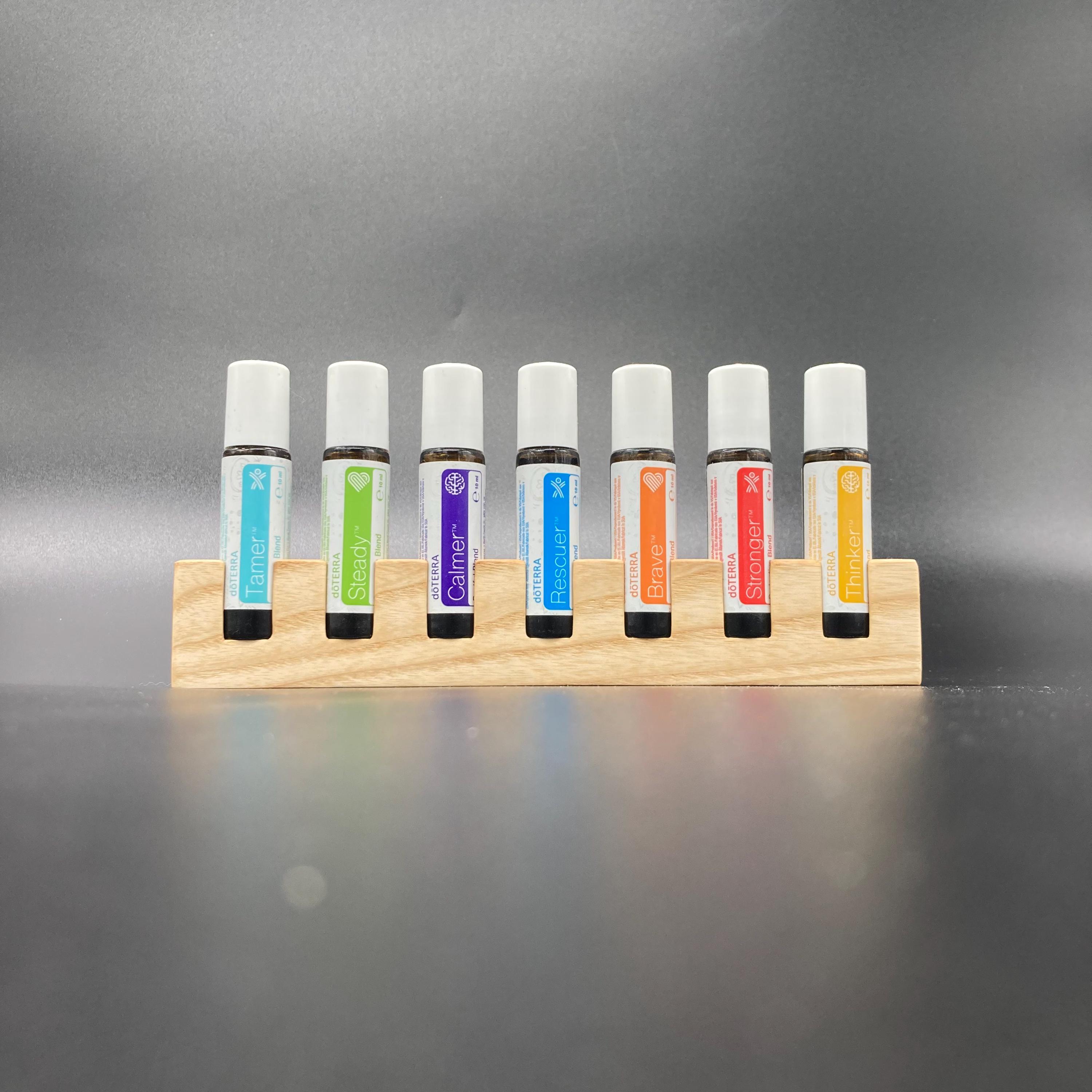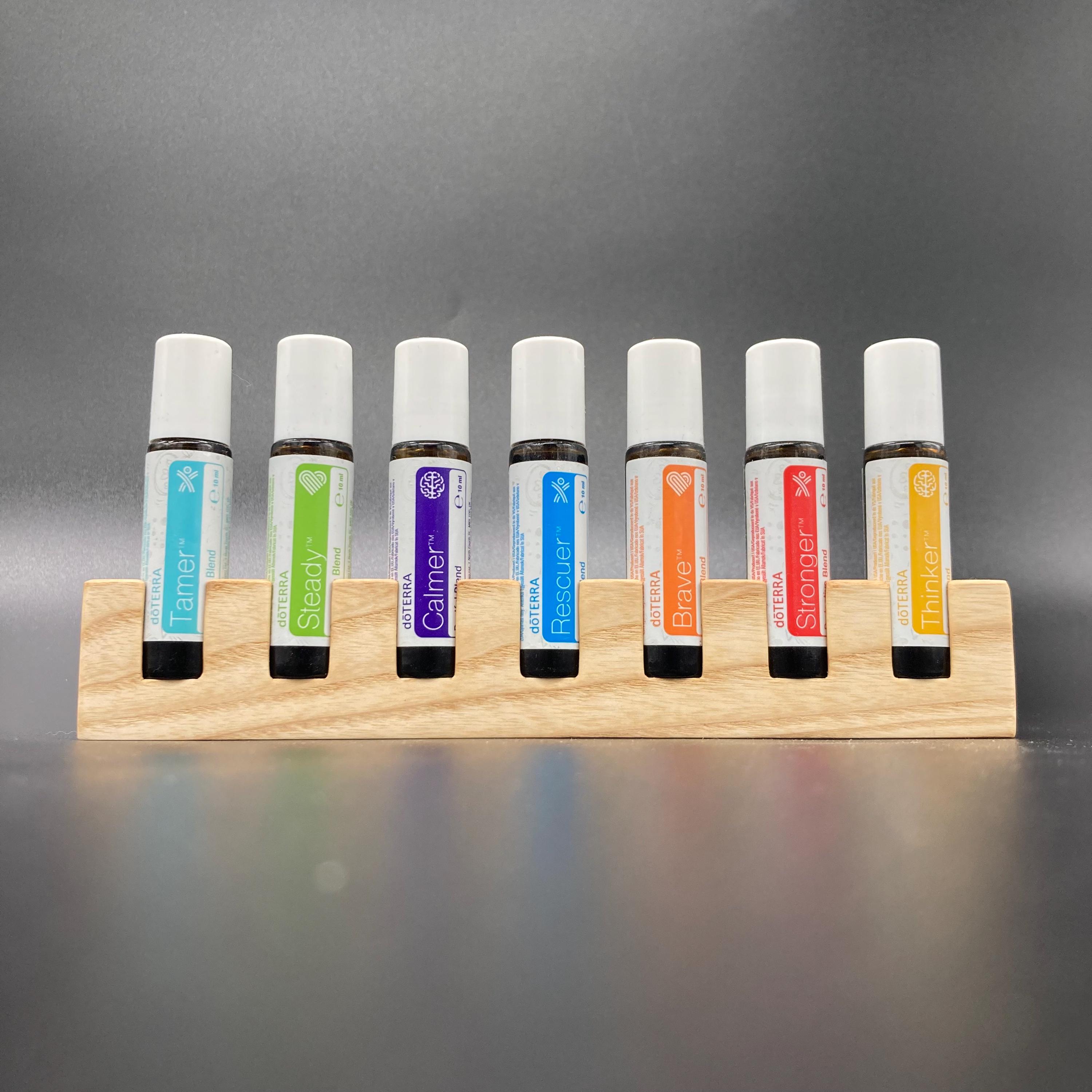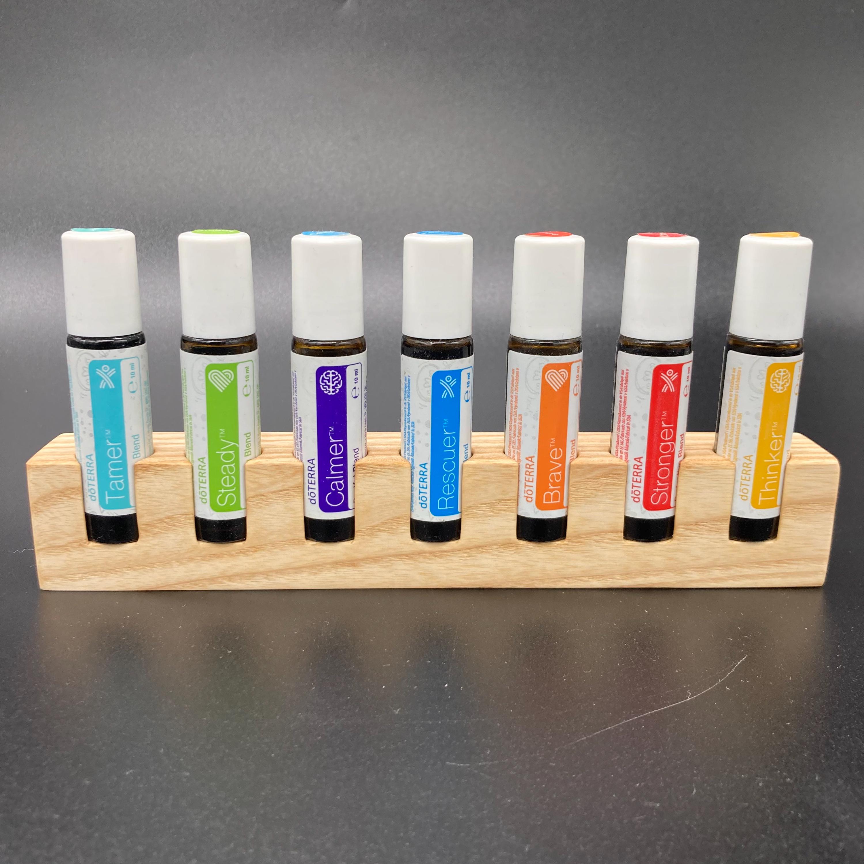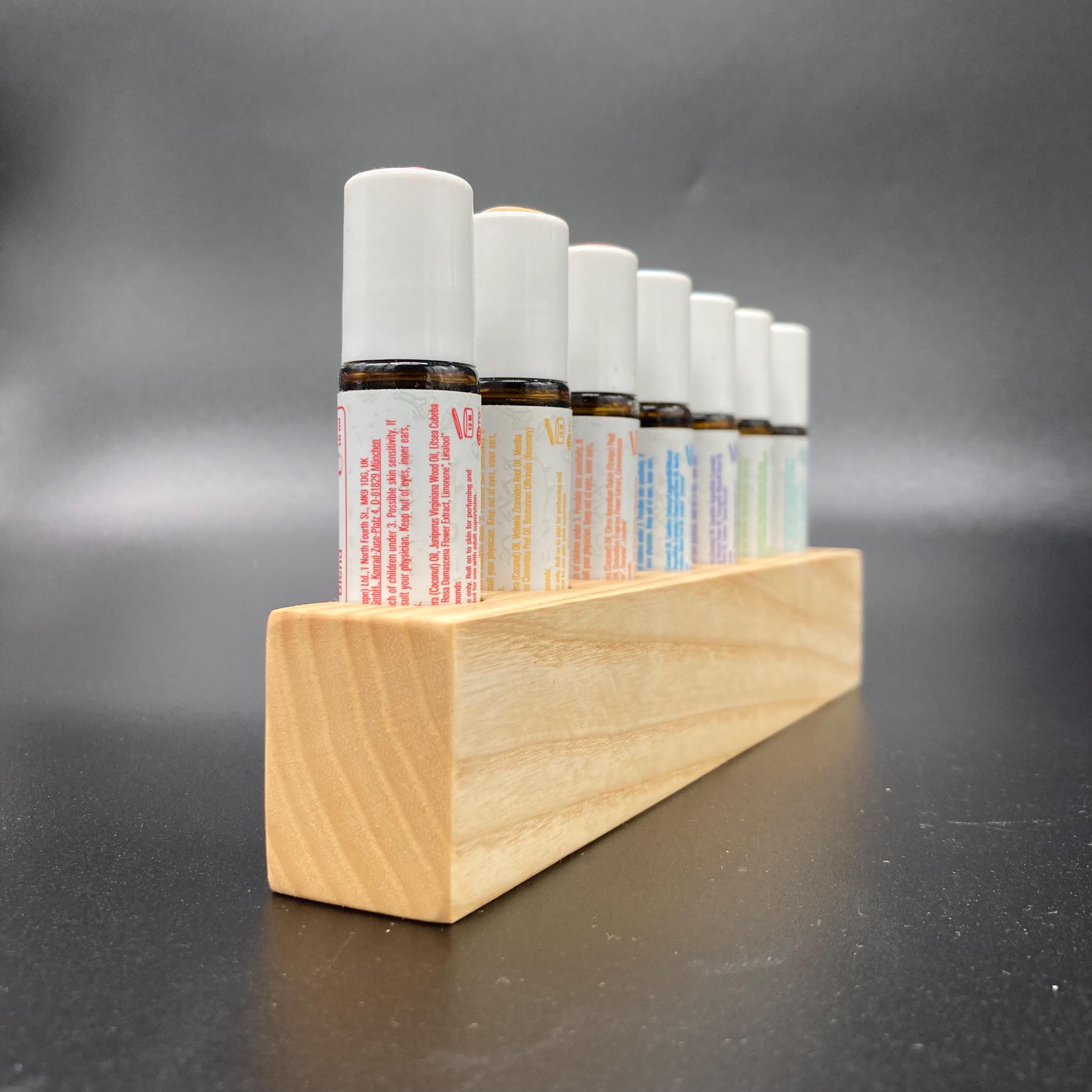 This display is ideal for anyone using 10ml oil bottles and roll-on applicators. It holds seven oil bottles (18mm diameter), with a 21mm opening. The opening's position and the cutout on the front allow you to read the labels much more easily without lifting the bottles. The depth of the opening is designed to prevent the bottles from falling out. This means you can confidently carry the display around the house or pick it up for demonstrations, showcasing your oils perfectly. All of this improves handling and organization, and it looks incredibly chic and elegant. It's also easy for kids to safely transport the entire collection from one place to another without everything rolling around.