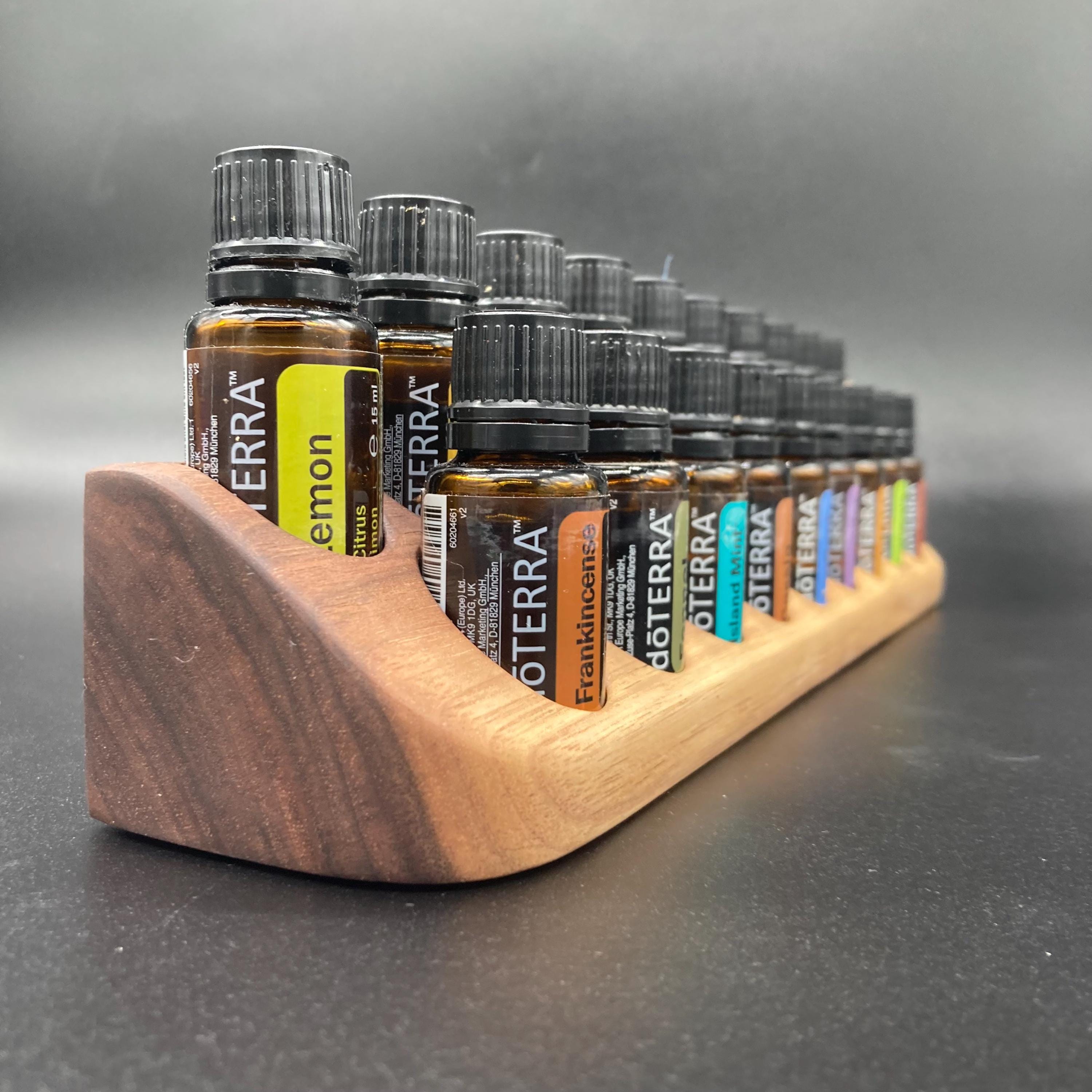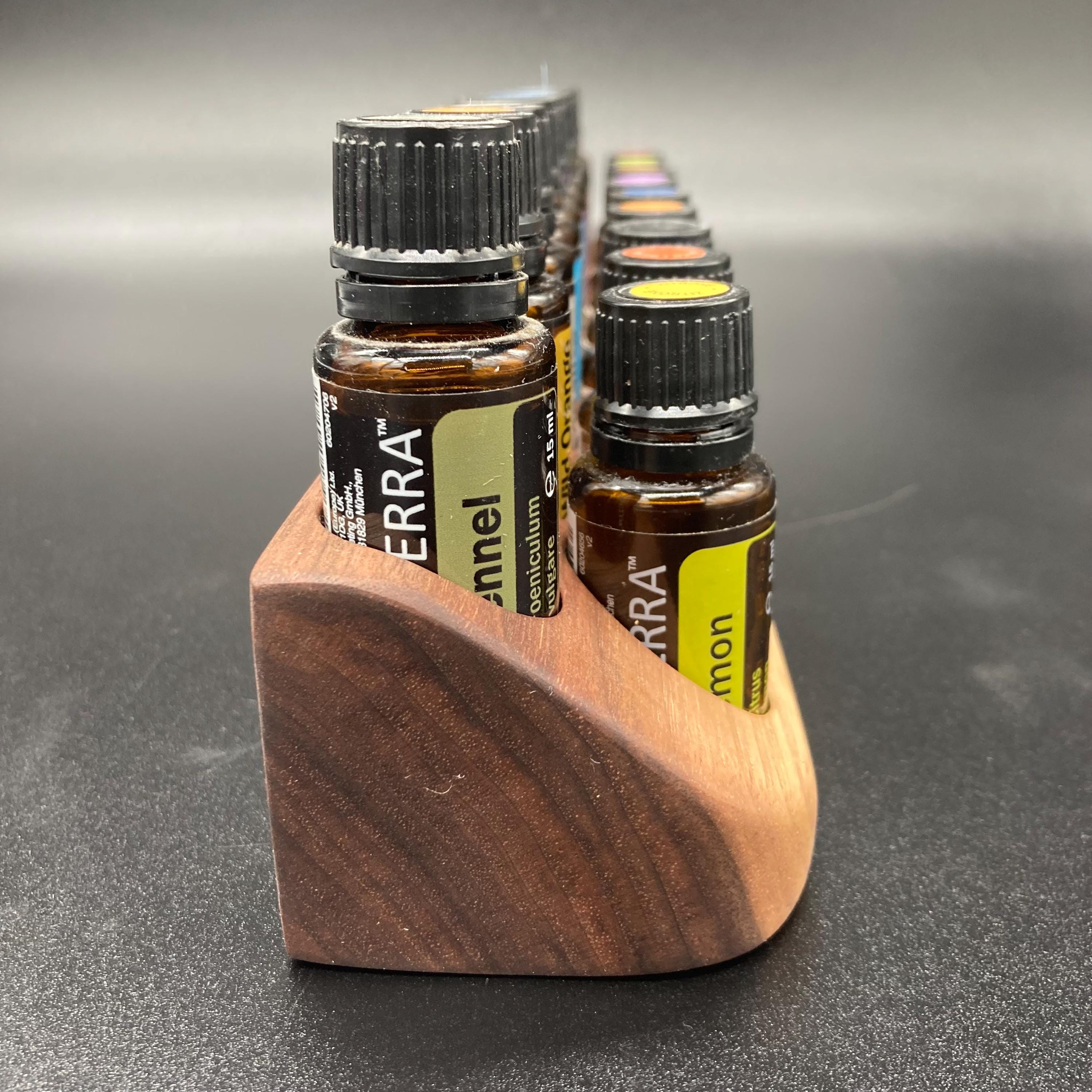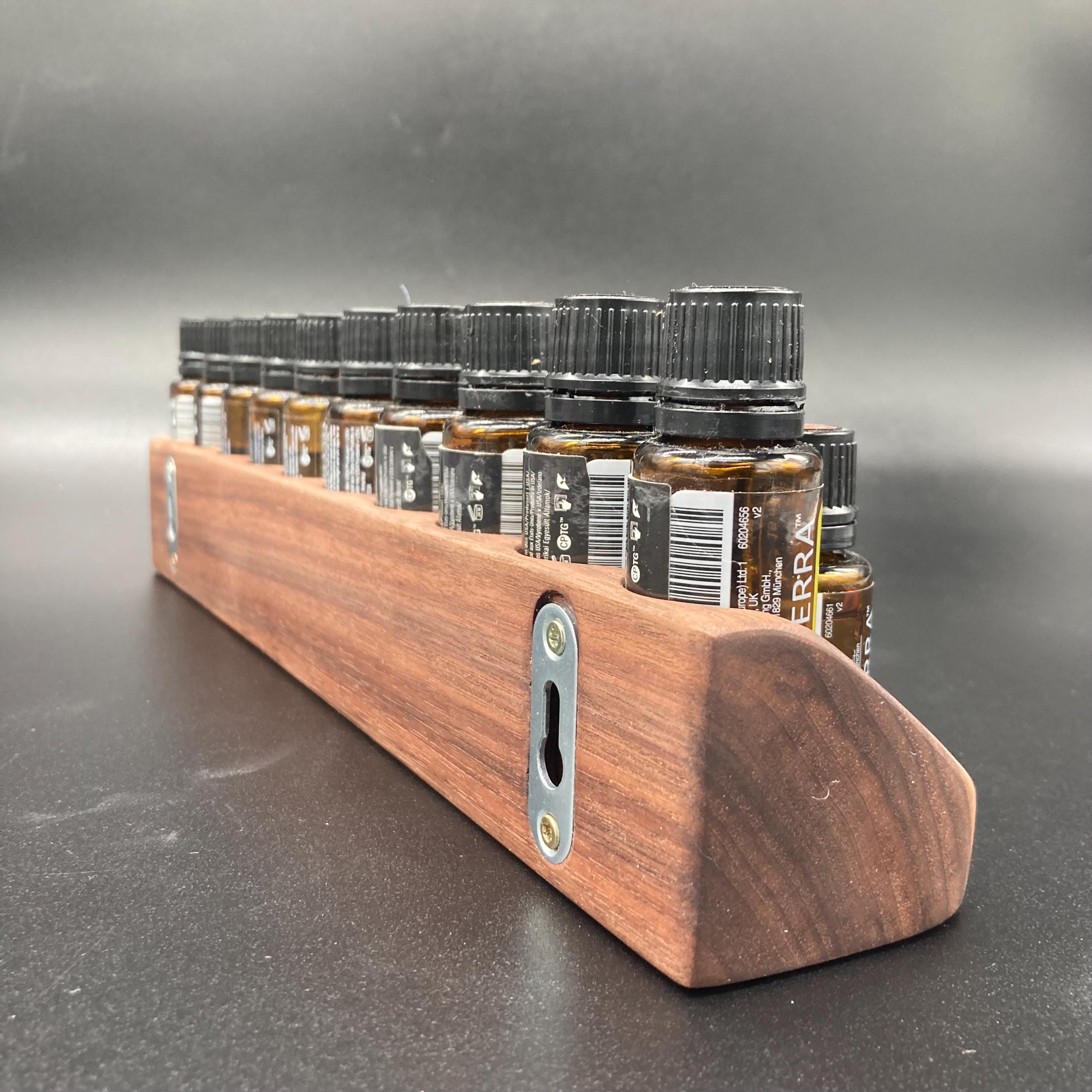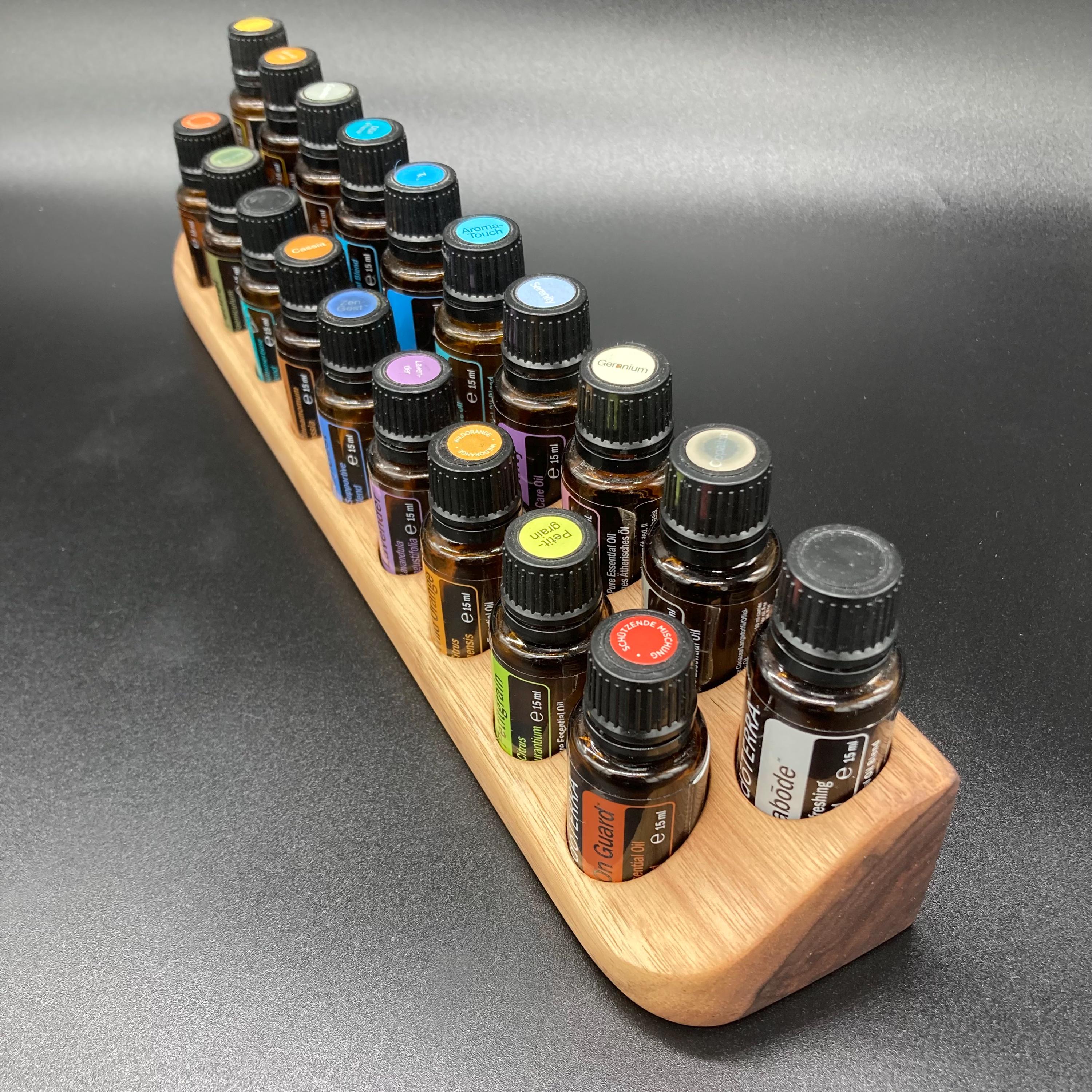 Oil display made of walnut wood for 15ml bottles, as a stand or wall mount.