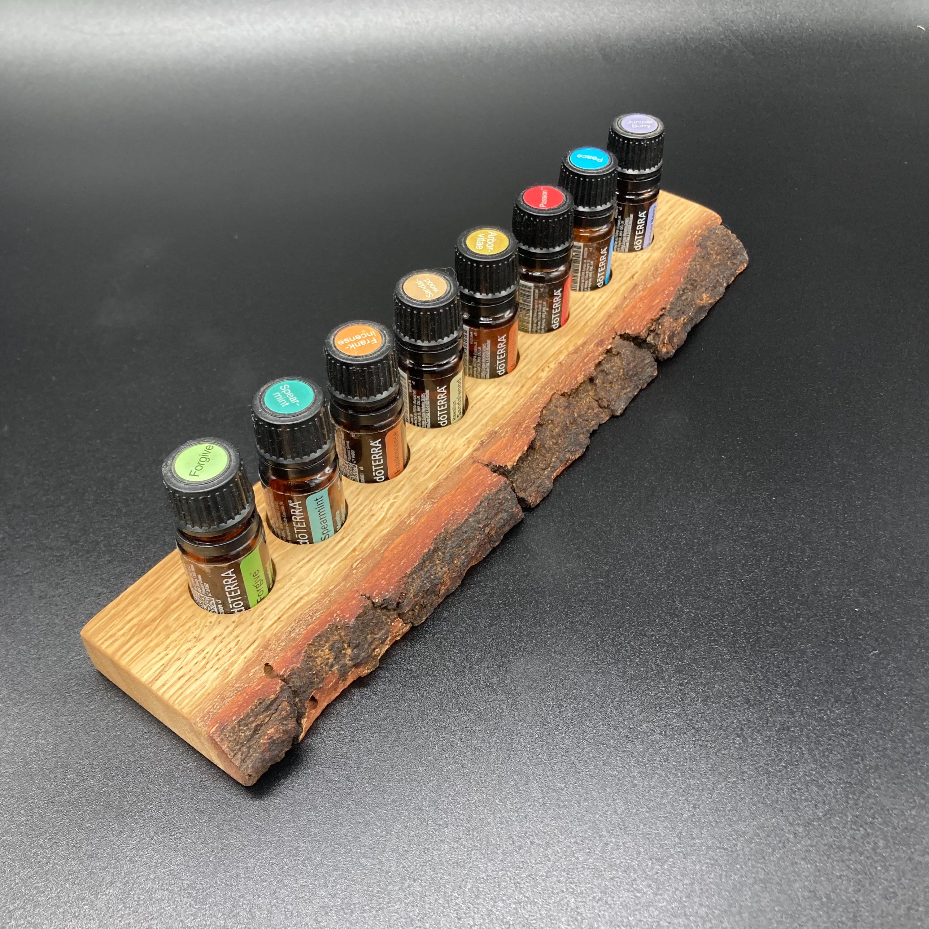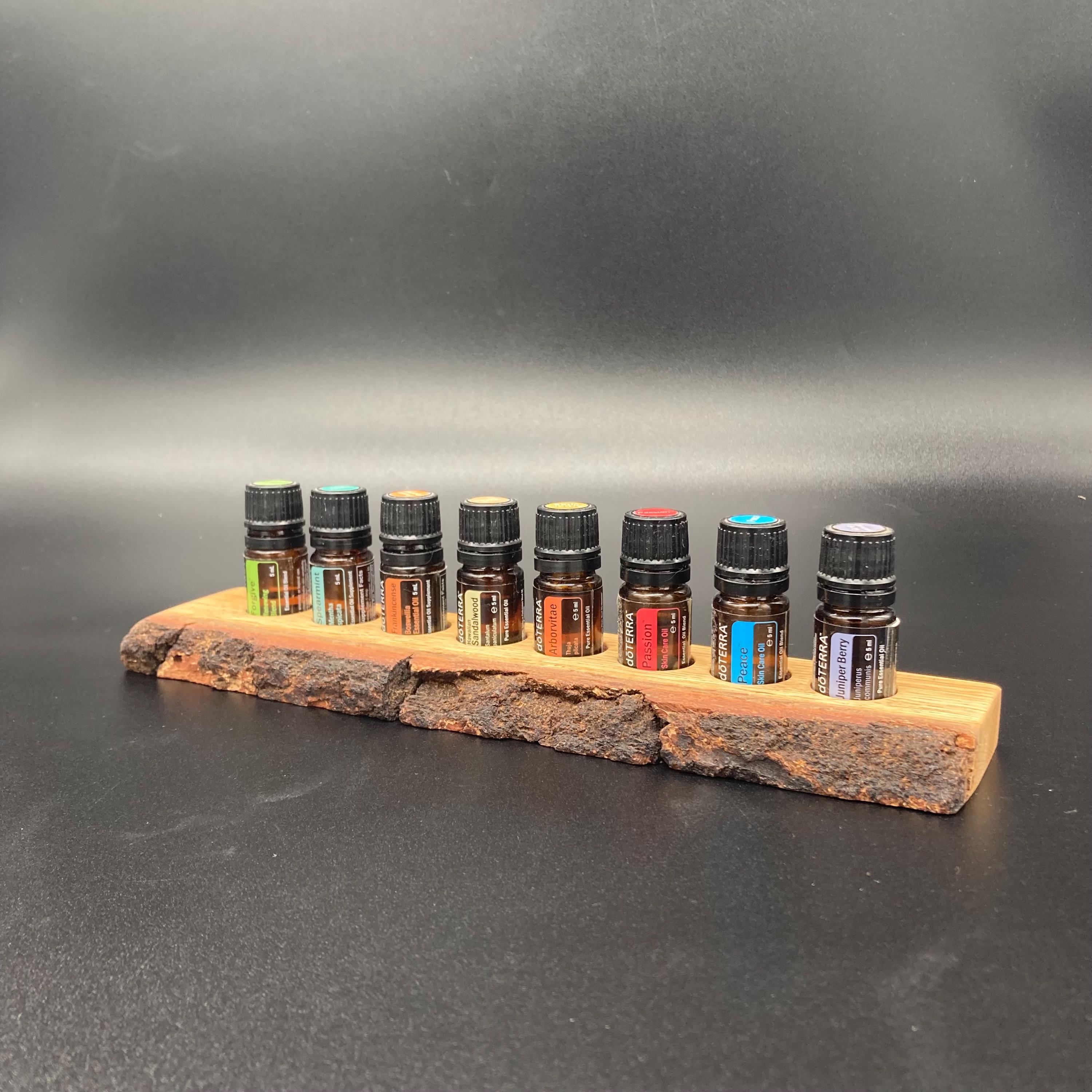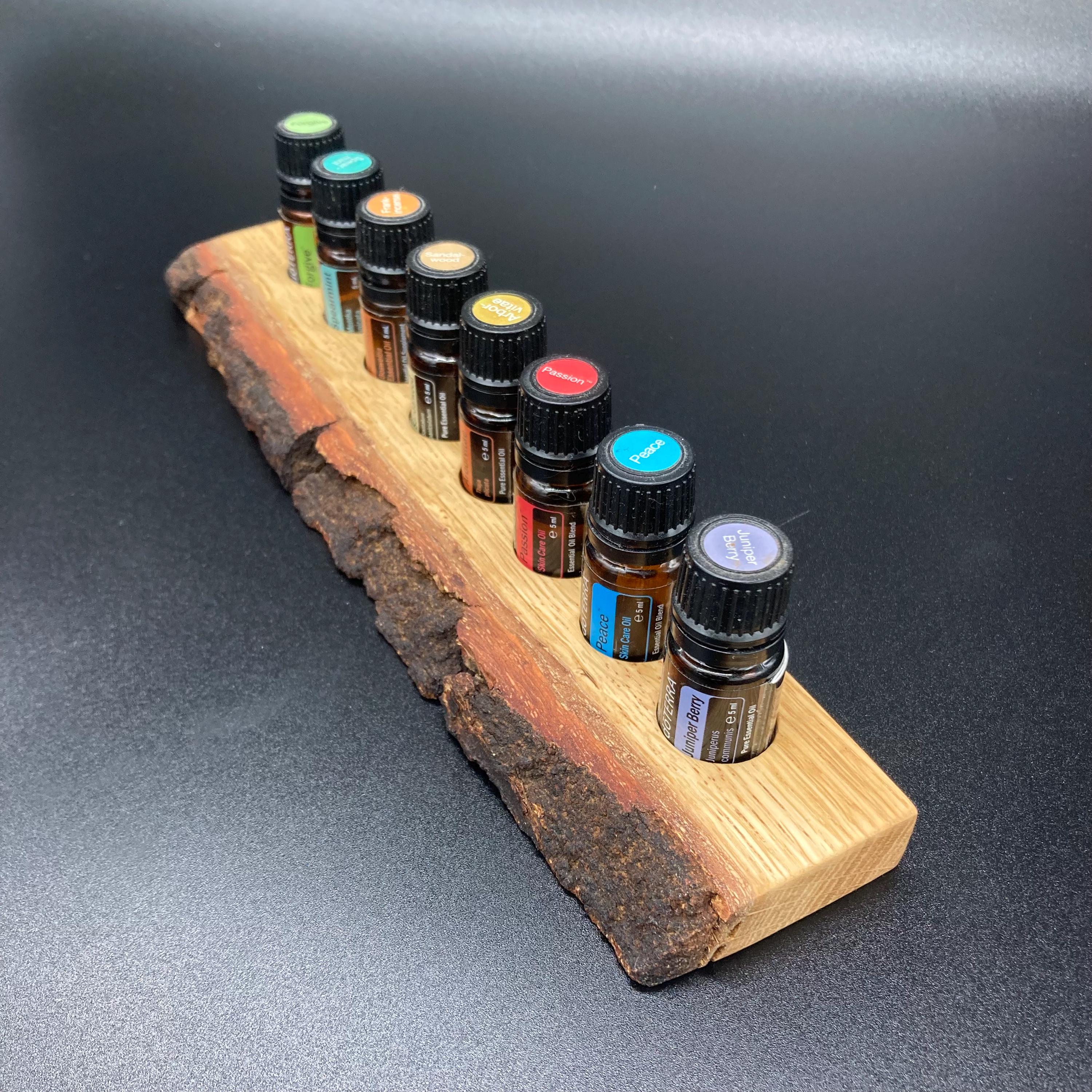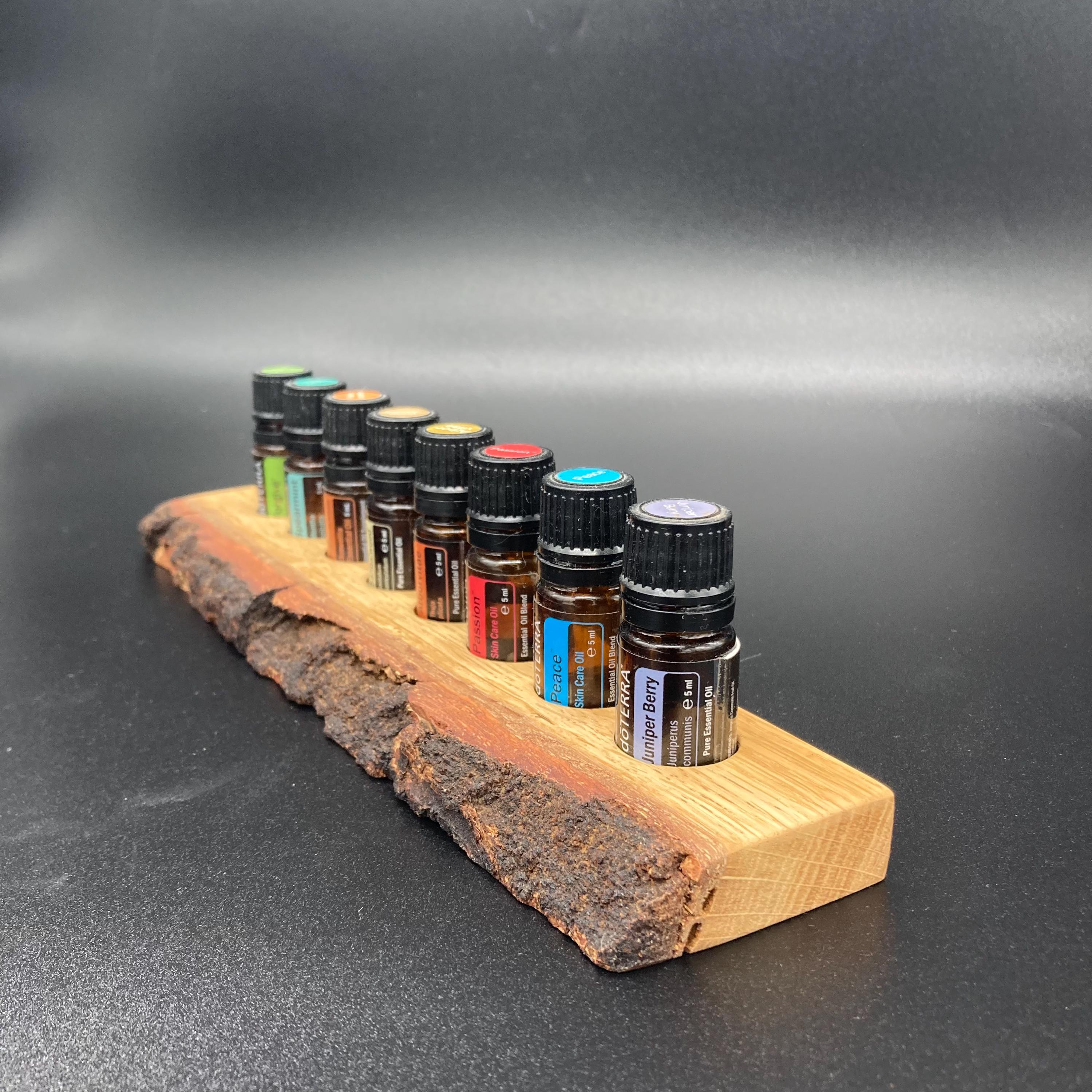 This display is ideal for anyone using 5ml bottled oils. It holds eight oil bottles (23mm diameter), with a 24mm hole. The oak wood retains its natural bark.
