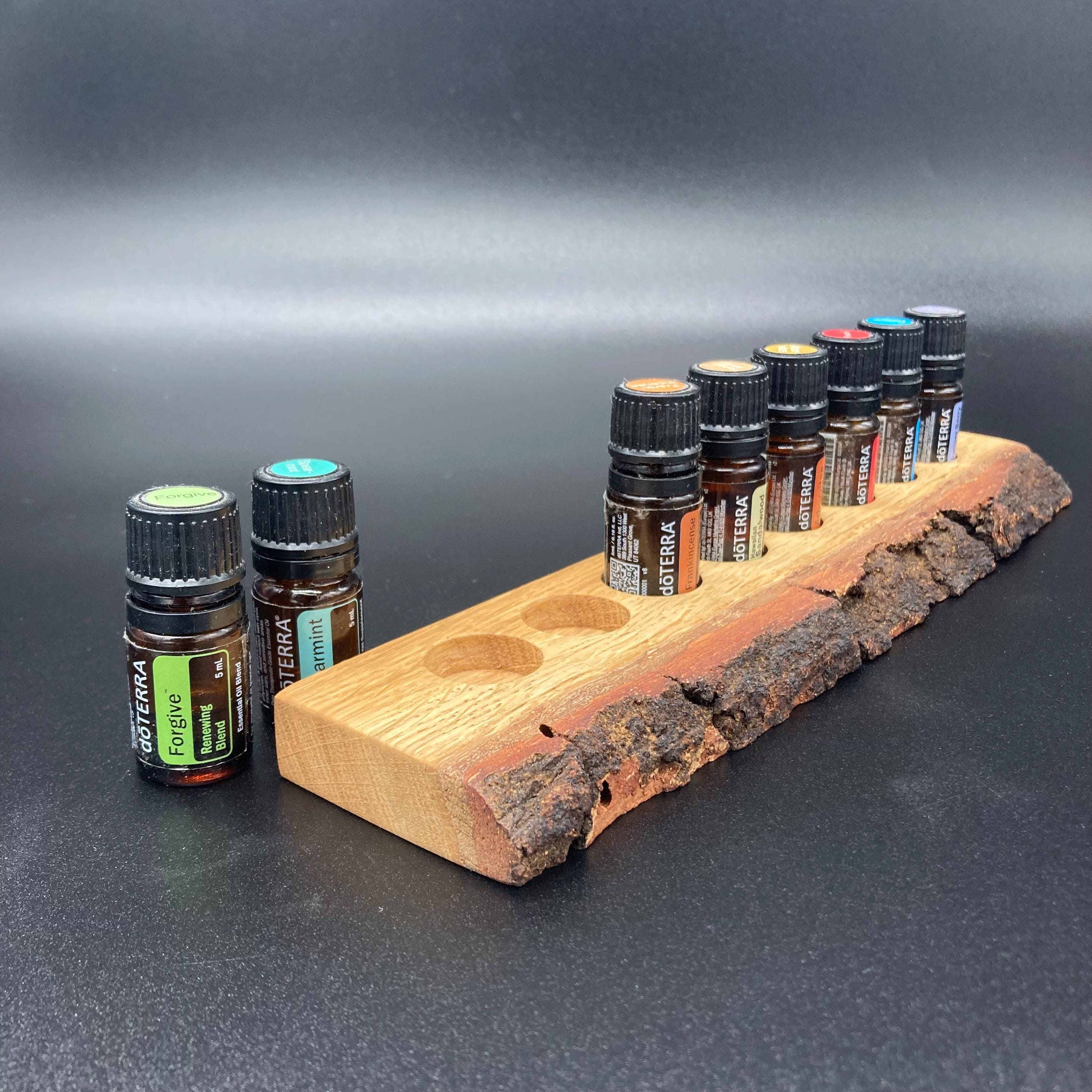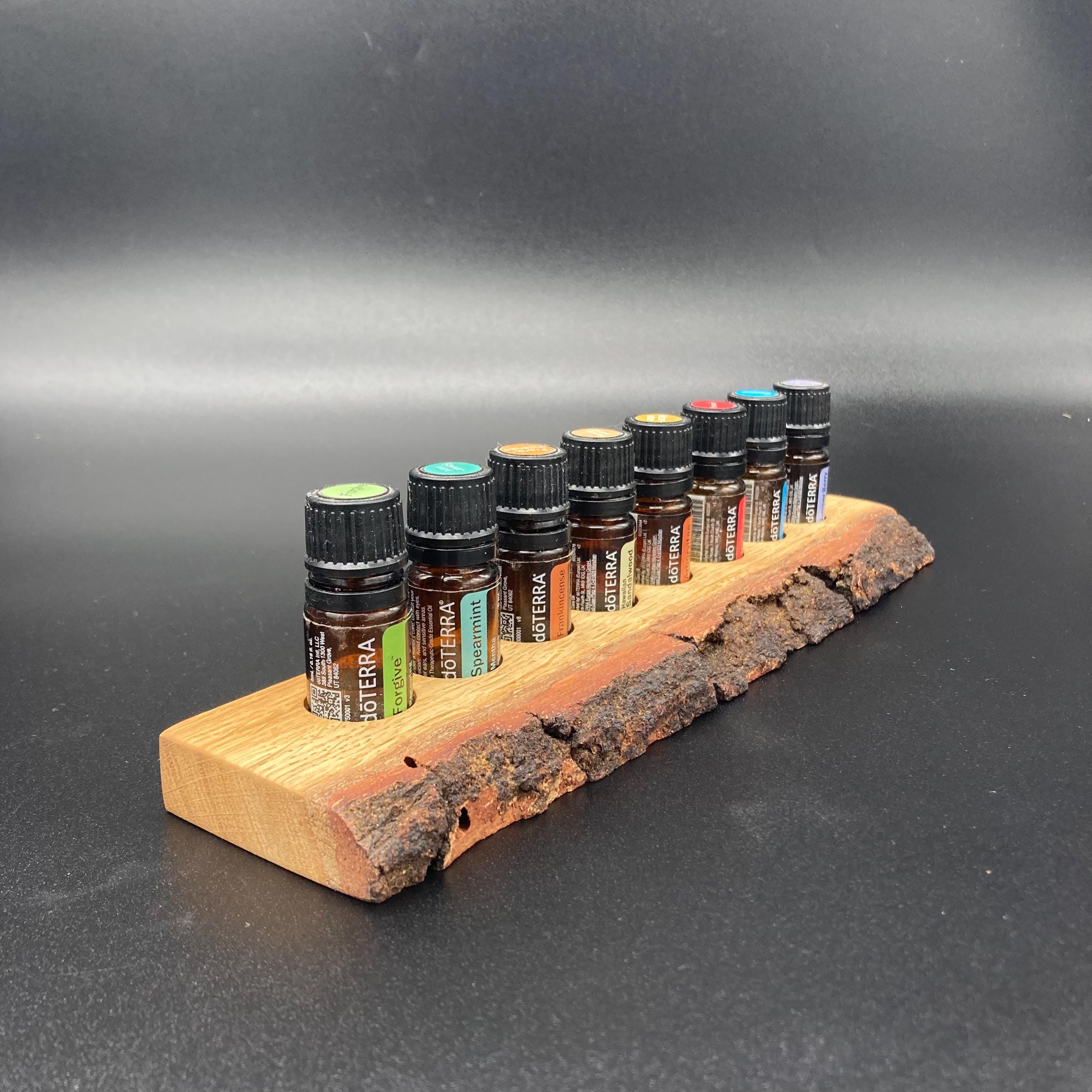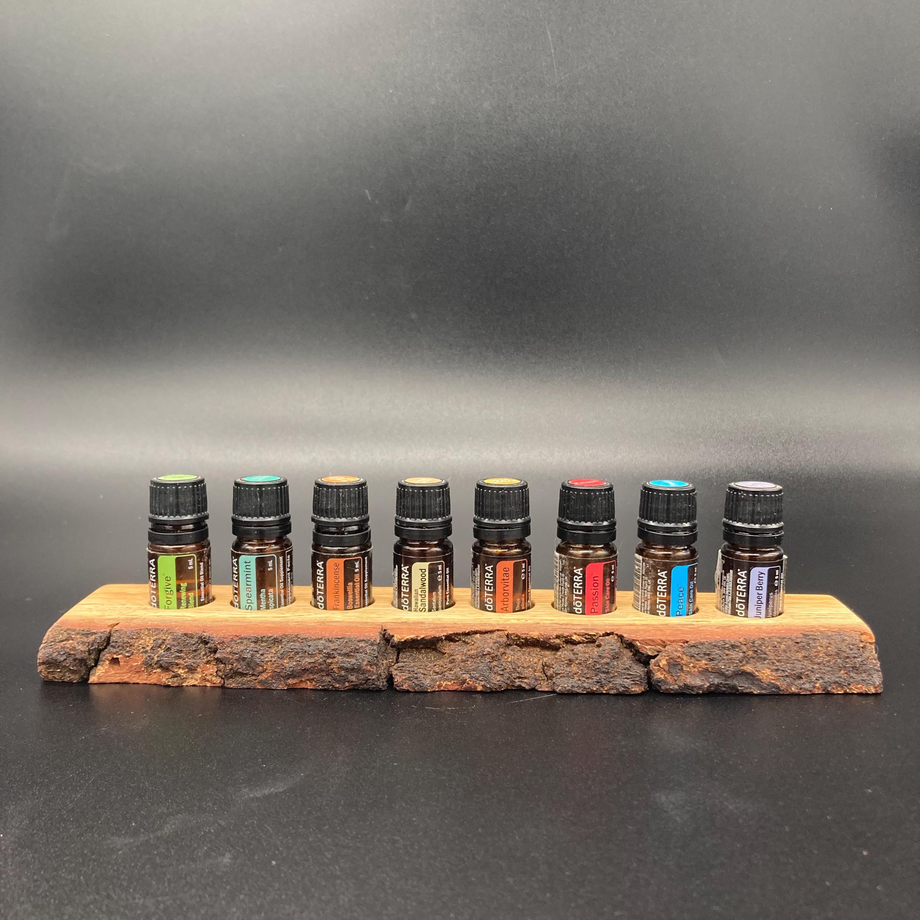 This display is ideal for anyone using 5ml bottled oils. It holds eight oil bottles (23mm diameter), with a 24mm hole. The oak wood retains its natural bark.