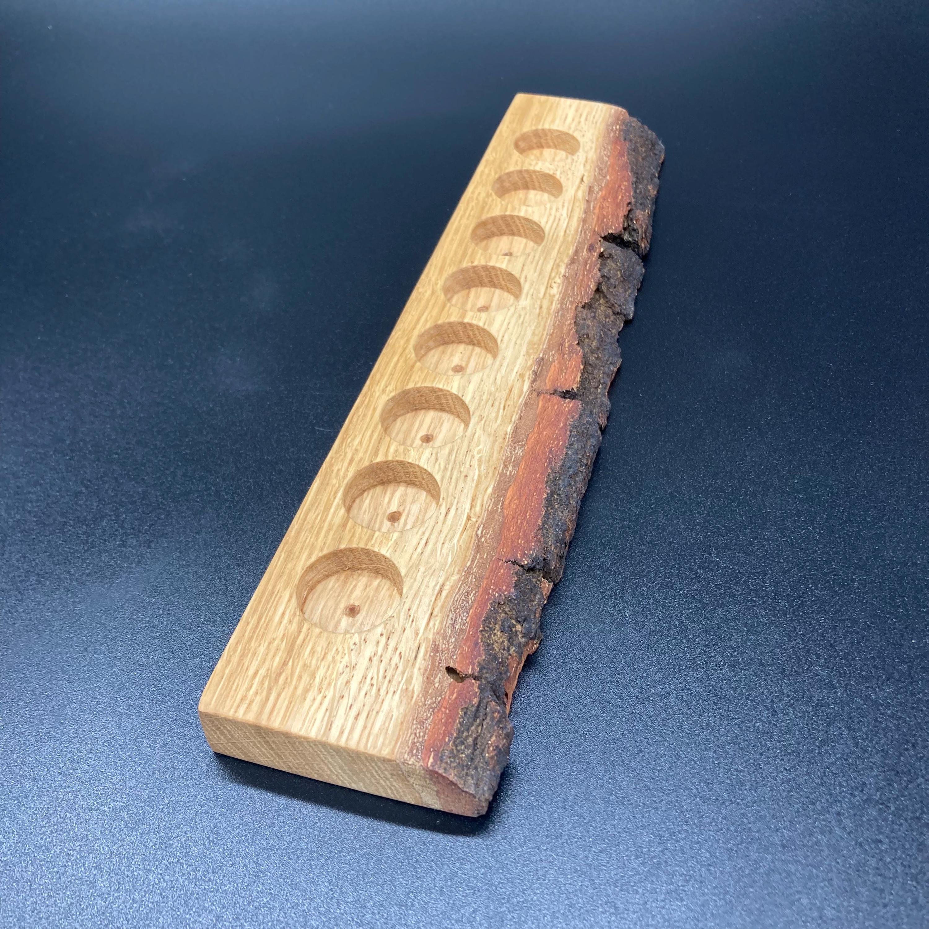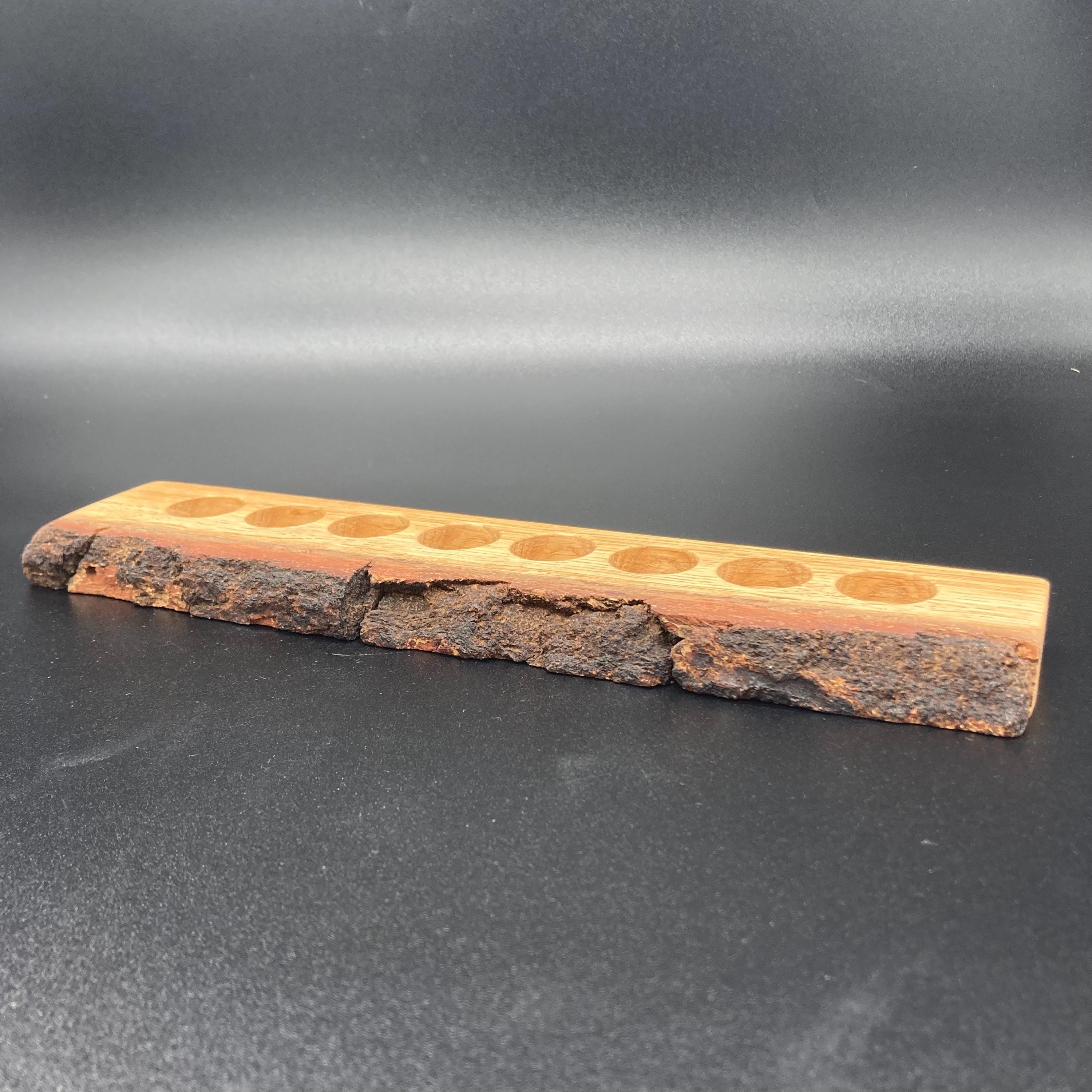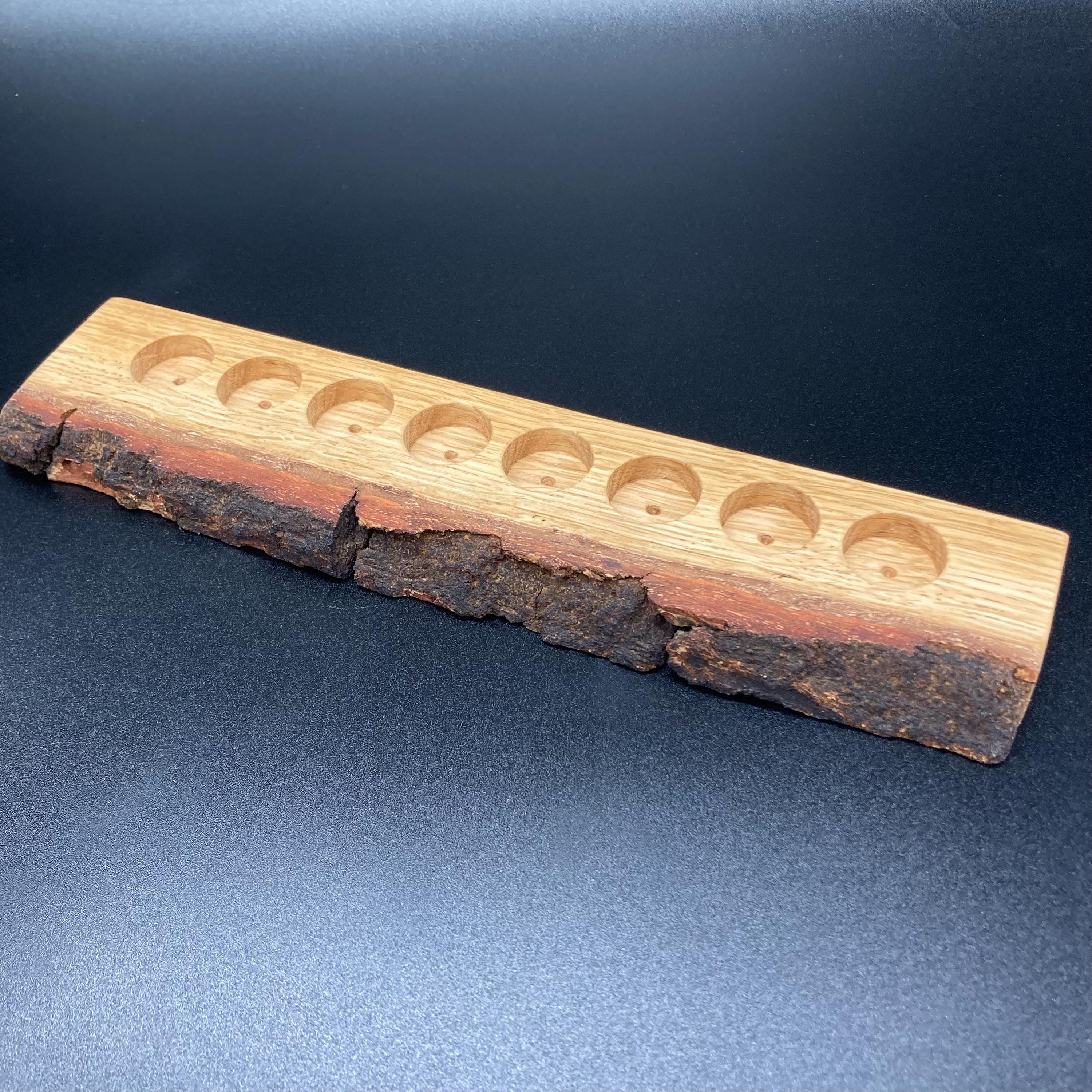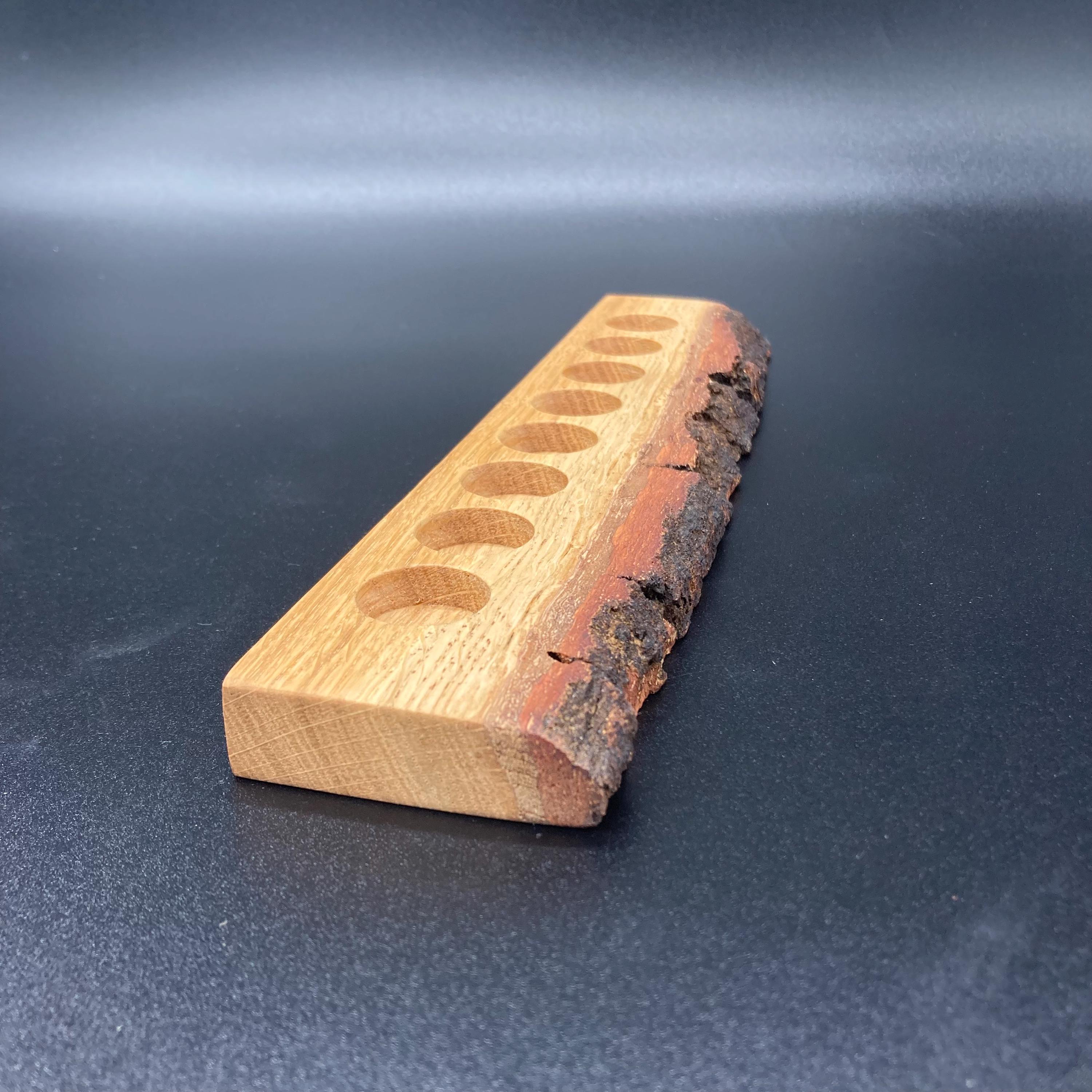 This display is ideal for anyone using 5ml bottled oils. It holds eight oil bottles (23mm diameter), with a 24mm hole. The oak wood retains its natural bark.