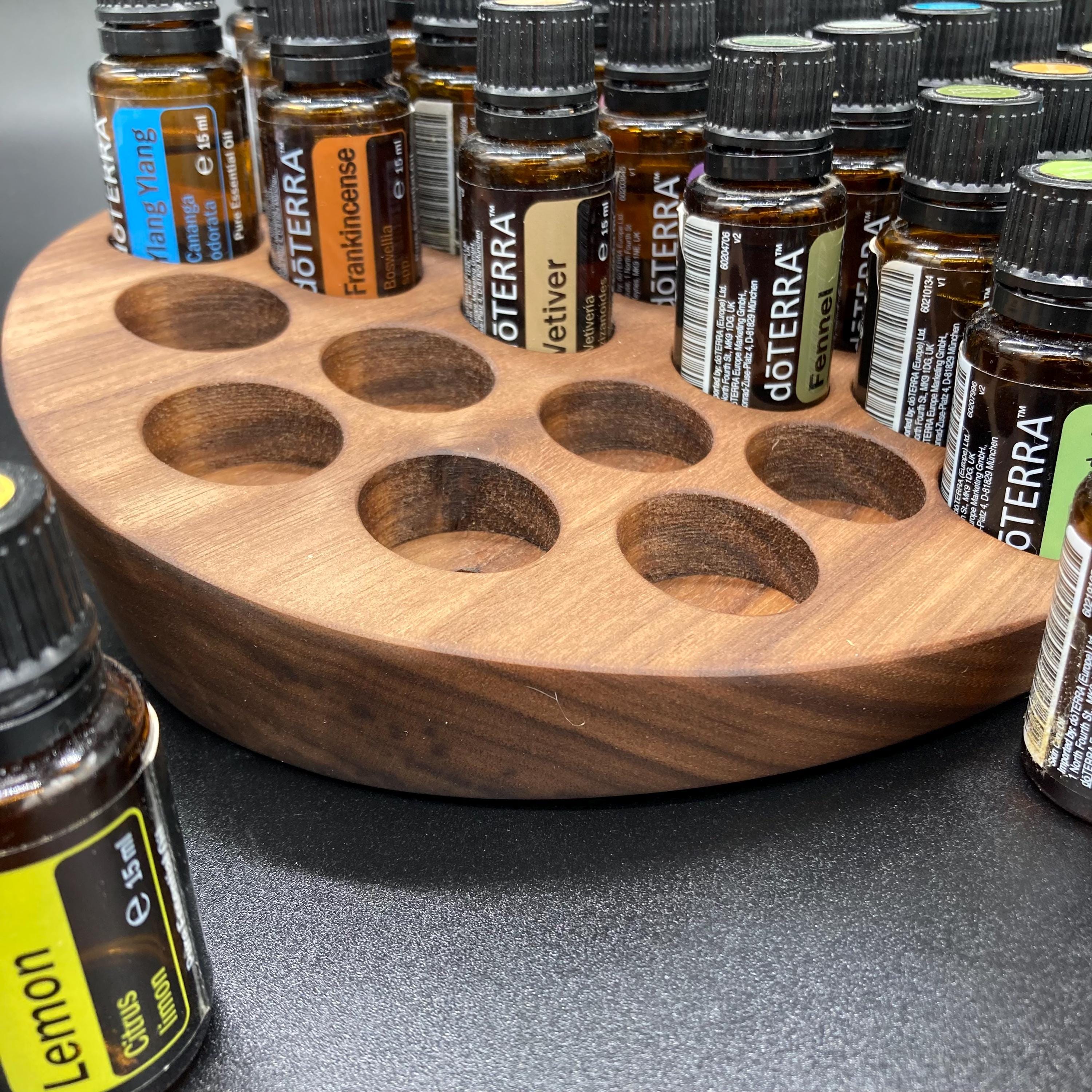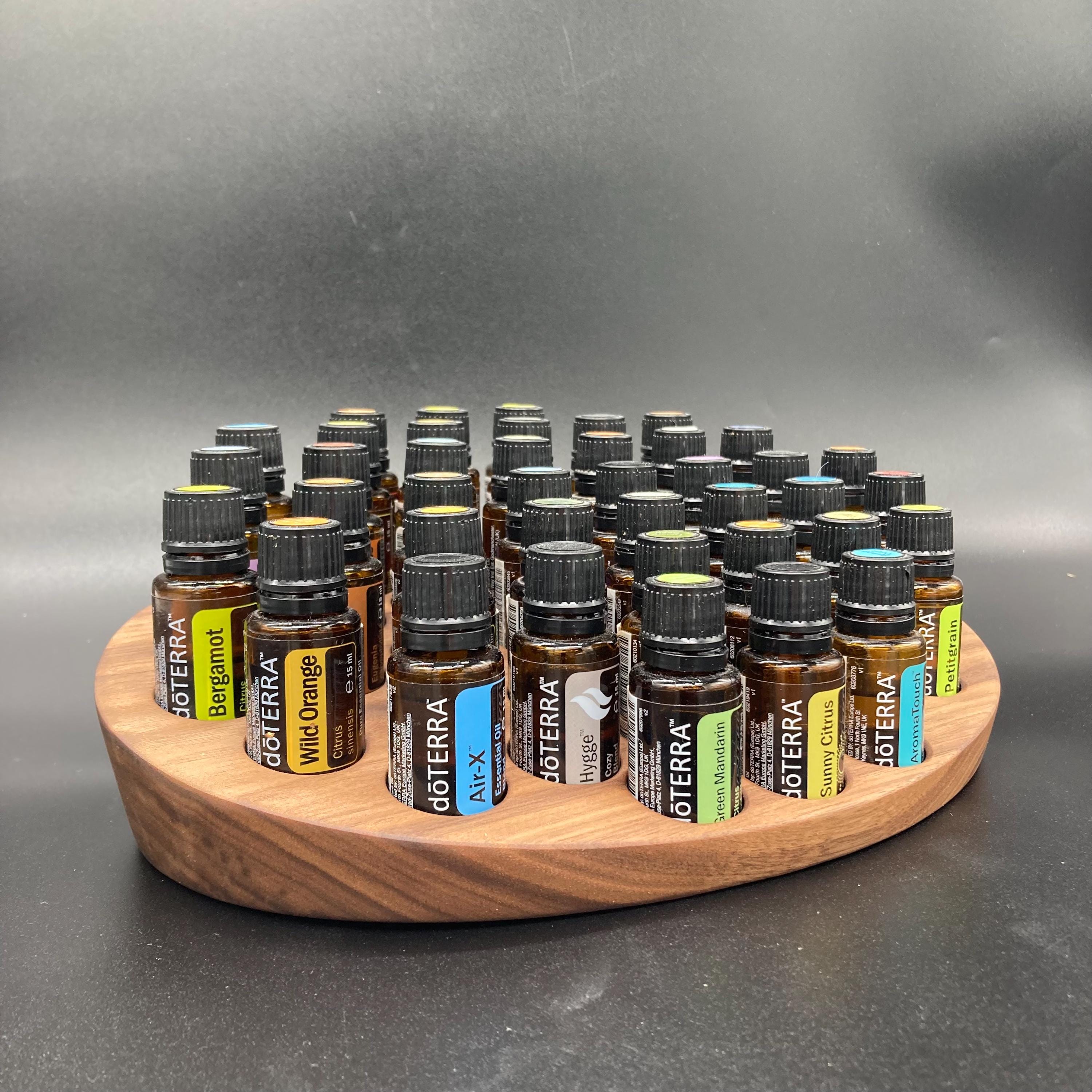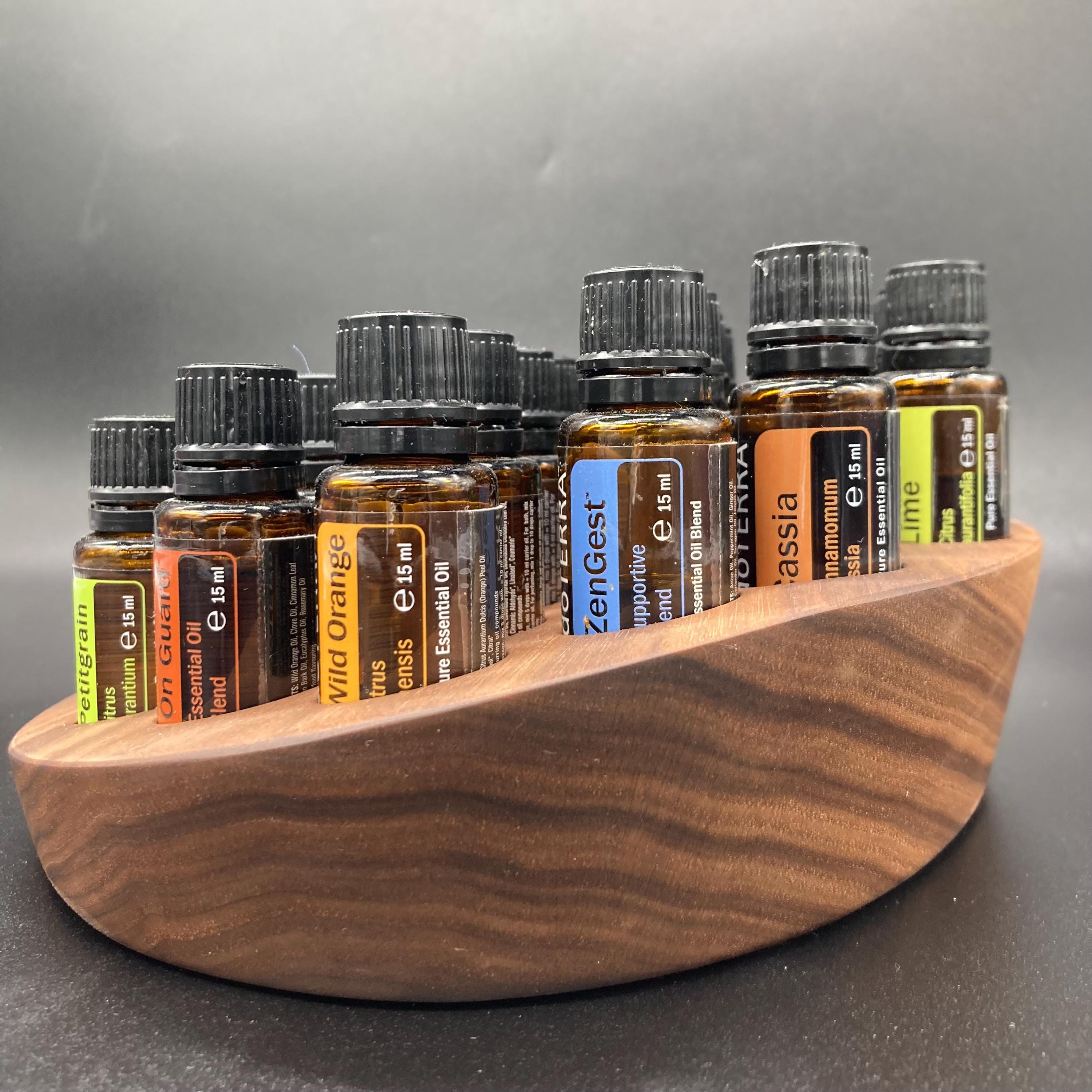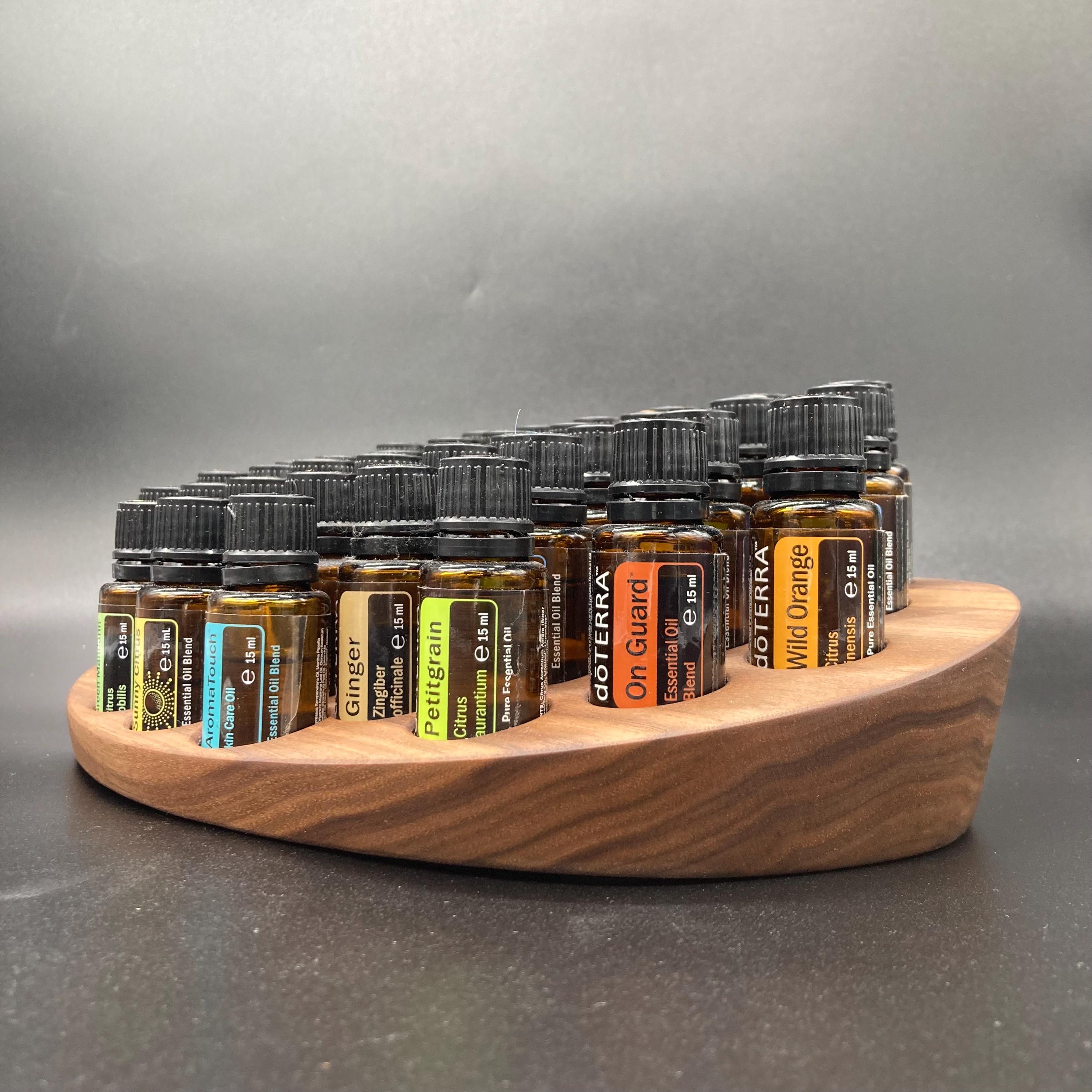 This display is ideal for all essential oils in 15ml bottles. It holds 40 oil bottles (28mm diameter). The staggered arrangement ensures that each label is easy to read. The front of the display is slightly angled, improving handling and visibility, and also giving it a very chic and elegant look.