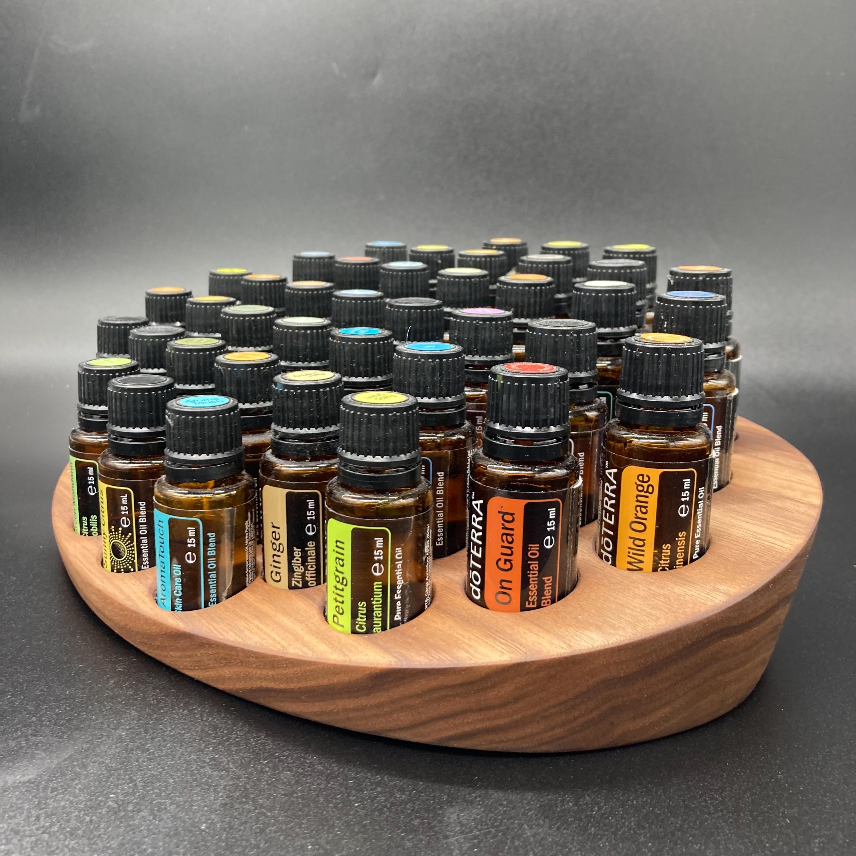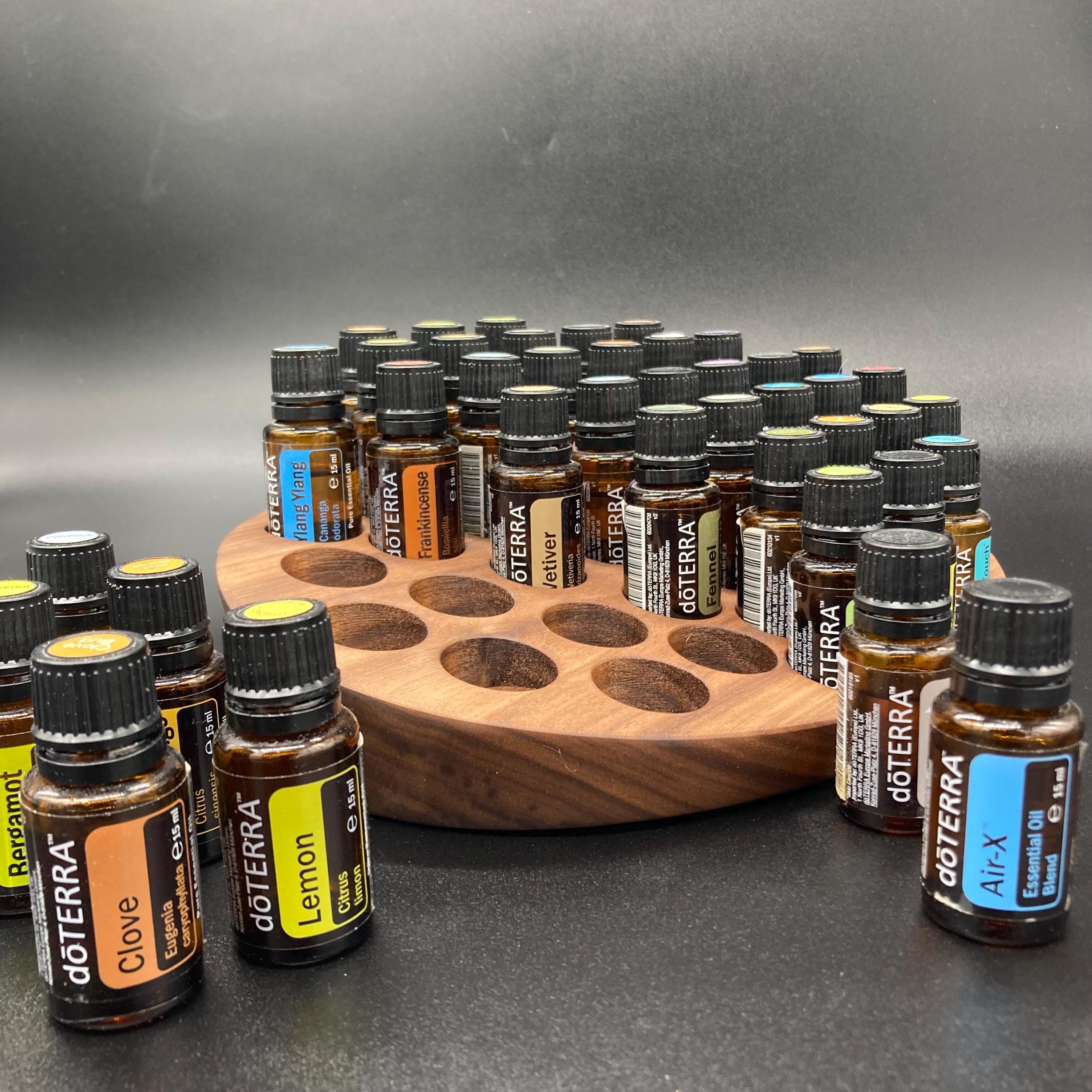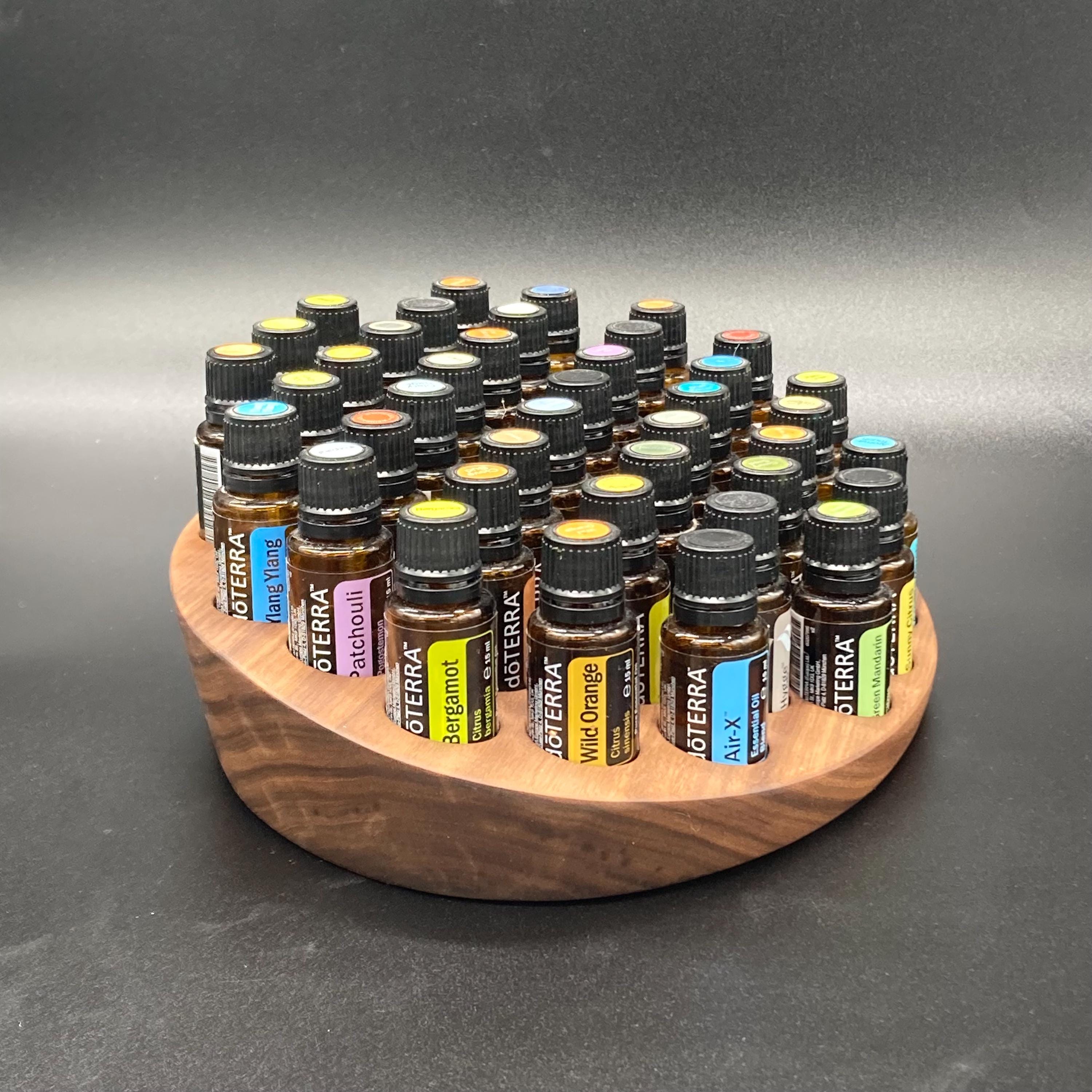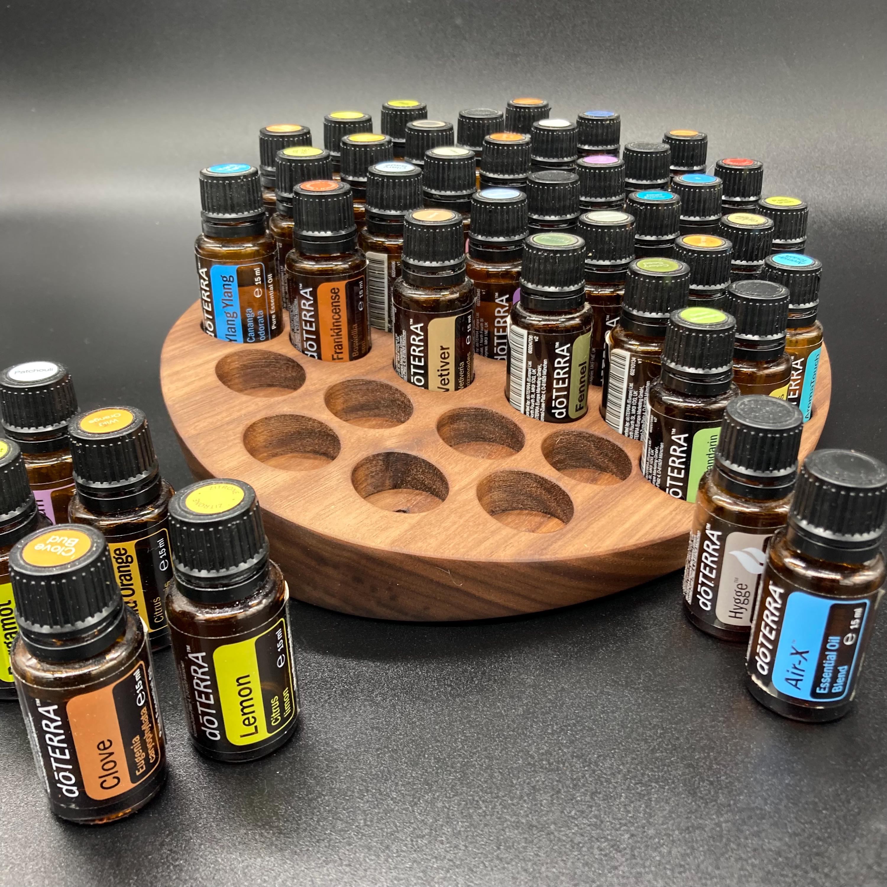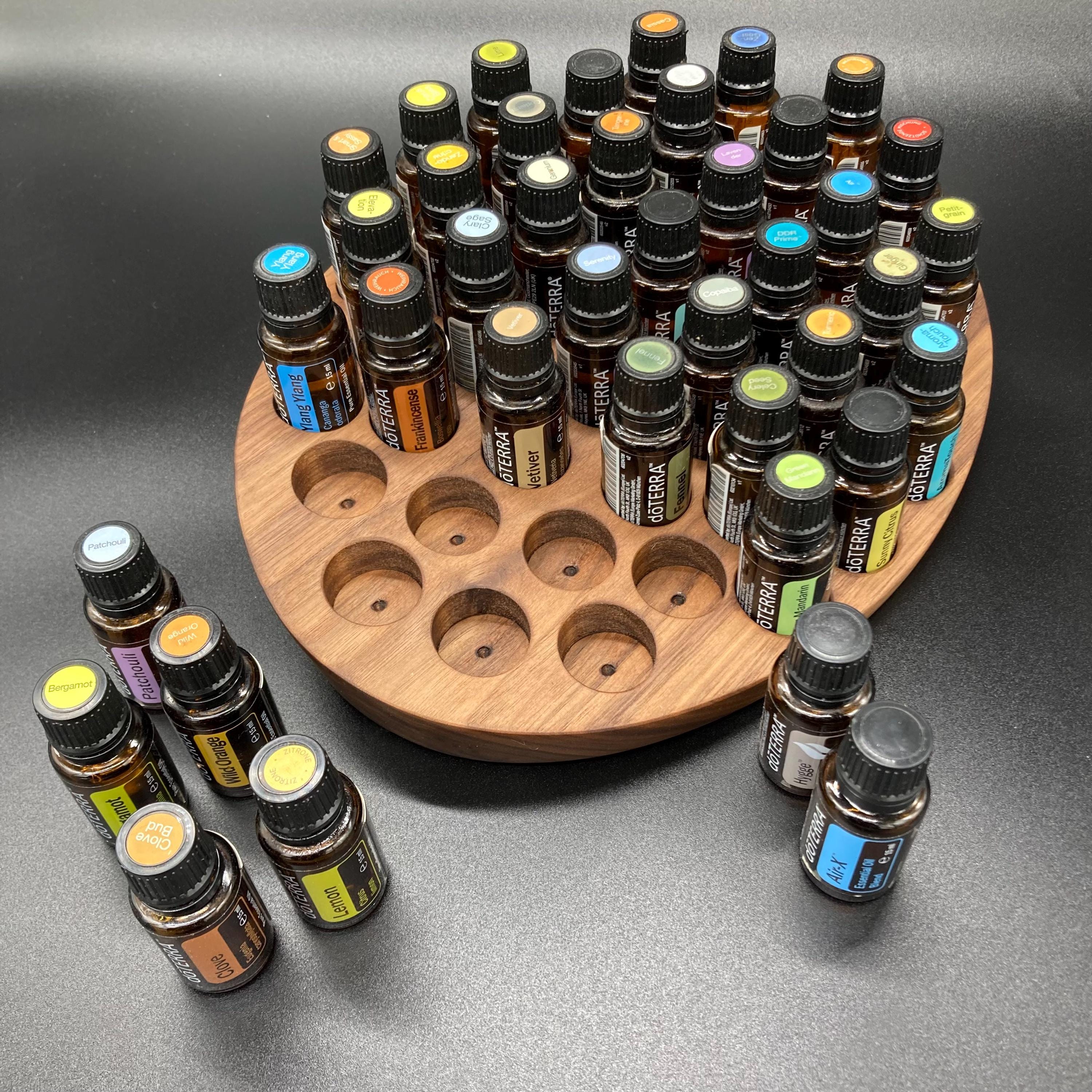 This display is ideal for all essential oils in 15ml bottles. It holds 40 oil bottles (28mm diameter). The staggered arrangement ensures that each label is easy to read. The front of the display is slightly angled, improving handling and visibility, and also giving it a very chic and elegant look.